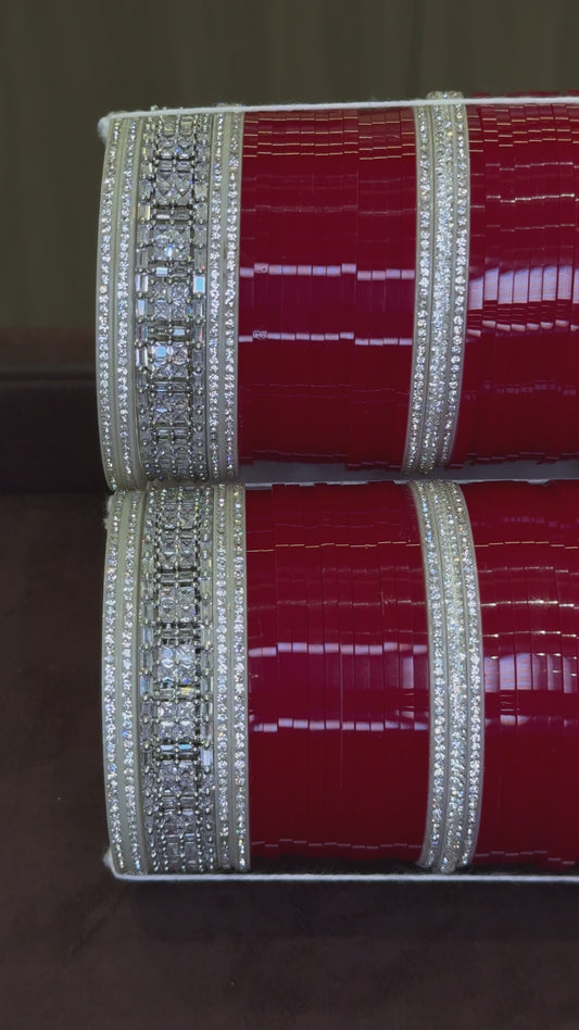 Bridal Red Traditonal chuda set with cubic zirconia stone kadas, Indian wedding jewelry, Punjabi wedding