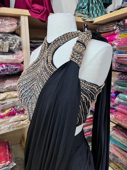 Solid Black Pre-Stitched Saree W/ Readymade Blouse PSS-47