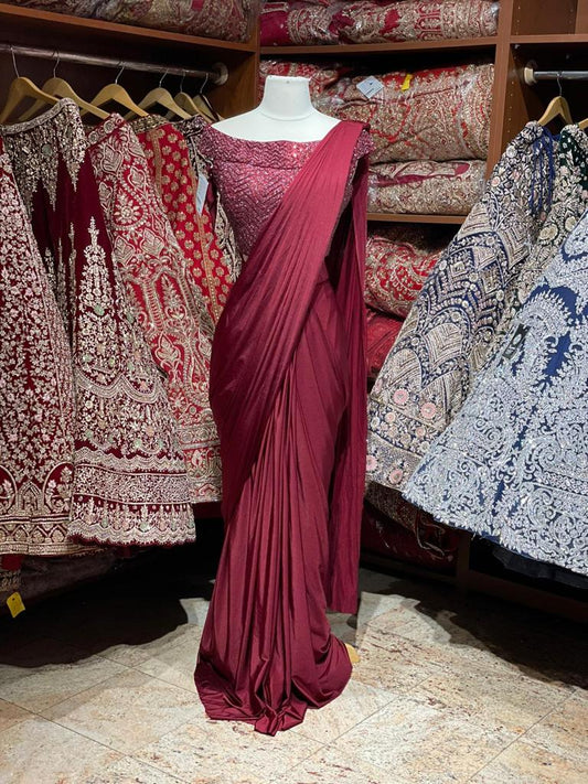 Rosewood Red Pre-Stitched Saree W/ Readymade Blouse PSS-40