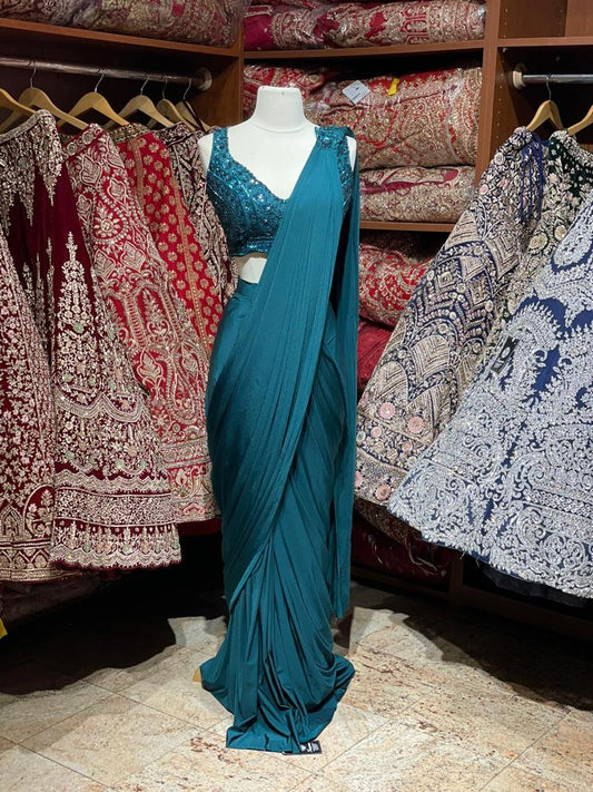 Teal Green Pre-Stitched Saree W/ Readymade Blouse PSS-38