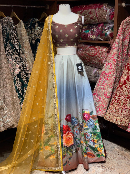 Brown & Grey Digital Printed Party Wear Lehenga PWL-076