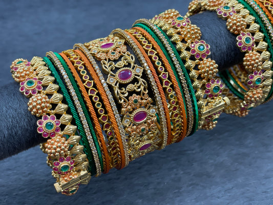 South Indian Traditional Temple Bangle Set with Ruby and Emerald Accents, Size 2.6