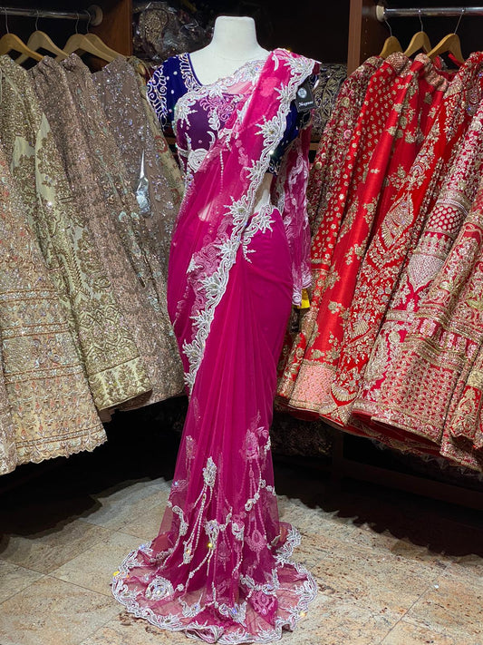 Magenta Pink Net Saree W/ Readymade Blouse PWS-006