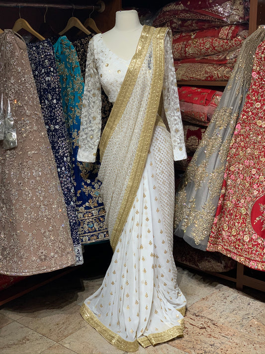 White Pre-Stitched Saree W/ Readymade Blouse PSS-19