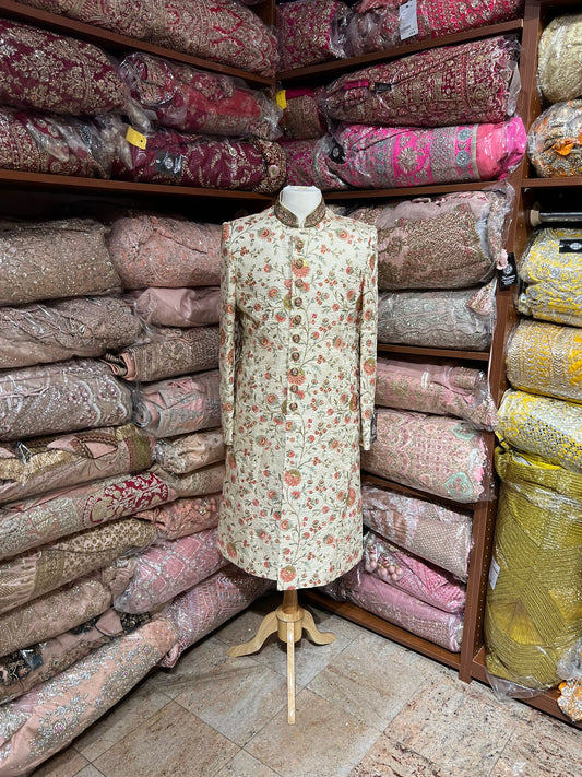 Linen Cream Multi Resham Embroidered Sherwani-S13-71