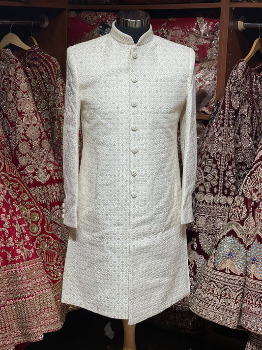 Pearl White Thread Embroidered Sherwani- R14-N85