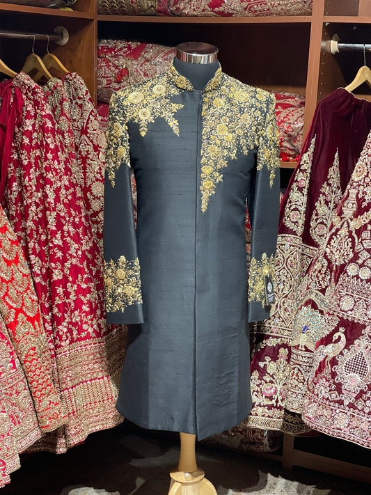 Slate Grey Thread Embroidered Sherwani- 1263