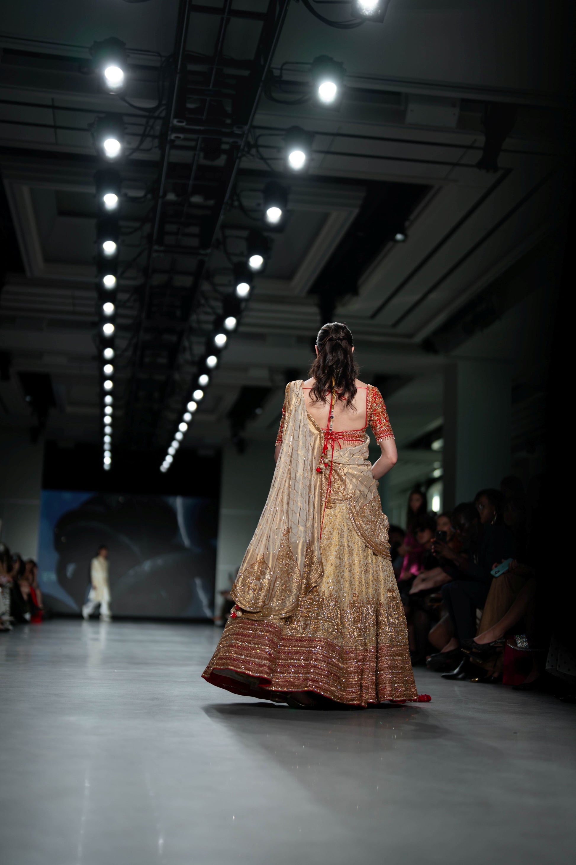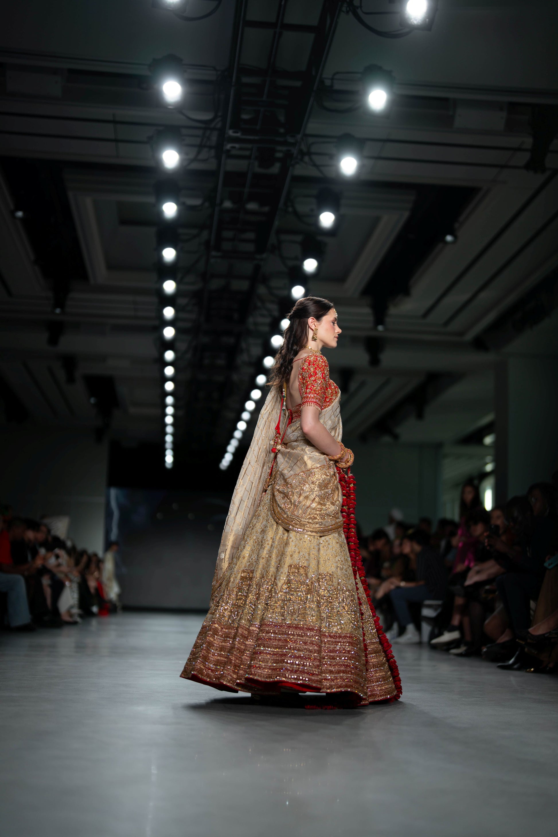 Tirupati Balaji, known as one of the richest temples in the world, inspired this piece. We chose an ivory and gold brocade fabric to reflect its opulence, outlining the motifs with embroidery and enhancing them with intricate gold handwork. To complete the design, we added a pure silk red border, symbolizing auspiciousness.