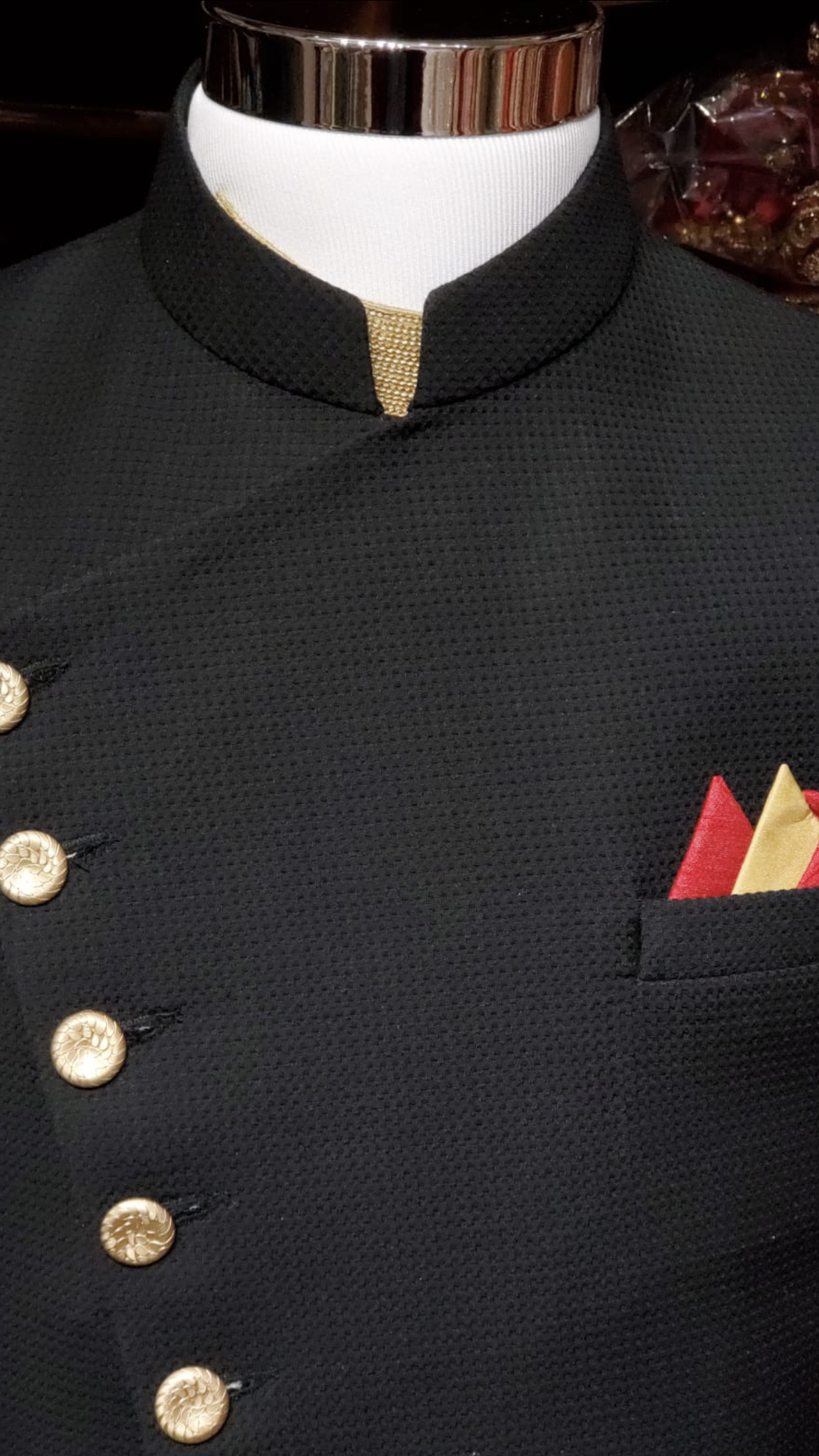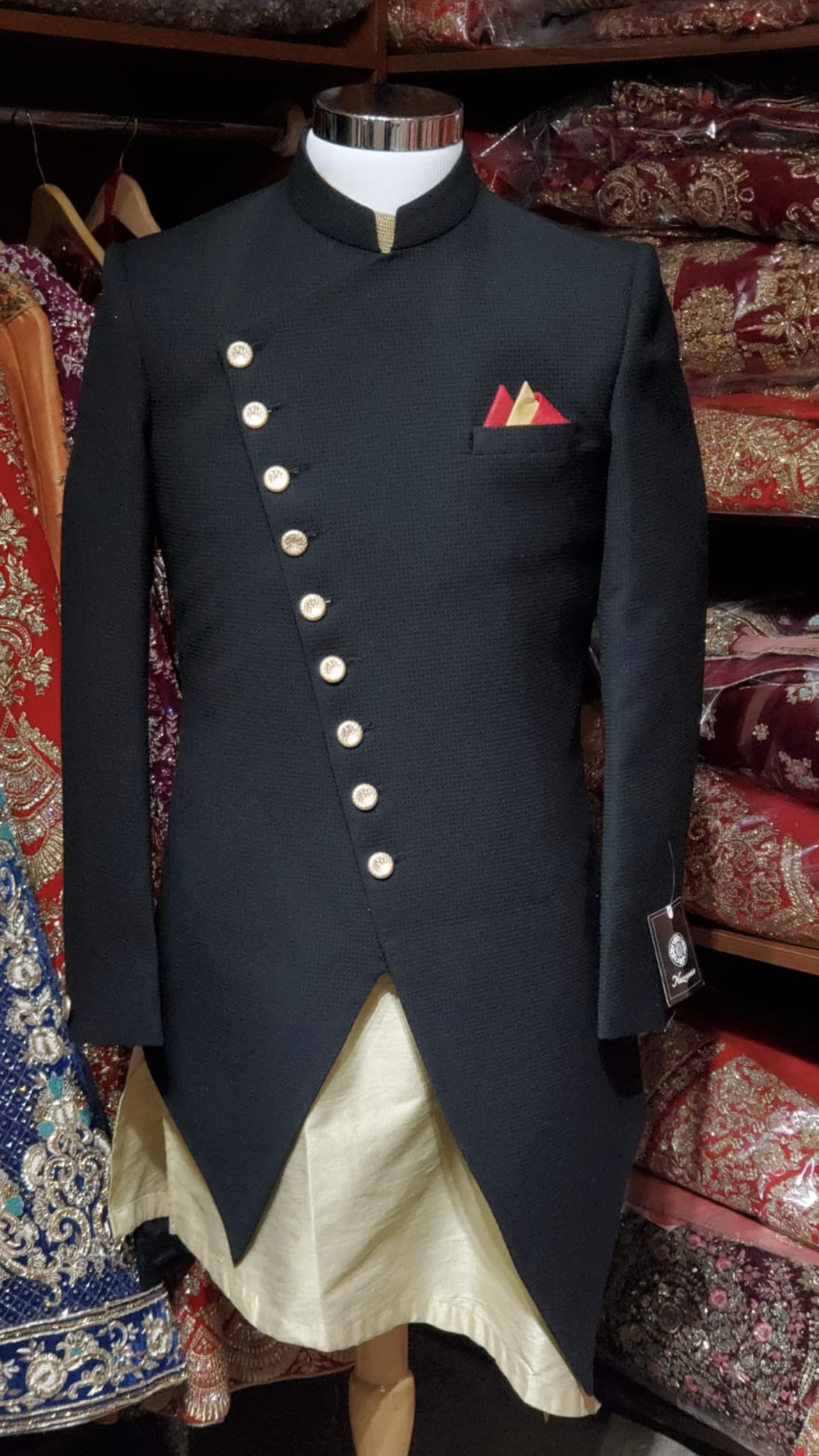 Black asymmetric sherwani with gold raw silk kurta and gold chudidar. Accented with a red pocket square!
