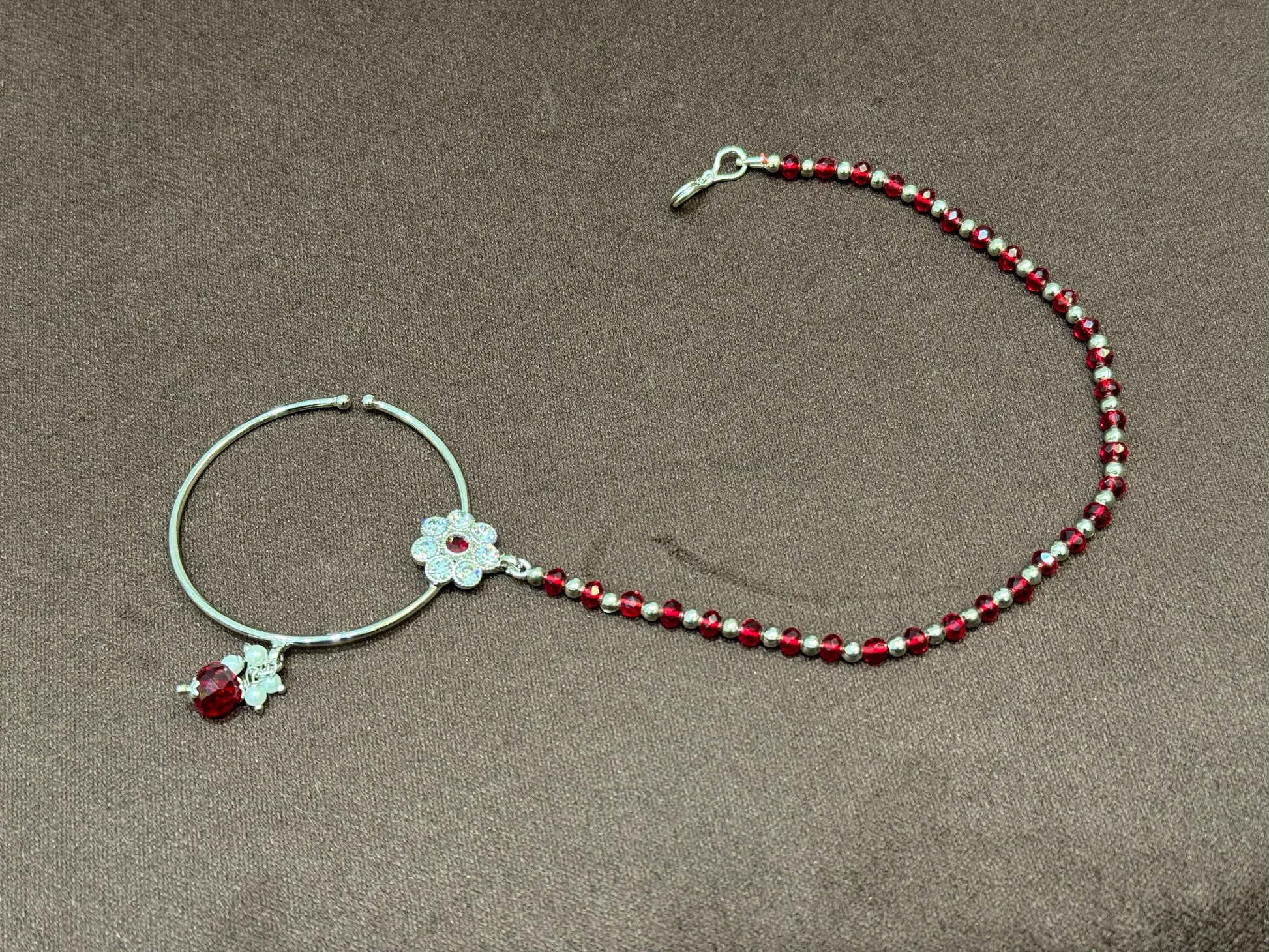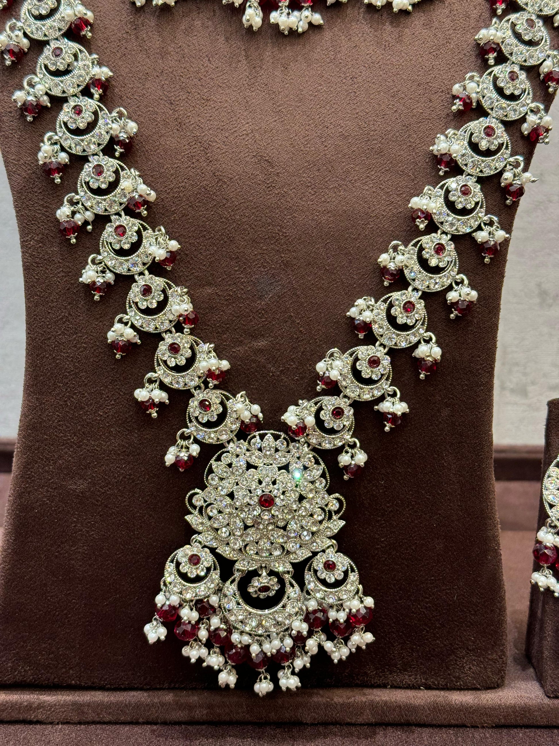 Indulge in the opulence of our Bridal Jewelry JS-42. This handcrafted design boasts a shimmering silver Ryan stone, elegantly accented with rich maroon beads. Add an air of luxury and sophistication to your special day. Elevate your bridal style with this exquisite piece.