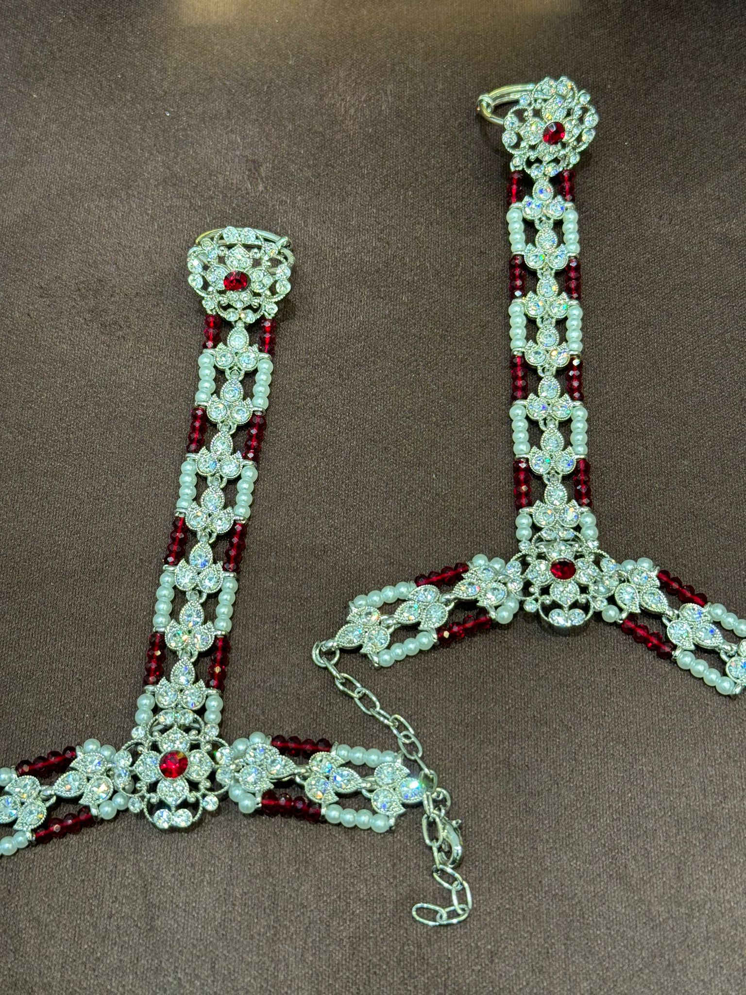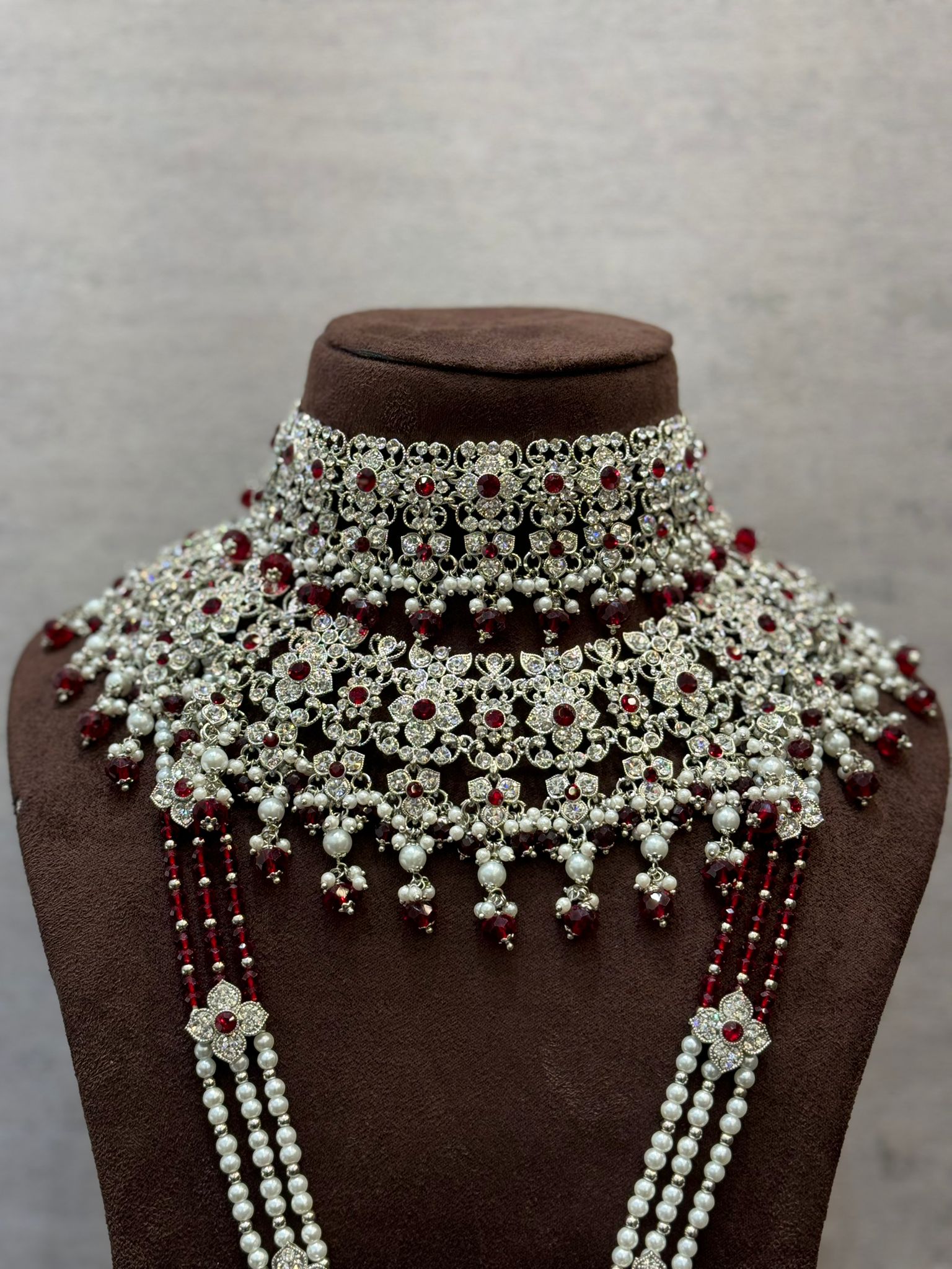 Introducing Bridal Jewelry JS-43, an exquisite silver necklace adorned with Ryan stones, pearls, and maroon beads. Elevate your wedding attire with this luxurious piece, combining timeless elegance and sophisticated charm. This bridal necklace will be the perfect addition to your special day, making you feel like a true queen.