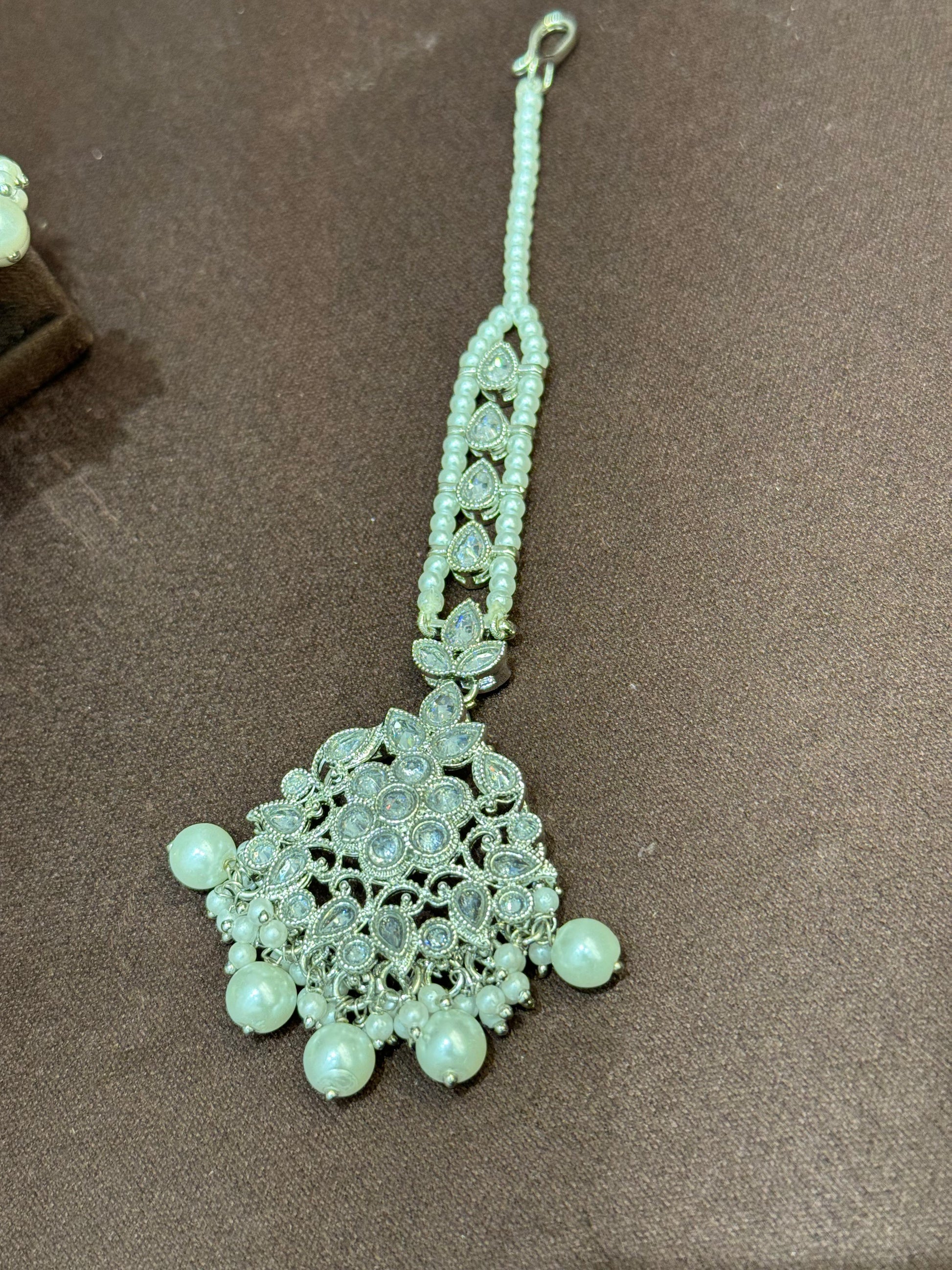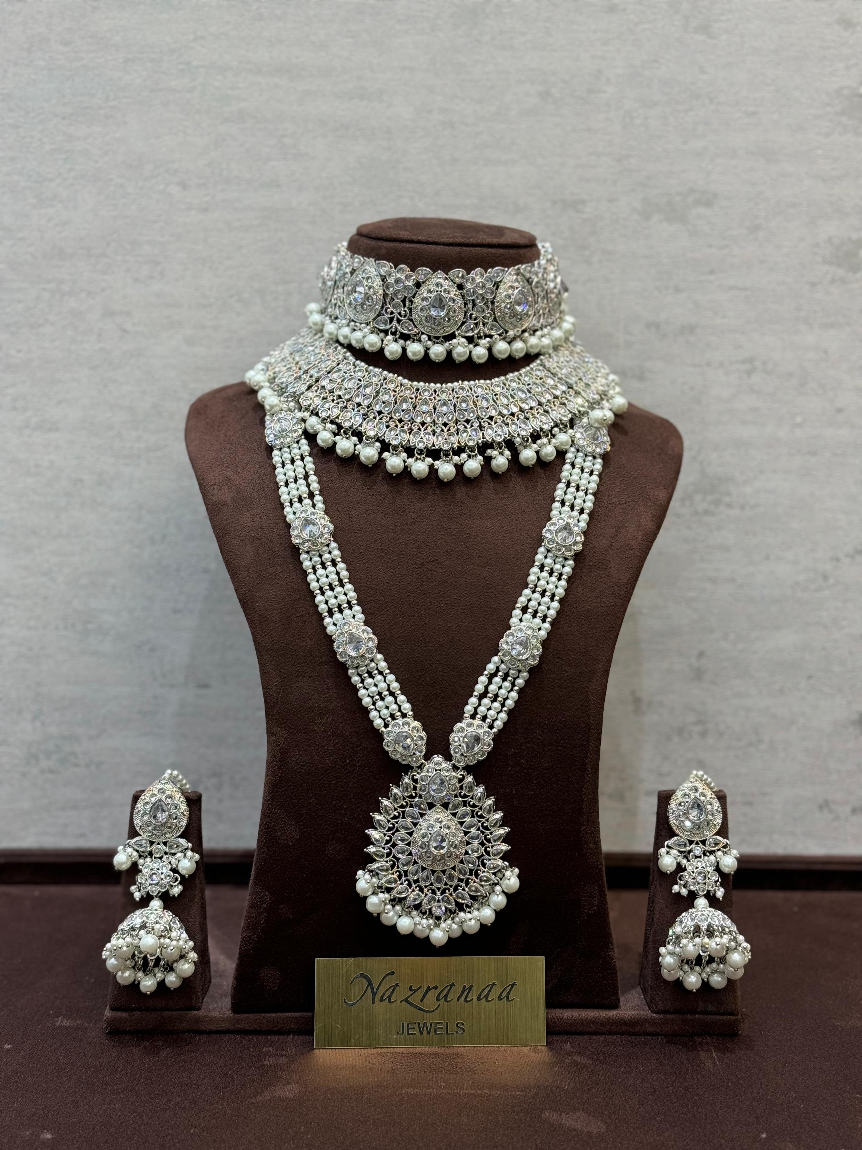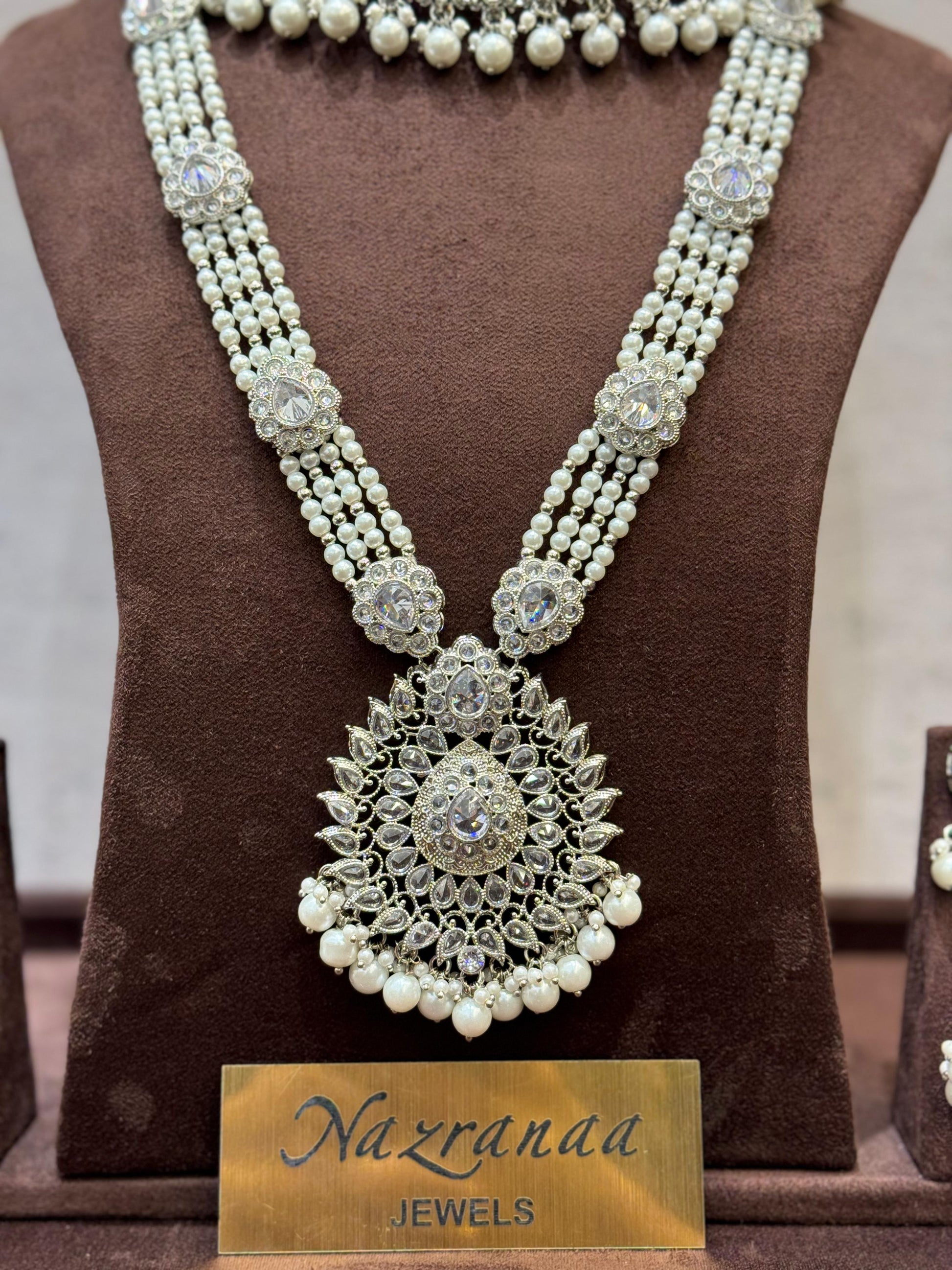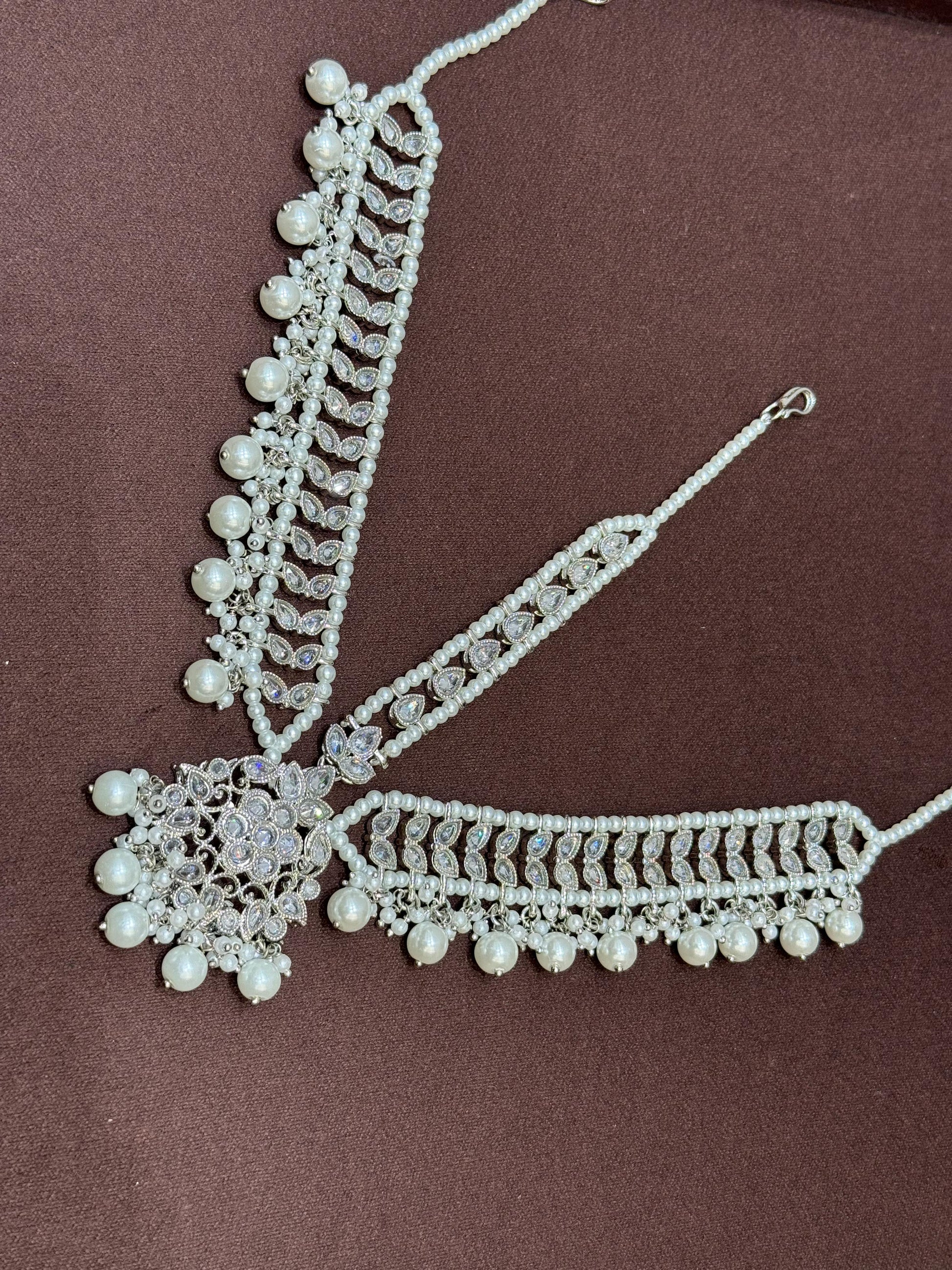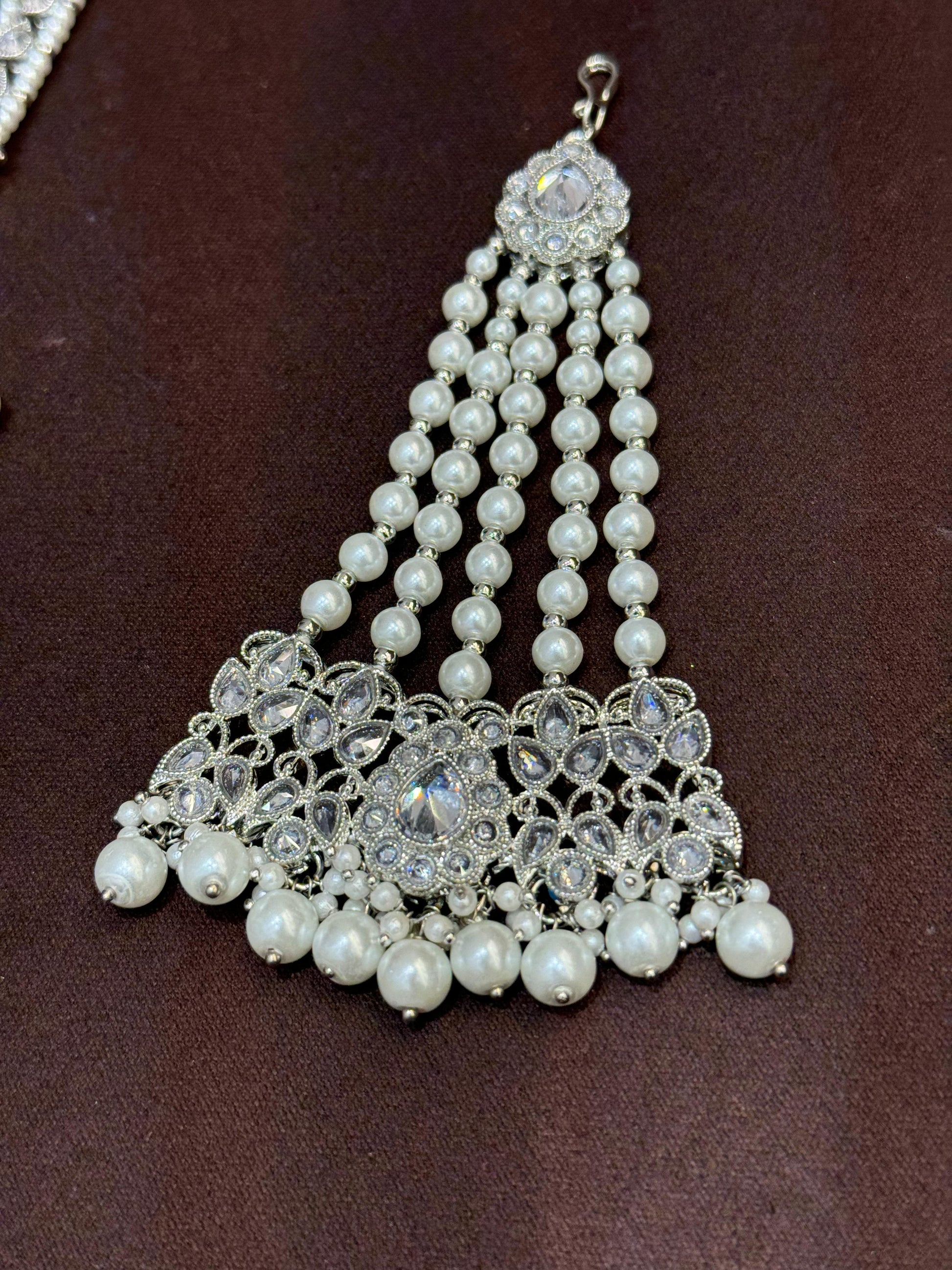 Enhance your bridal look with Bridal Jewelry JS-43. Adorned with stunning silver polki and lustrous white pearls, this exquisite piece exudes elegance and sophistication. Elevate your wedding ensemble with the perfect balance of tradition and luxury.