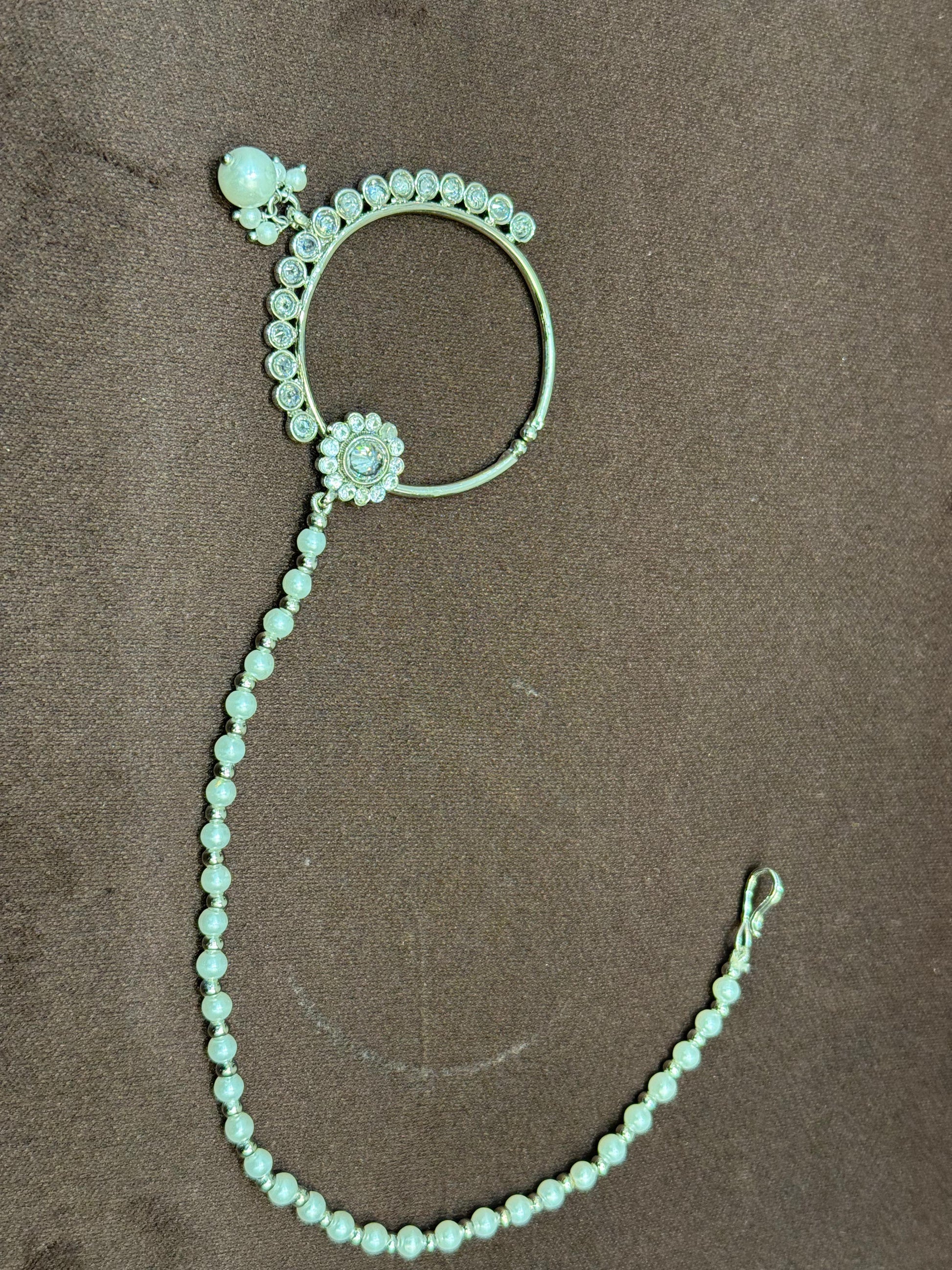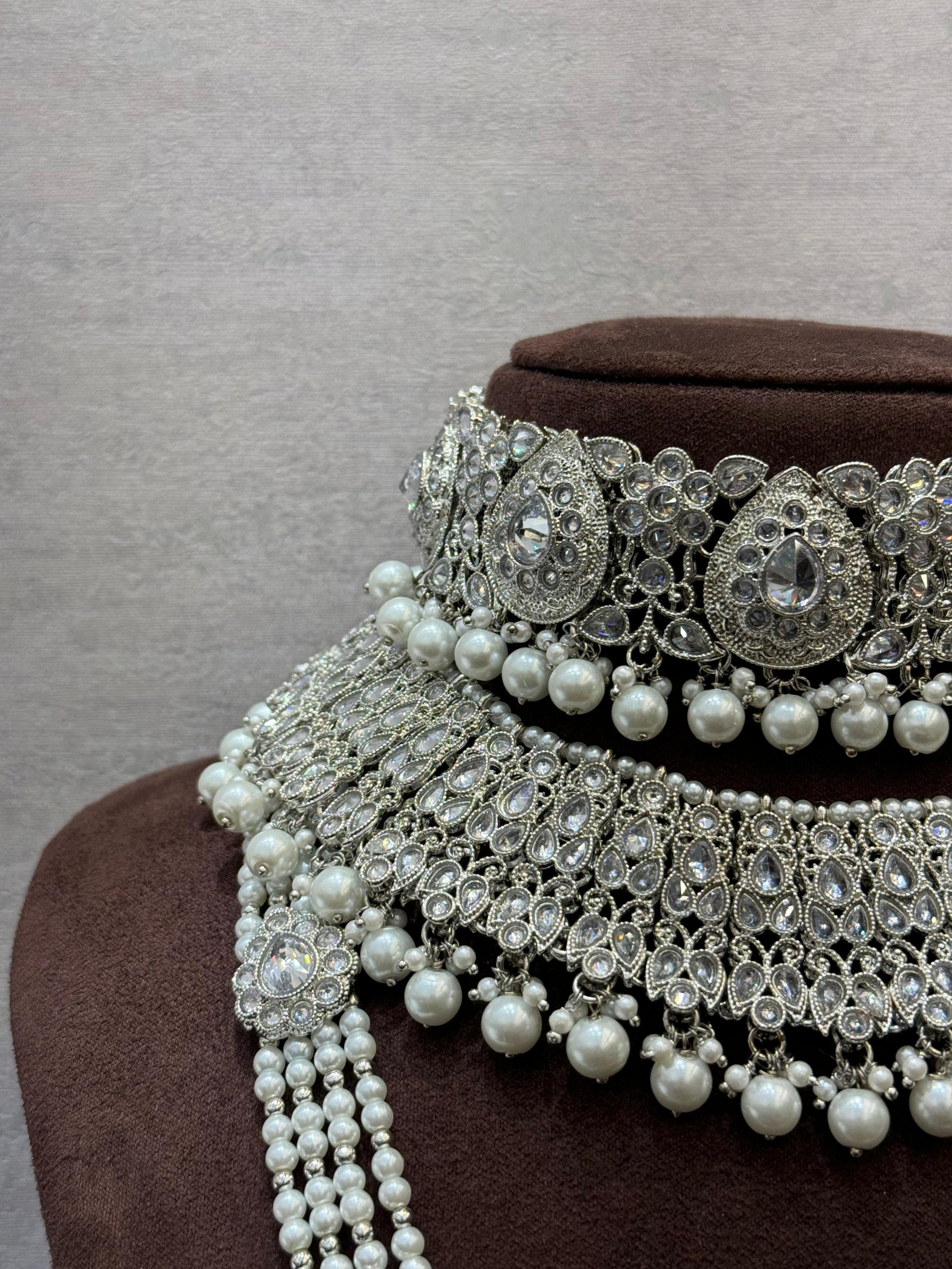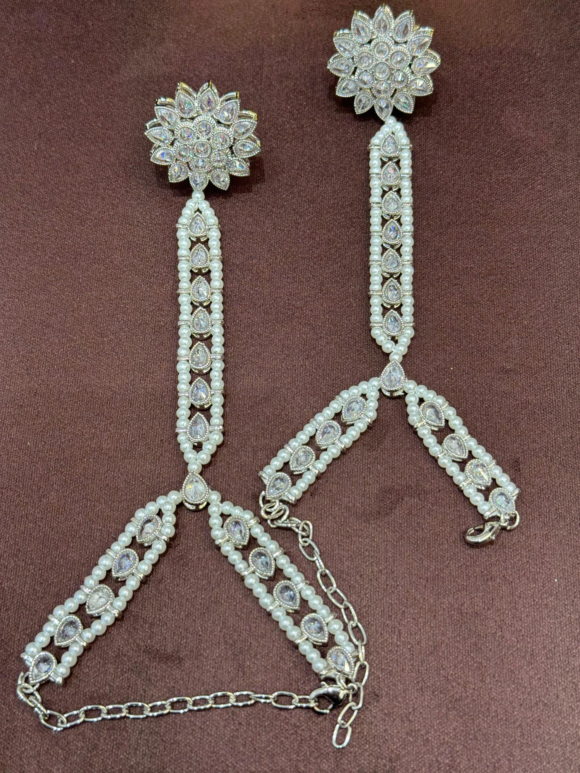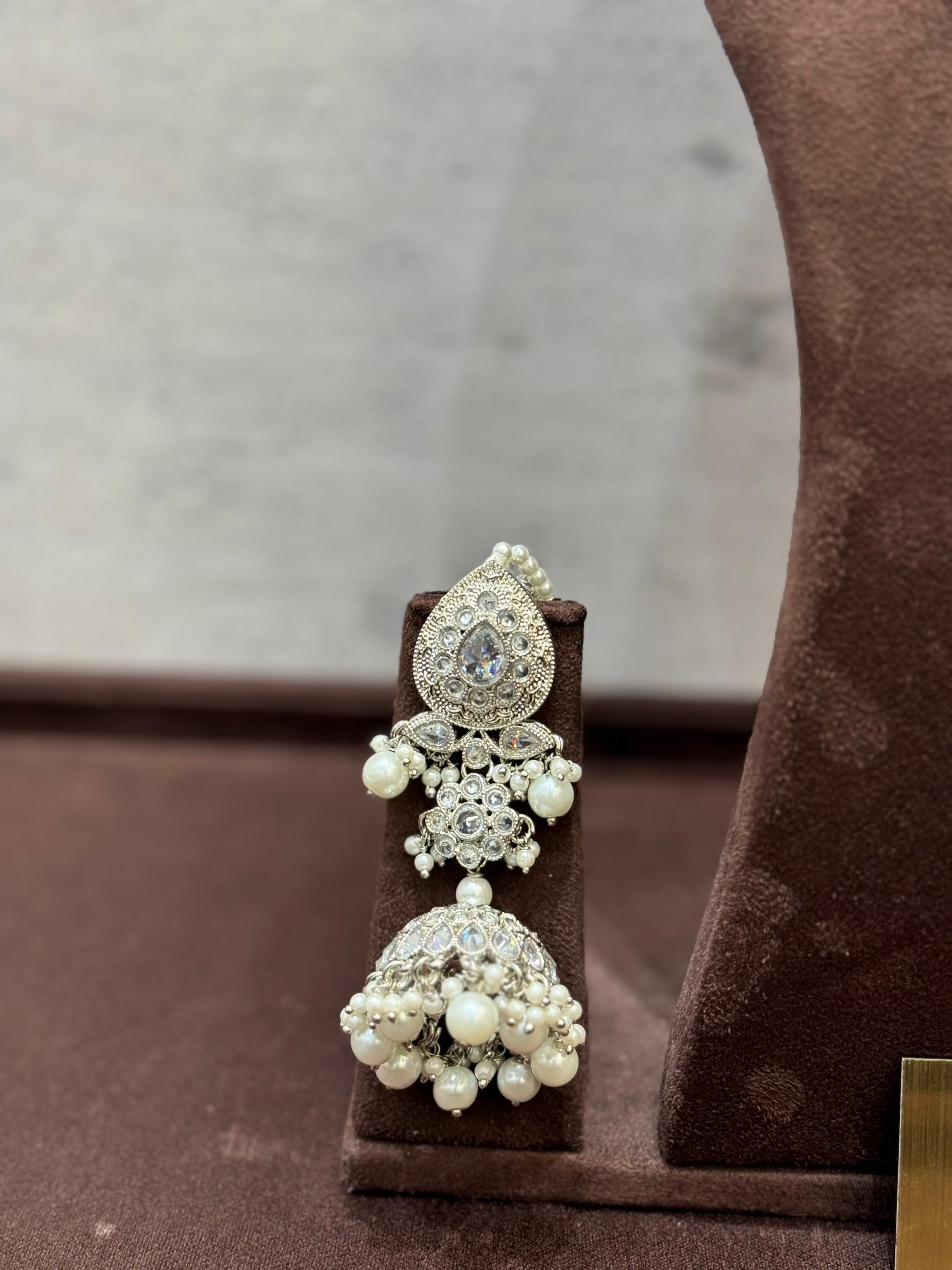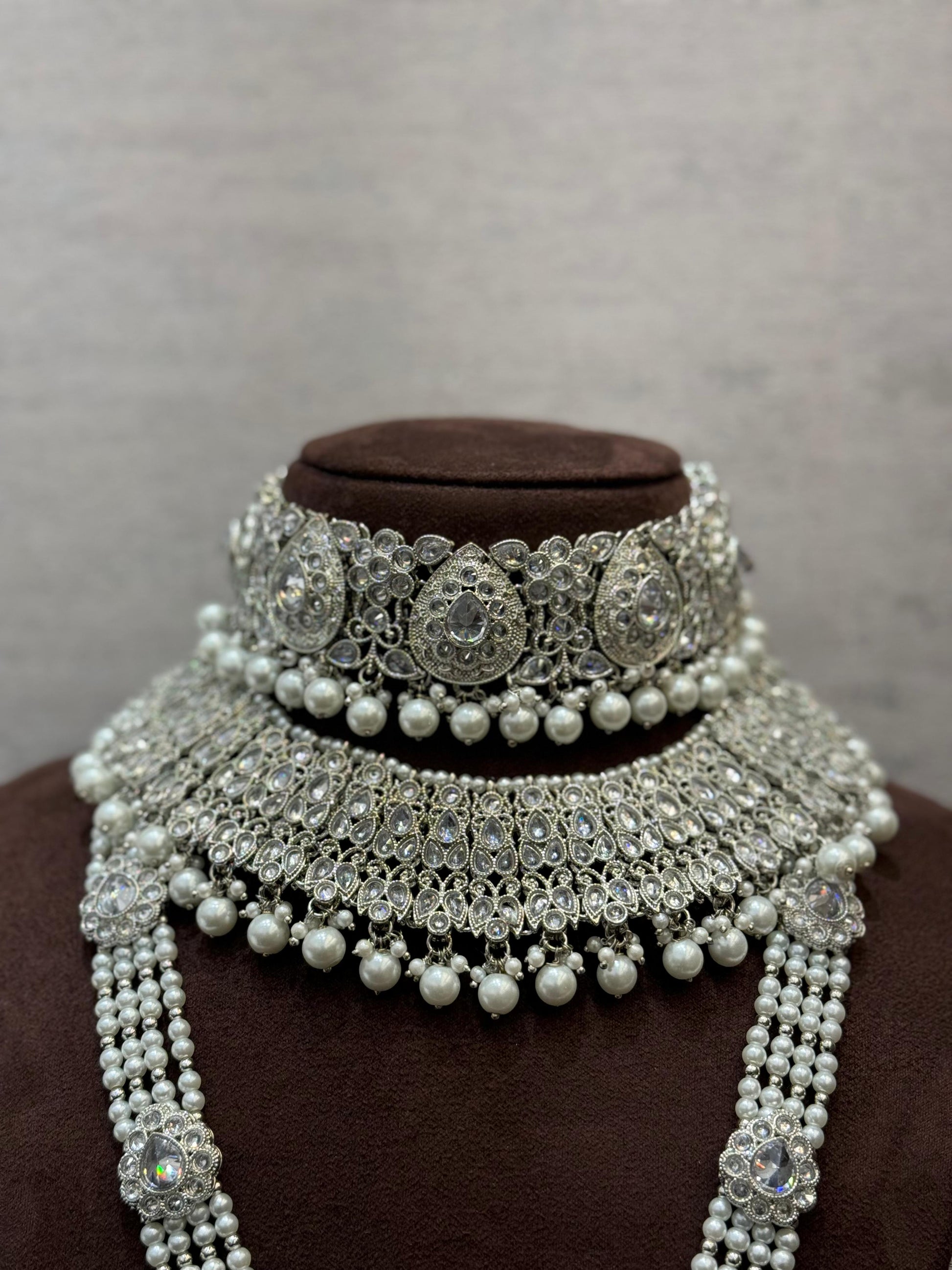 Enhance your bridal look with Bridal Jewelry JS-43. Adorned with stunning silver polki and lustrous white pearls, this exquisite piece exudes elegance and sophistication. Elevate your wedding ensemble with the perfect balance of tradition and luxury.