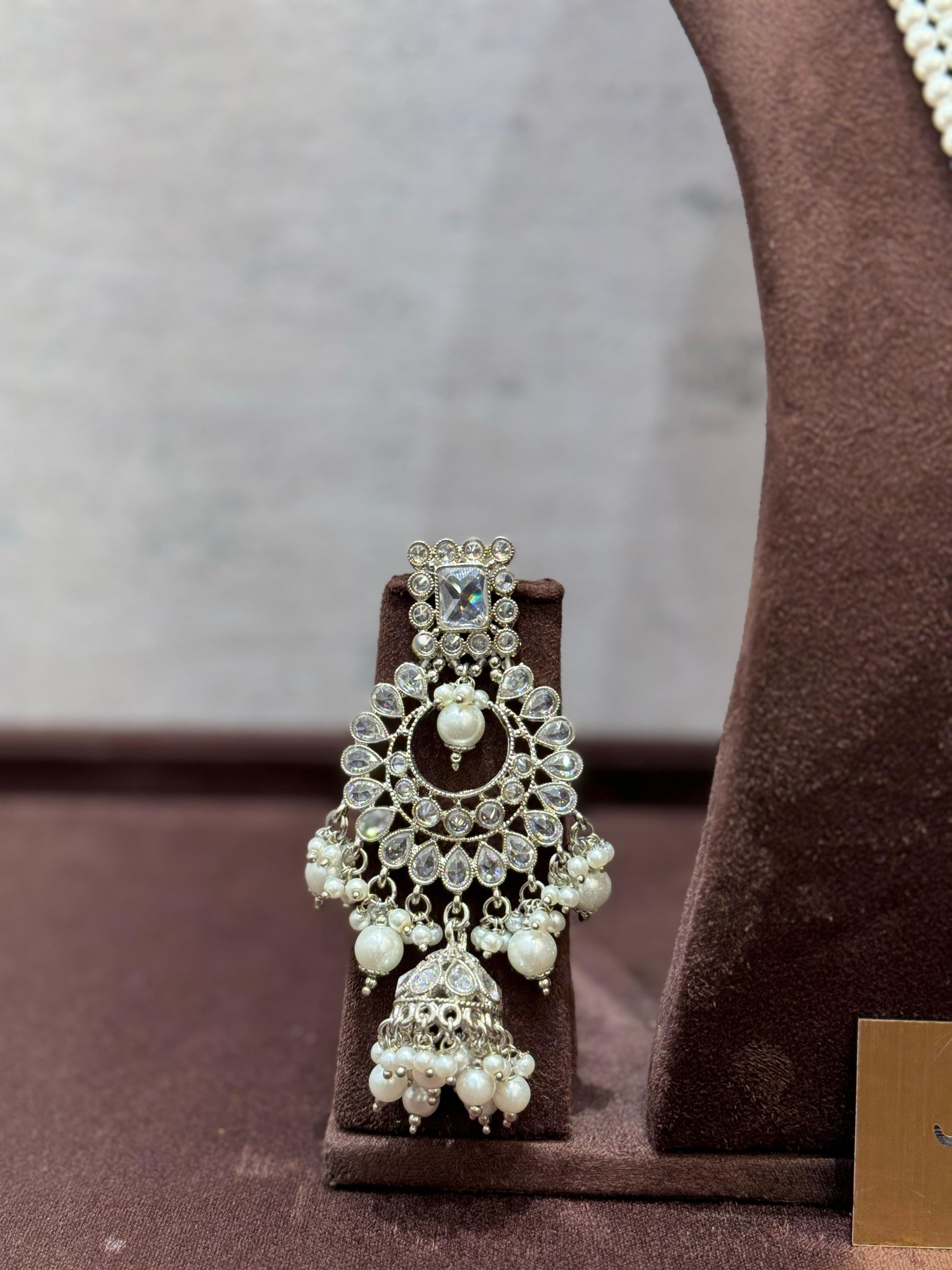 Complete your bridal look with our Bridal Jewelry JS-48. This elegant set features silver polki and delicate white pearls, complemented with a stunning long necklace. Add a touch of charm and sophistication to your special day with this beautiful set.