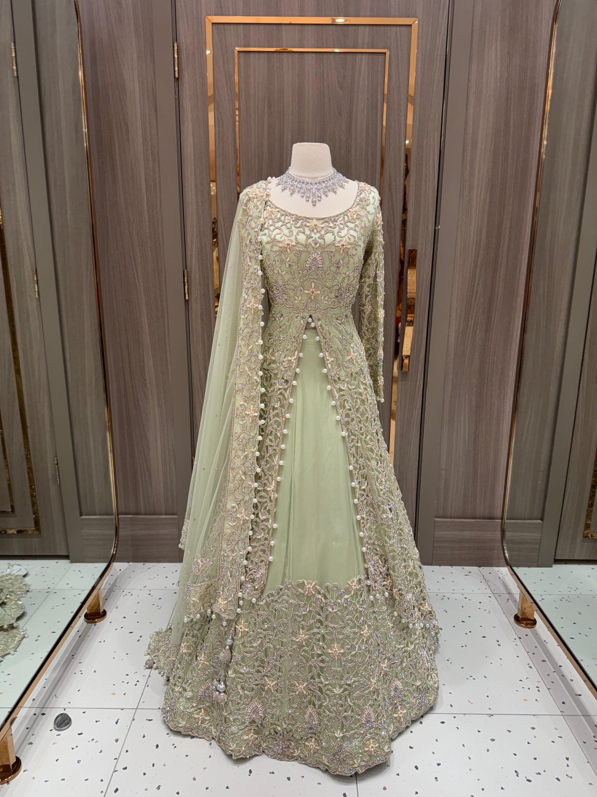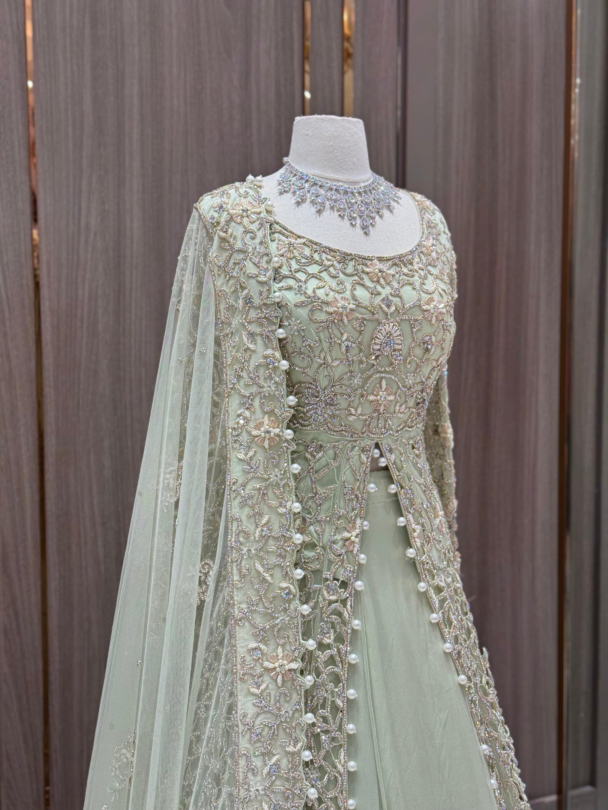 Make a statement this summer with our Bridal Lacha Bl-018. Featuring a beautiful mint color, silver stone cutwork, and delicate pearls and peach beads, this lacha is perfect for any summer ceremony. Complete the look with the unique train skirt for a stunning and stylish outfit.