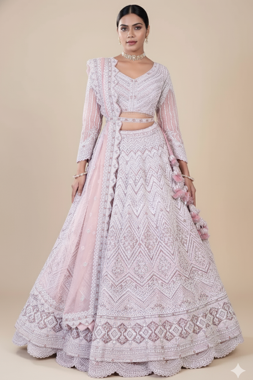 A stunning traditional pink embroidered outfit featuring a layered skirt with scalloped edges and intricate patterns. This outfit boasts elegance with a matching detailed blouse and includes a waist belt. Adorned with silver stone and sequin embroidery.