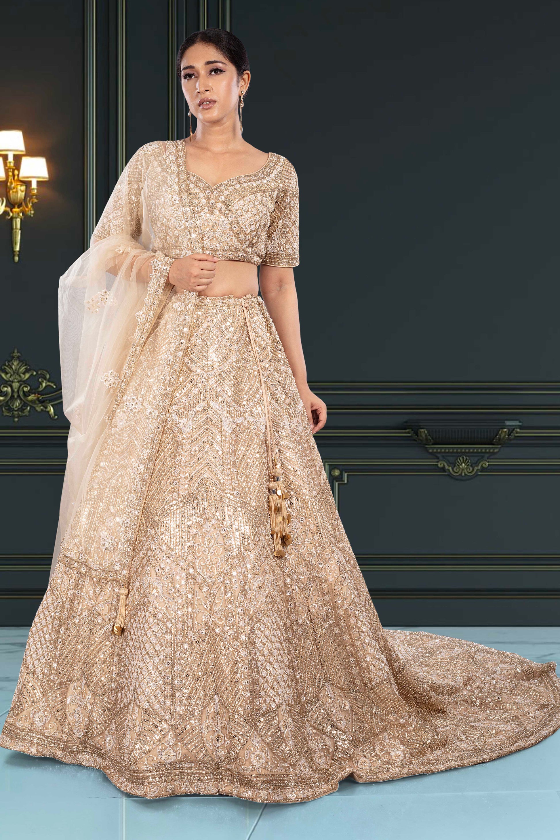 Elevate your bridal look with our stunning Bridal Lehenga BL-359. This beautiful champion gold lehenga features a nice train, delicately embroidered with champion sequins and cut dana. Perfect for your reception, it radiates elegance and sophistication. Make a statement on your special day with this must-have piece.