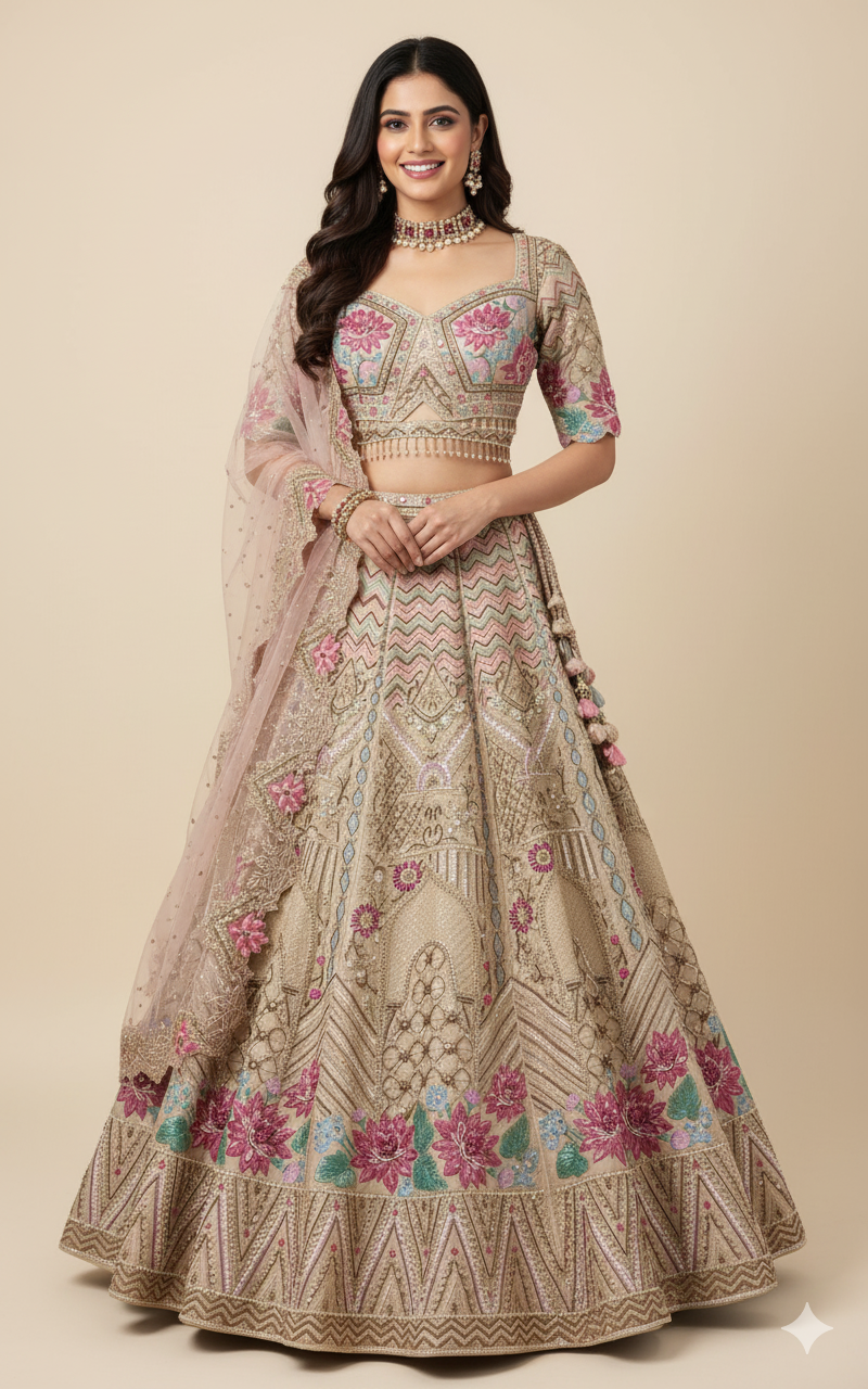 Celebrate your unique bridal style with this stunning gold lehenga adorned with intricate gold zardozi and vibrant multi-color thread work. Paired with a soft blush dupatta, it’s the perfect choice for the bride who loves a playful twist on tradition. Shine bright and make your special day truly unforgettable!