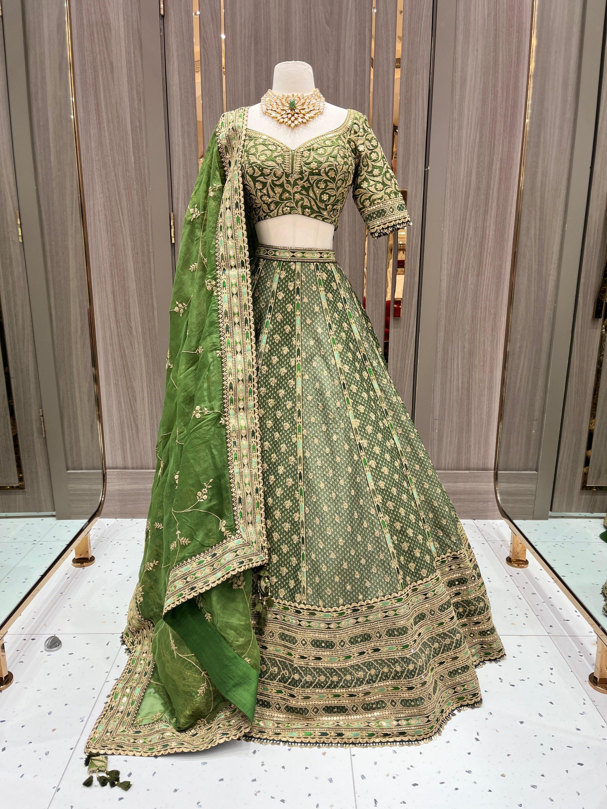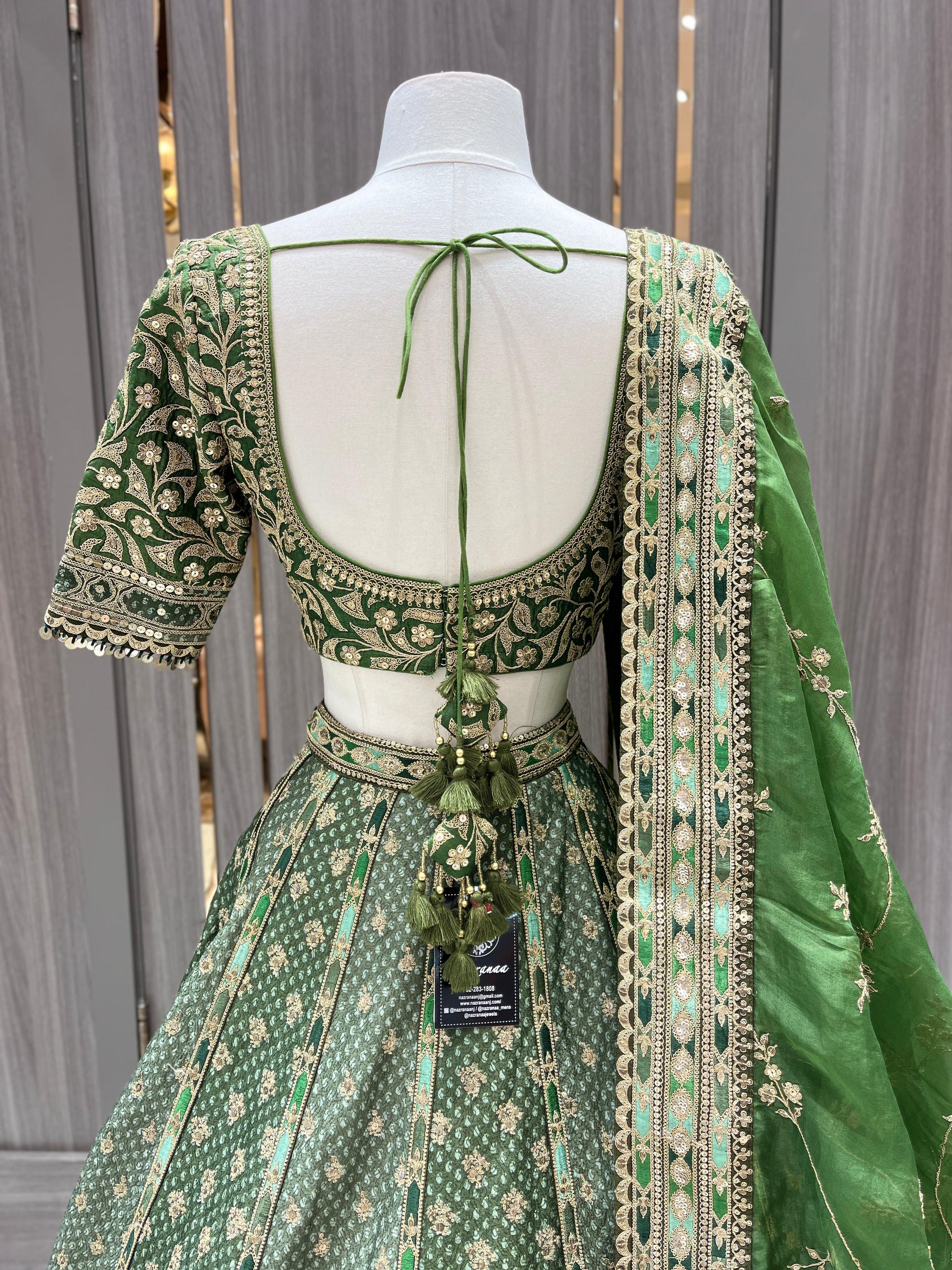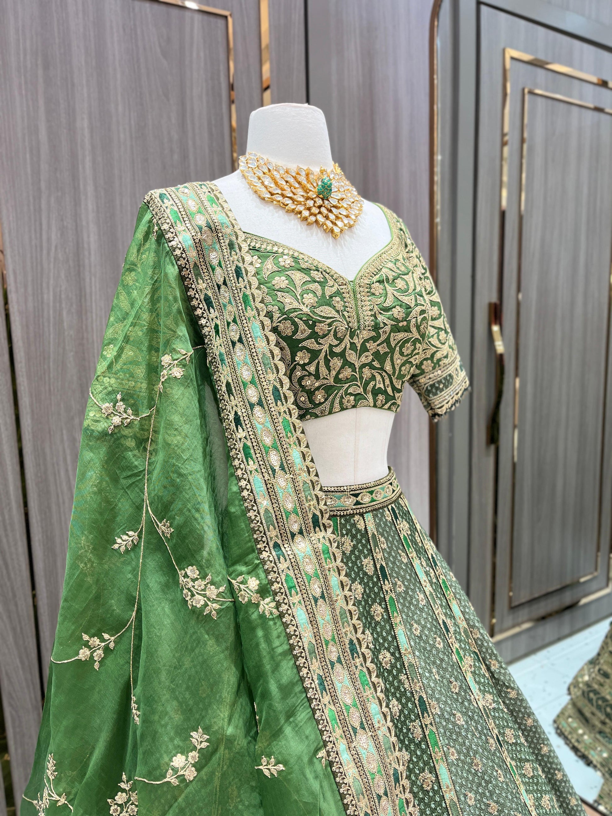Step into the spotlight with this rich forest green Badhani lehenga, adorned with intricate gold work that sparkles with every move. Paired perfectly with a raw silk blouse featuring matching gold accents and a delicate organza dupatta, this ensemble is made for the mother of the bride or groom to shine on mehendi night. Celebrate tradition with a playful twist and make memories wrapped in elegance and charm.