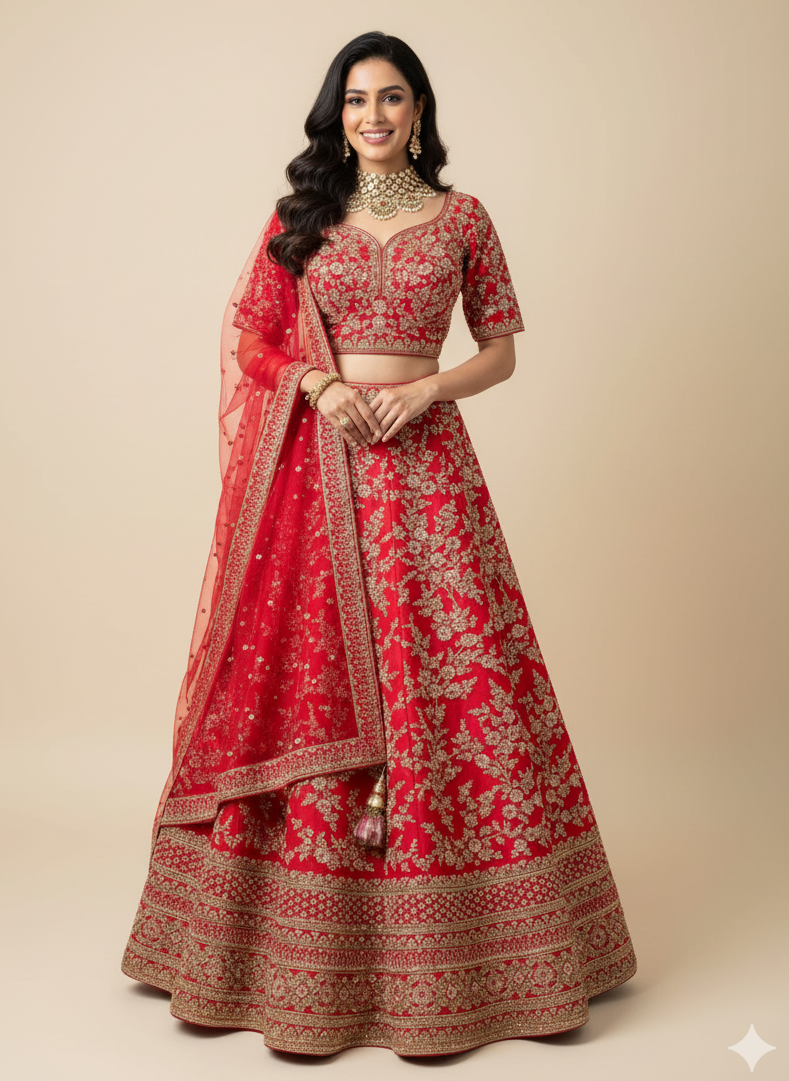 Elevate your summer wedding look with this bright red raw silk lehenga, adorned with an exquisite, bright floral design throughout. The rich texture of raw silk combined with vibrant patterns creates a striking ensemble that blends tradition with contemporary elegance, perfect for making a memorable statement on your special day.