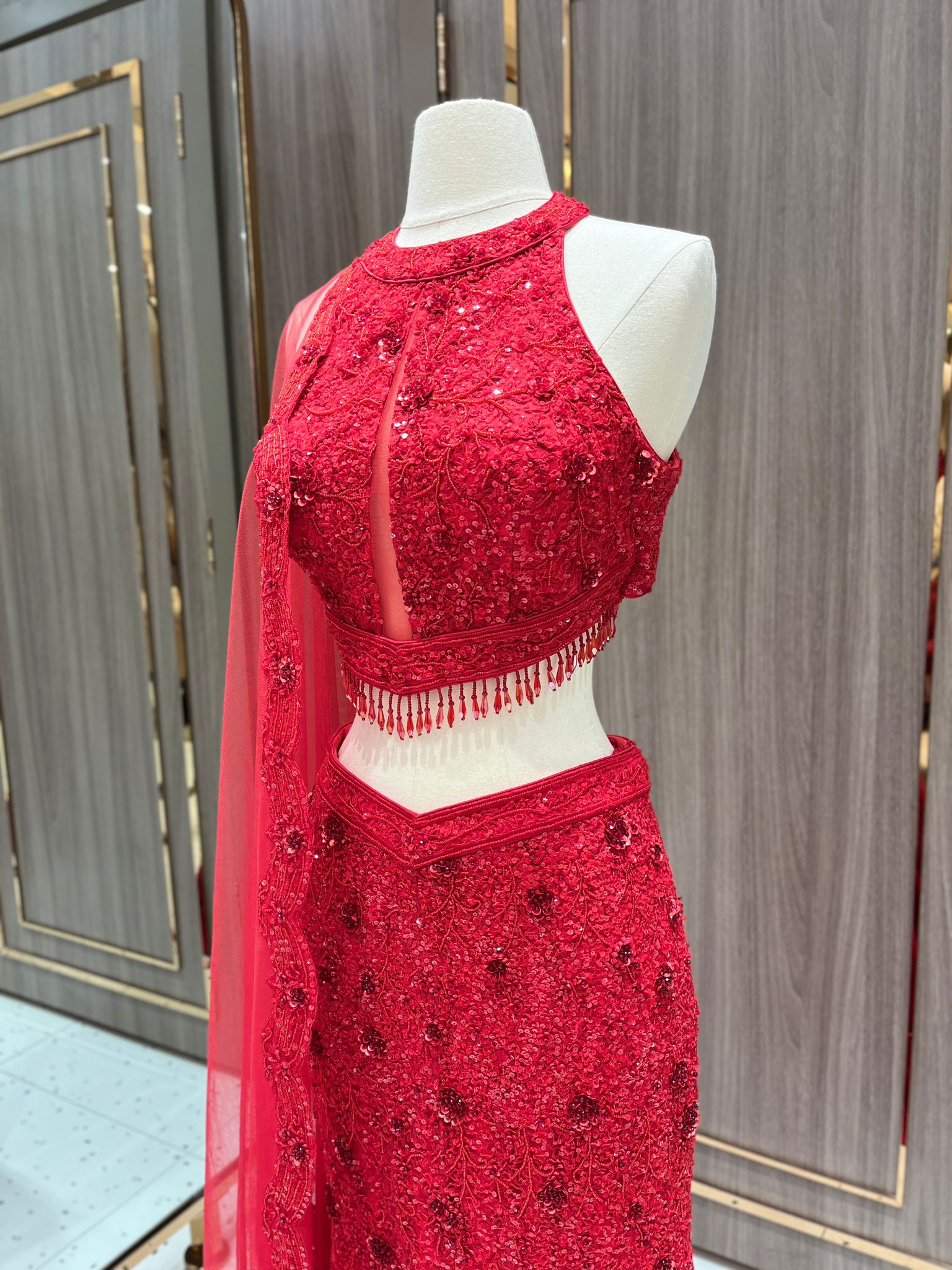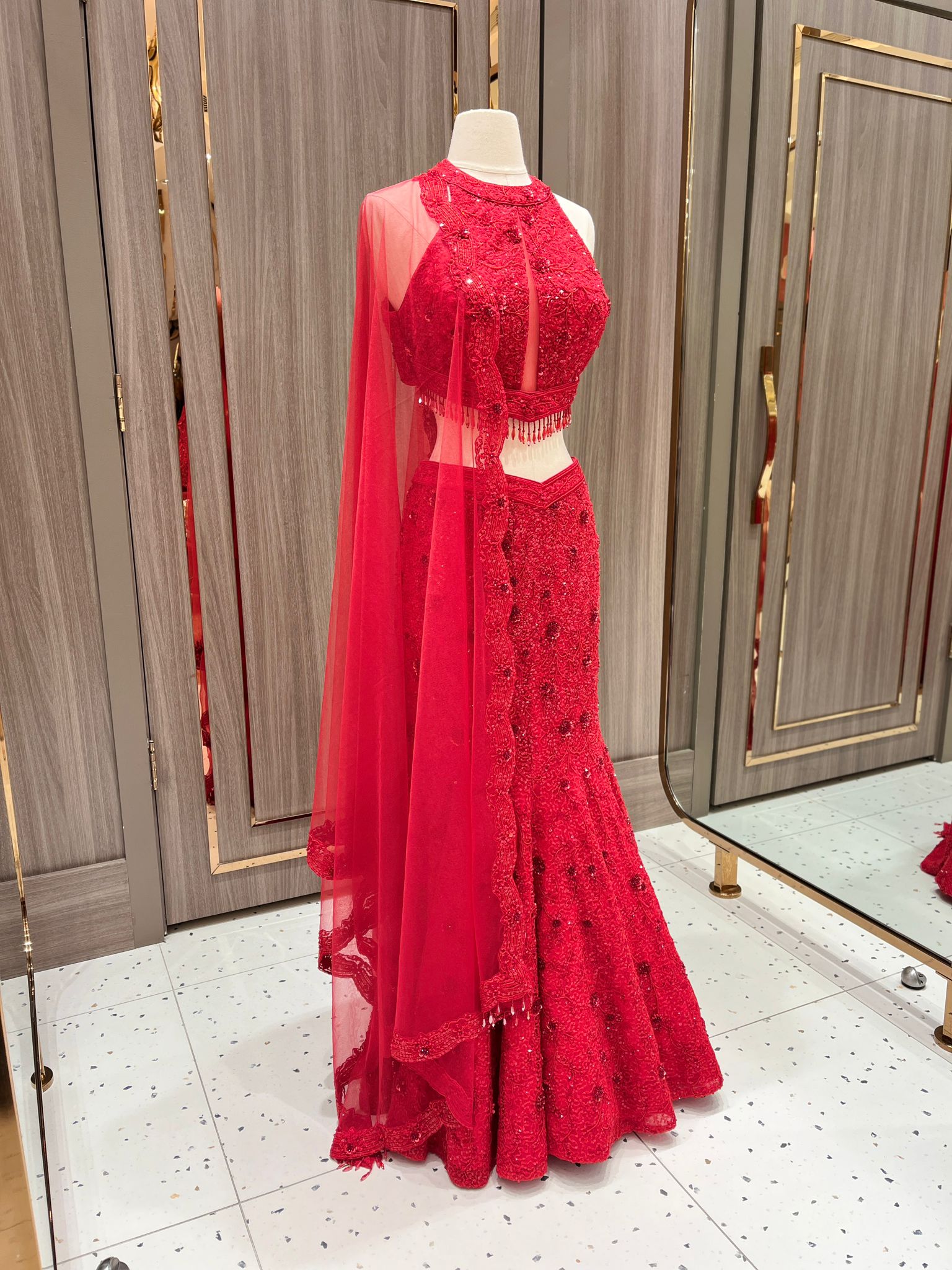 This red mermaid lehenga features a modern silhouette with a fully tonal red-on-red design that radiates elegance. The halter neck top is adorned with delicate hanging beads, adding a graceful shimmer with every movement. Intricate 3D tonal sequin flowers provide rich texture and dimension, while exquisite embroidery with cutdana and sequins offers a subtle, enchanting sparkle. Designed to flatter and impress, this versatile lehenga is ideal for anyone seeking a sophisticated, radiant look for any special event.