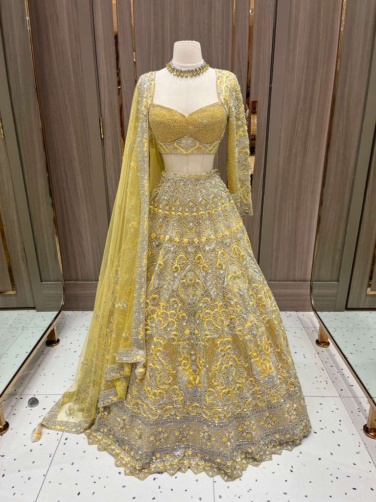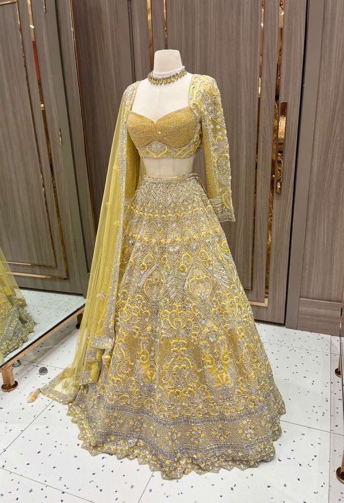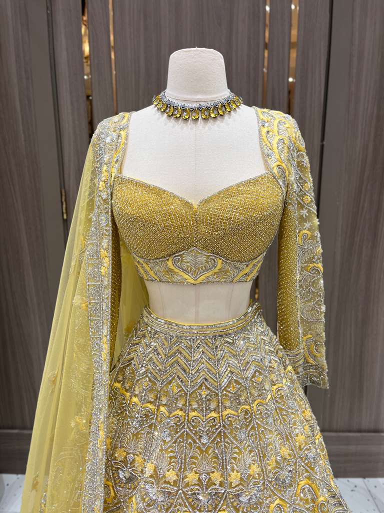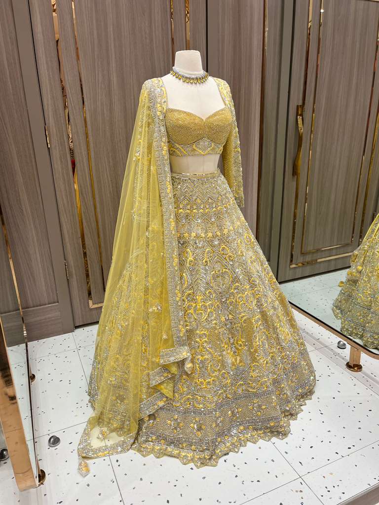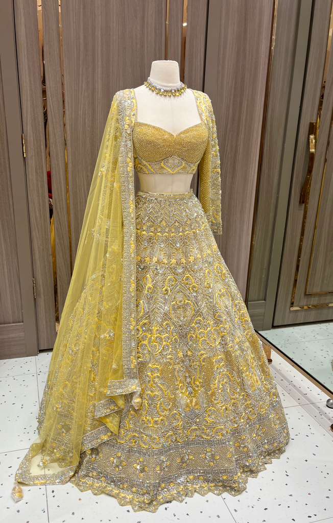 The Bridal Lehenga BL-472 is a stunning yellow creation adorned with intricate silver embroidery throughout. This sophisticated piece seamlessly blends traditional Indian craftsmanship with contemporary bridal aesthetics, offering refined elegance for the modern bride.