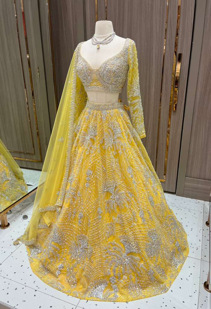 This stunning yellow bridal lehenga with bold silver starburst and firework embroidery that creates striking visual impact. Delicate linear patterns add refined sophistication, while the distinctive neckline brings contemporary elegance to traditional bridal style. A luminous, show-stopping piece that radiates confidence and grace.
