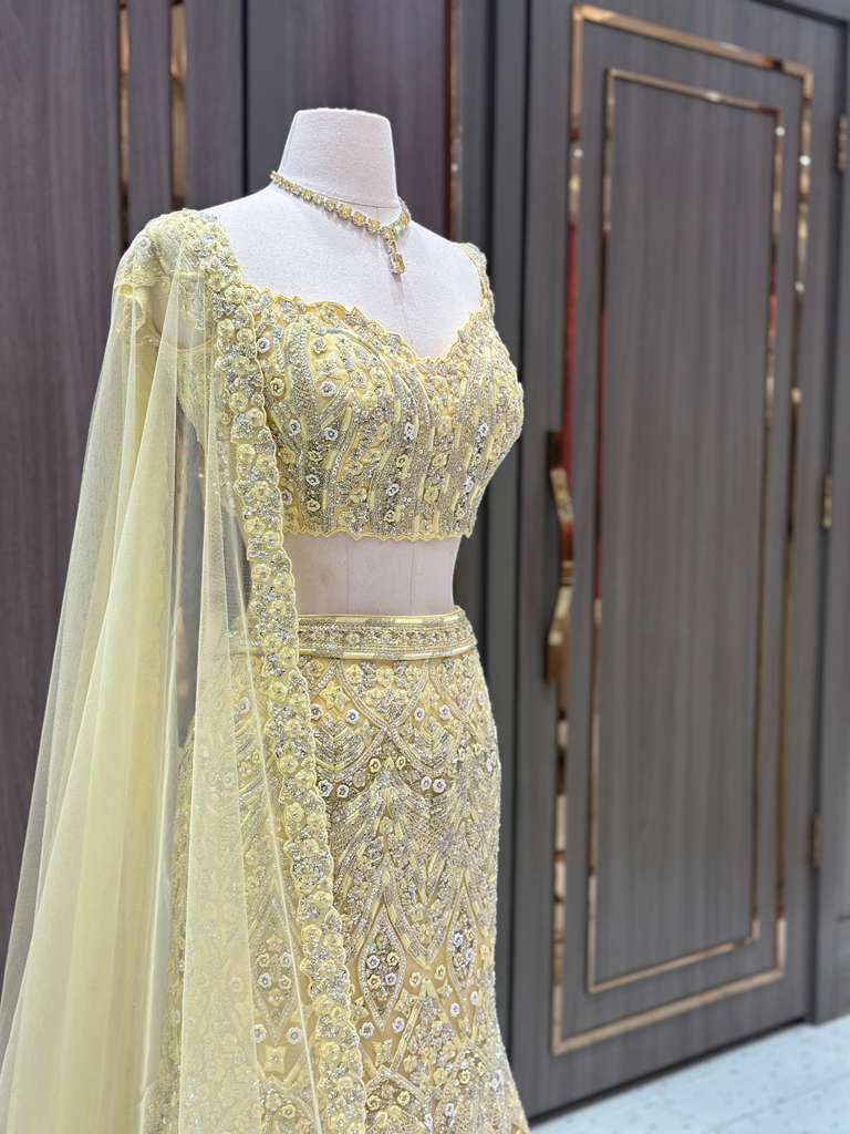 Unveil the Bridal Lehenga BL - 476, an exquisite yellow mermaid silhouette that captures the essence of refined bridal artistry and timeless elegance. This stunning creation showcases exceptional craftsmanship, featuring uniquely designed patterns adorned with opulent embroidery that weaves together lustrous silver stones with balanced tonal and accent threads, creating a tapestry of sophisticated embellishment.