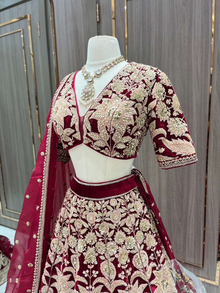 Step into your wedding day in this magnificent deep maroon velvet lehenga, radiating timeless sophistication and regal allure. Adorned with intricate gold and pink-accented floral embroidery, each motif is meticulously crafted to exude refined elegance.