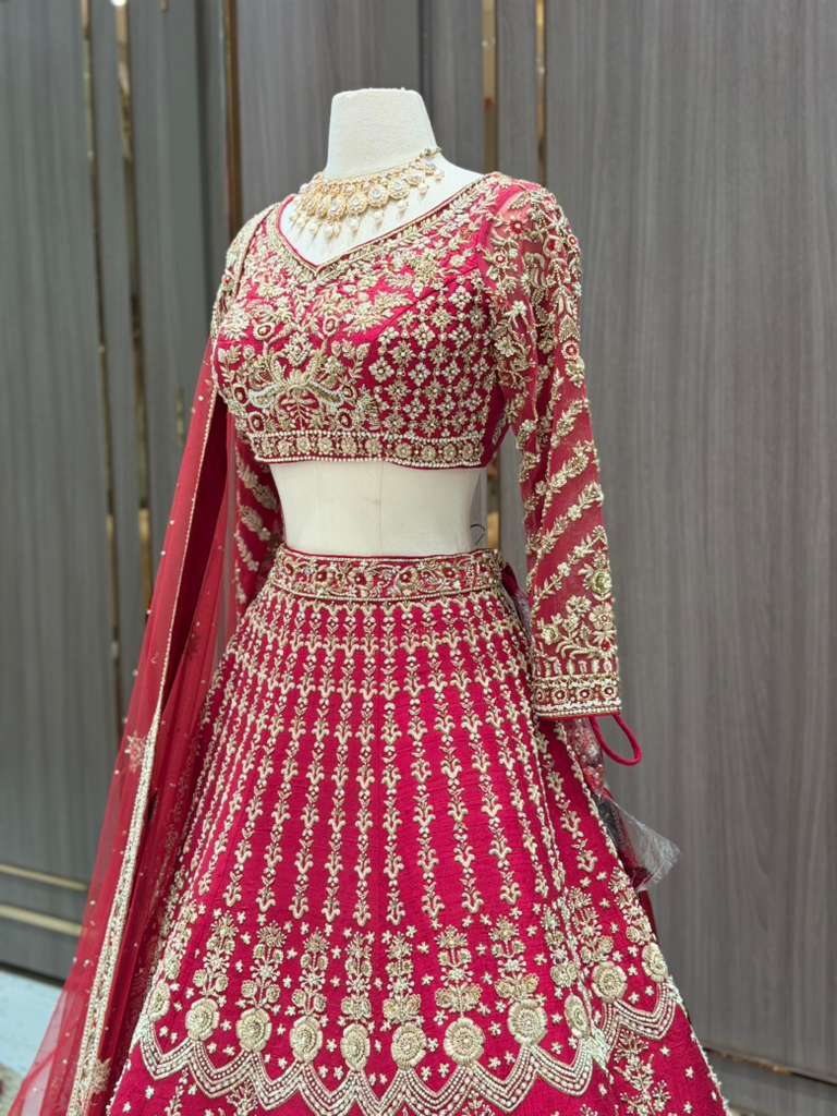 Stunning red bridal lehenga set with gold embroidery in traditional motifs. Includes a tailored embroidered blouse, flowing skirt with ornamental detailing, and a sheer embellished dupatta, an exquisite choice for your special day.