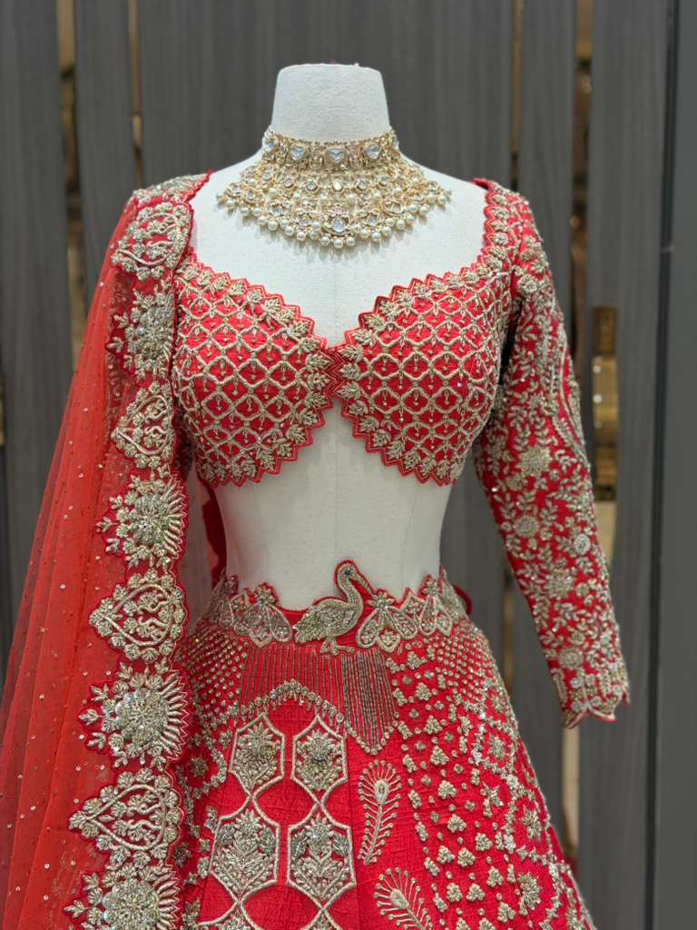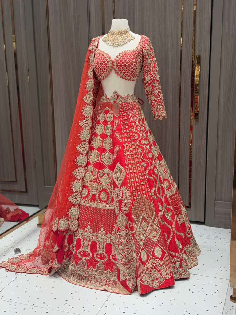 This exquisite bridal lehenga set is a celebration of timeless craftsmanship and regal elegance. Rendered in a rich crimson red, the ensemble is adorned with intricate gold embroidery that reflects traditional artistry at its finest.