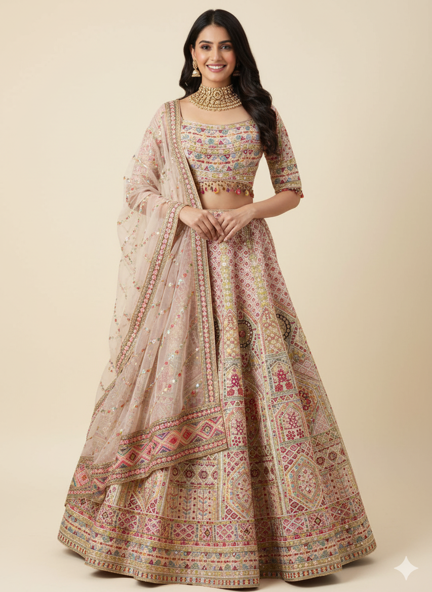 Celebrate your sangeet night in vibrant style with this stunning organza lehenga. Adorned with colorful thread and shimmering foil work across the skirt, it captures the essence of traditional Rajasthani craftsmanship. Delicate hanging beads on the blouse waist and wrists add a playful sparkle, making every move a celebration. Perfect for those who love a mix of tradition and fun flair!