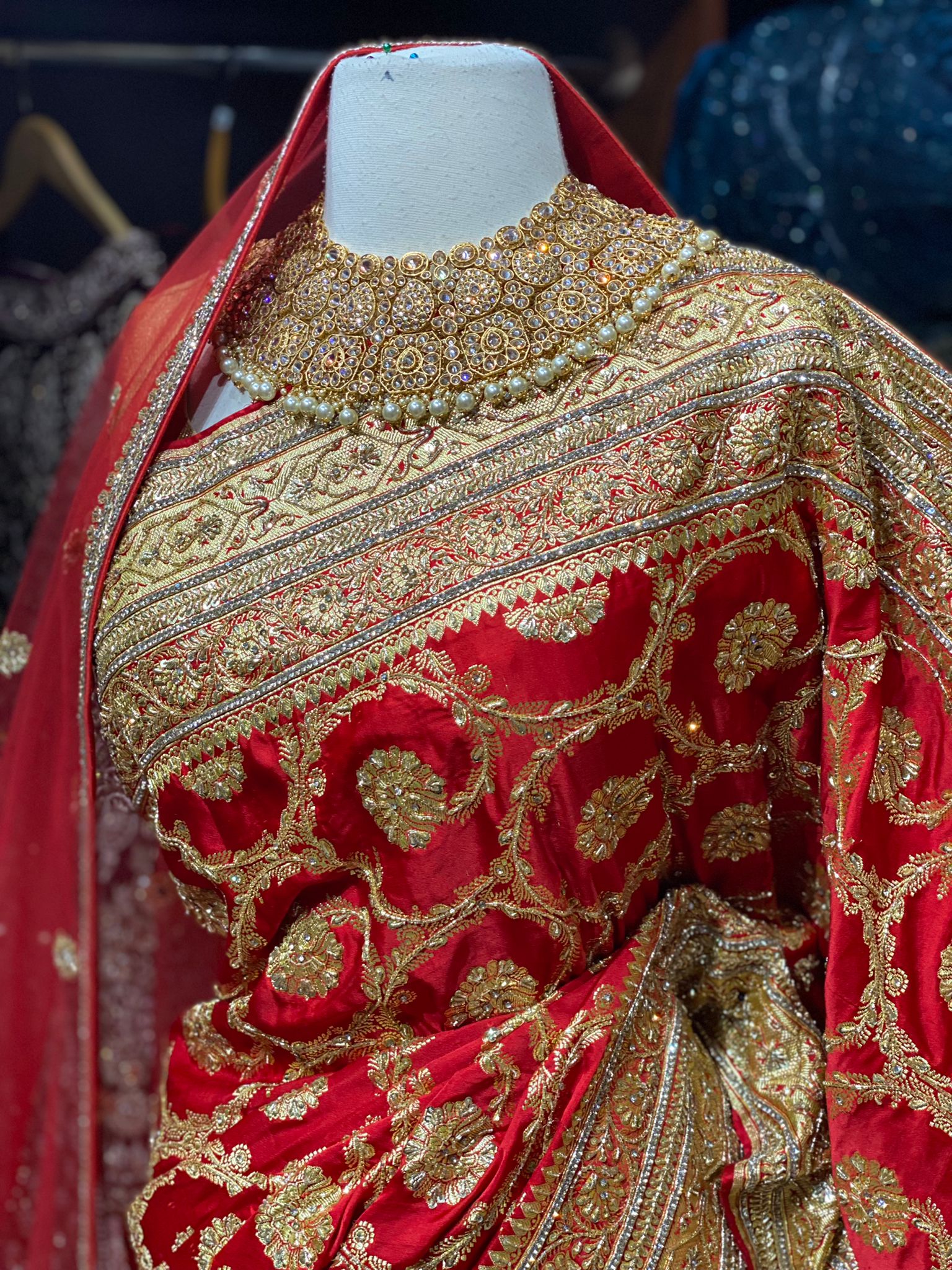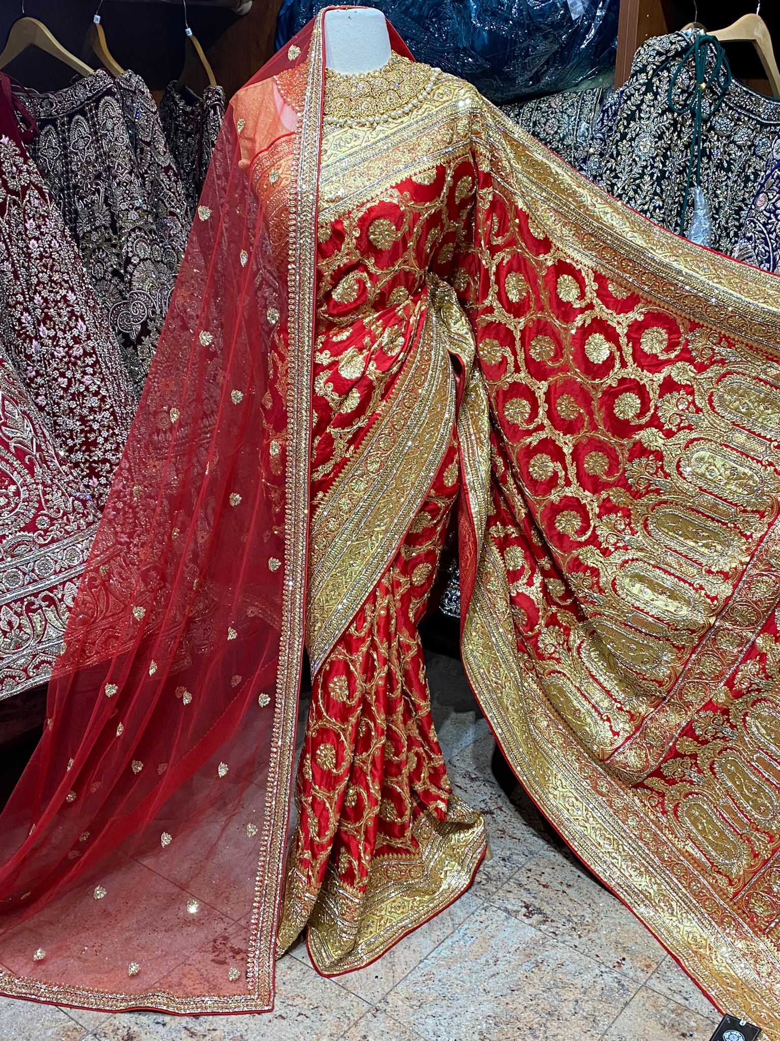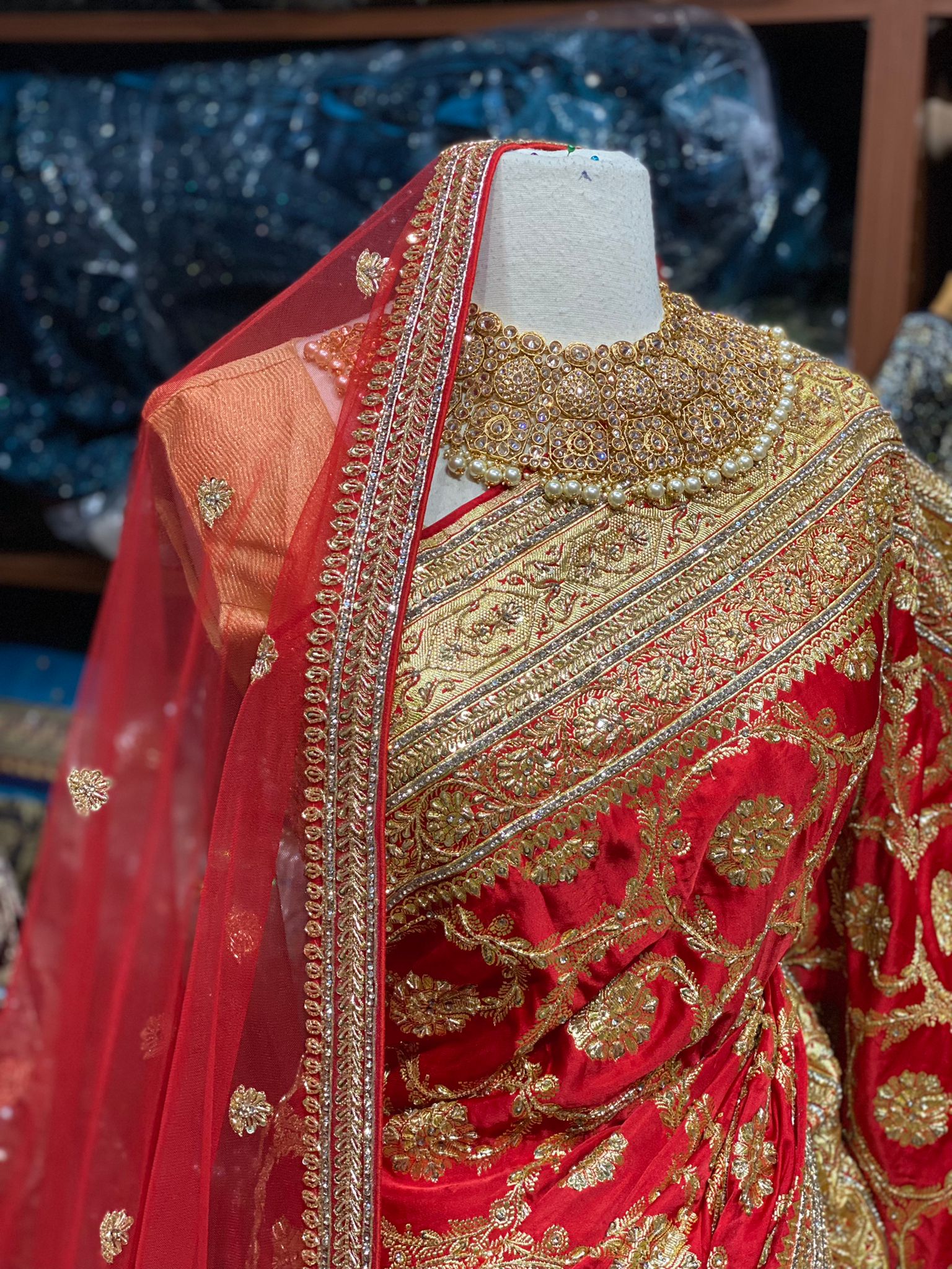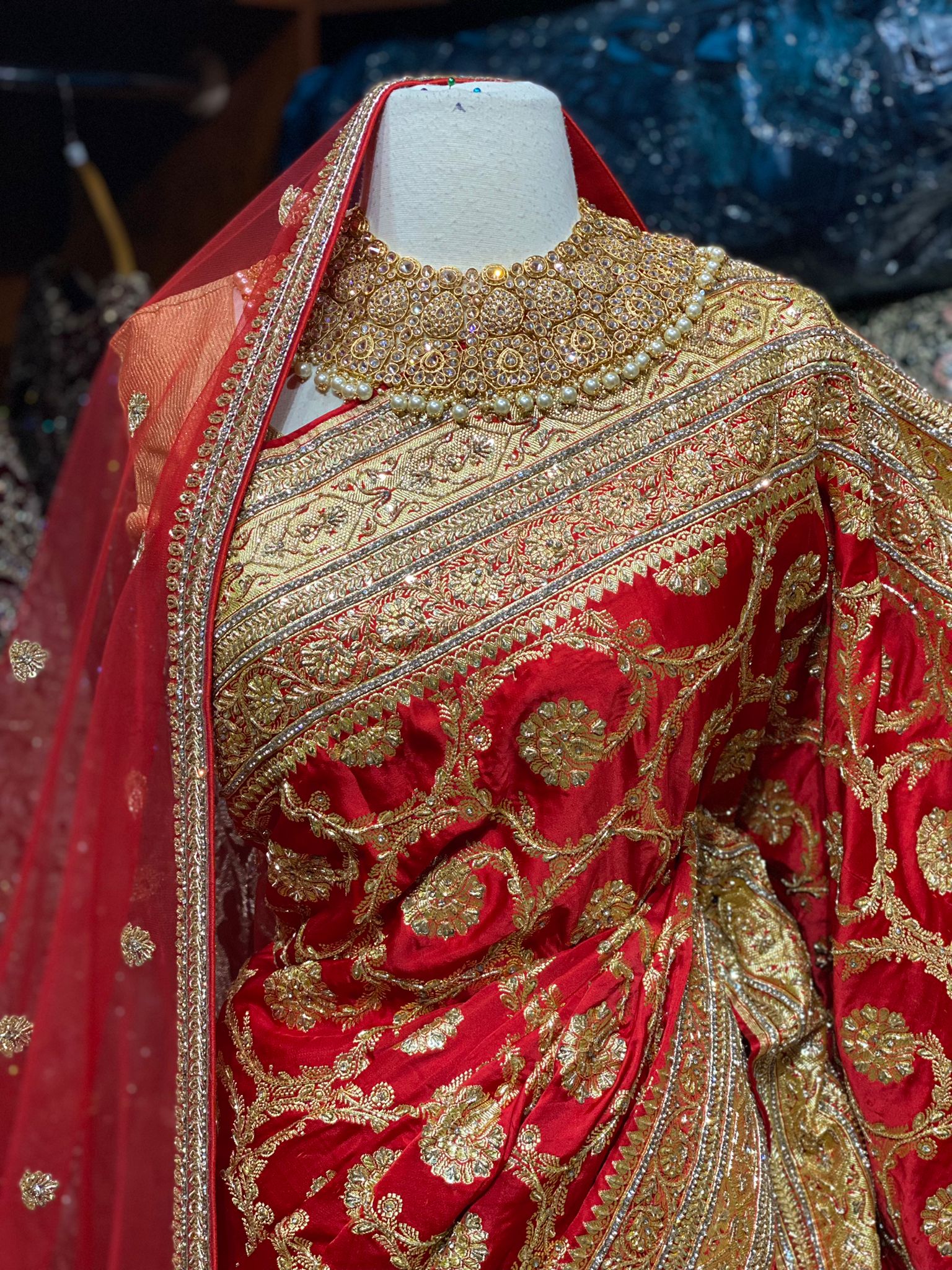The saree has an unstitched blouse and a matching net dupatta with motifs and embroidered border complete your bridal look.