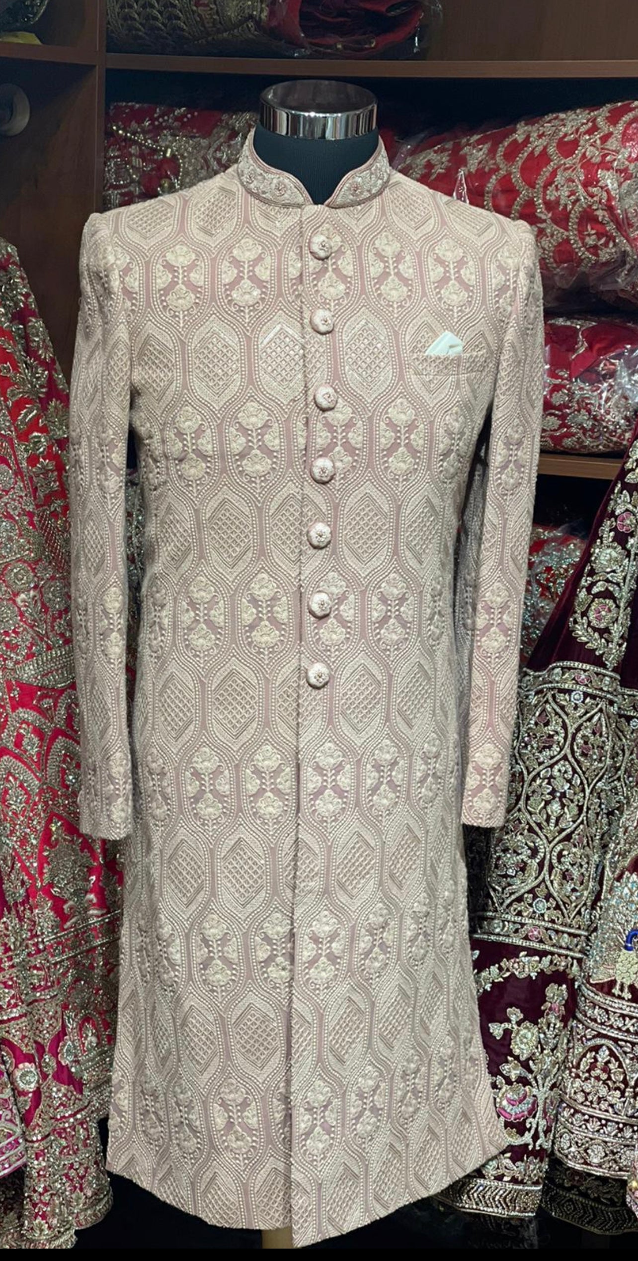 Sienna brown excellent detailing of vintage motifs accentuated with thread and sequence details with mandarin collar in cut dana and zardozi work. Available with matching churidar.