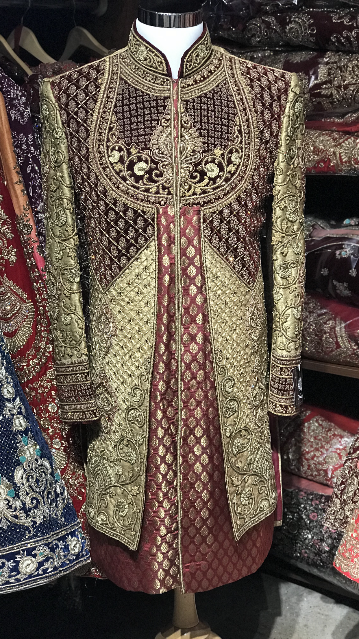 Gold brocade sherwani with an inside red Banarasi layer! The sherwani has intricate handwork including zardosi and resham embroidery! Paired with a gold chudidar