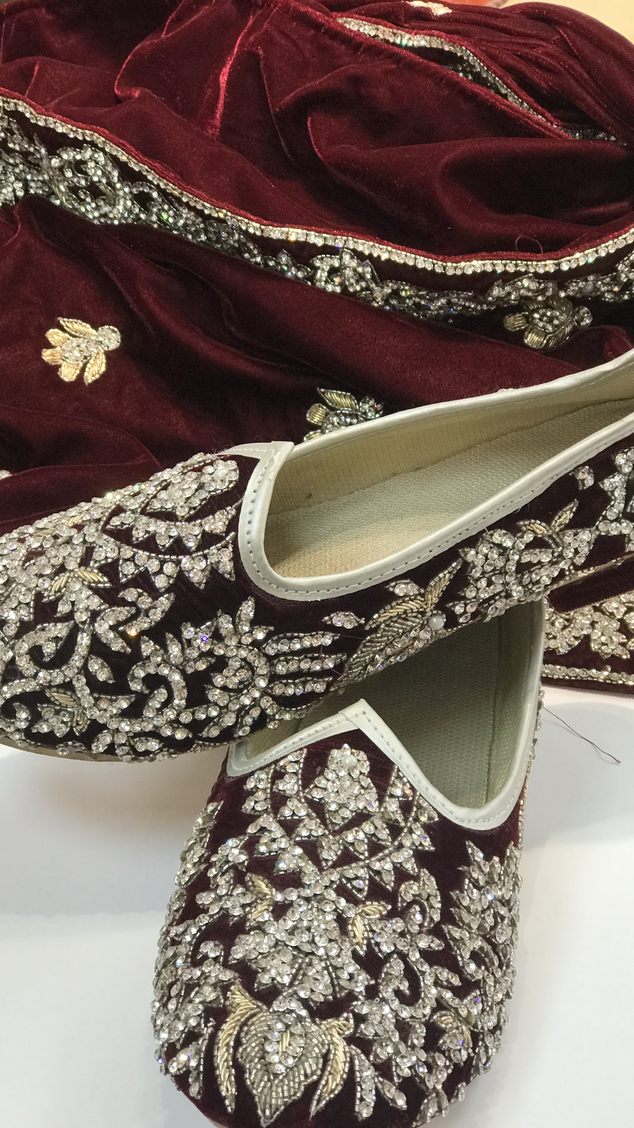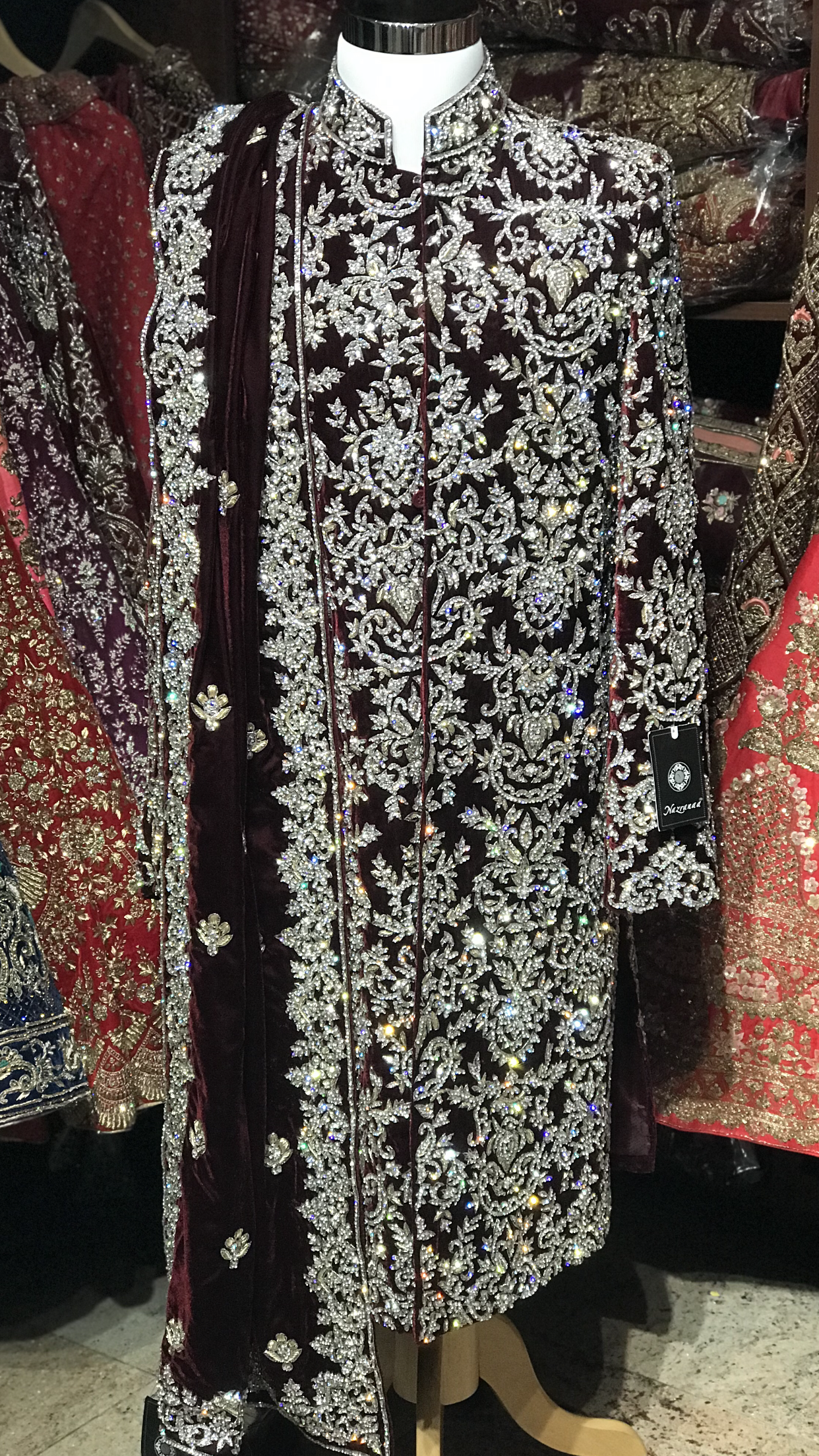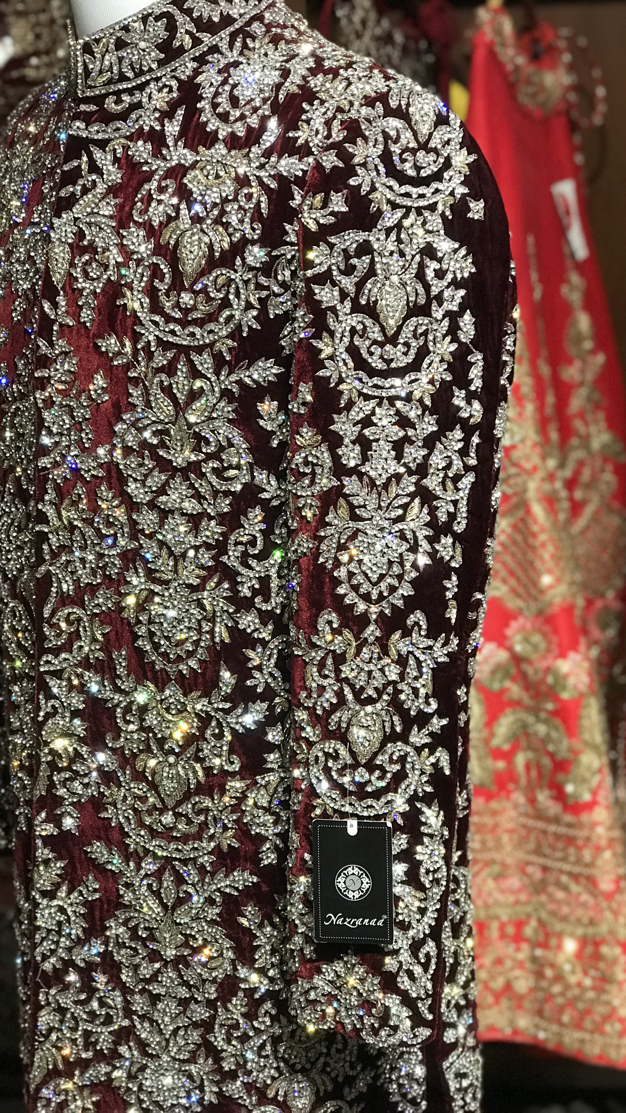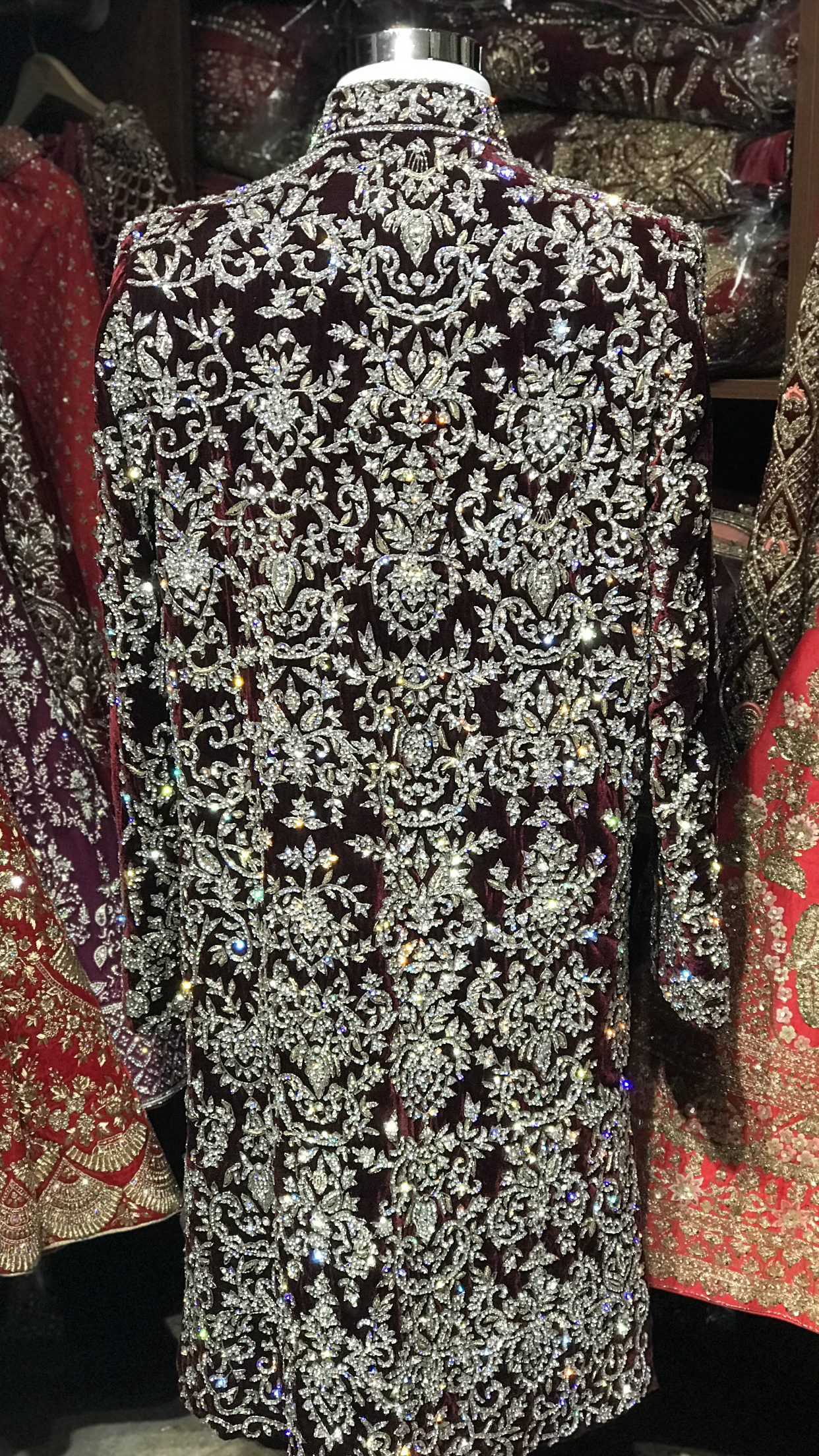 A WOW piece! A burgundy micro celvet sherwani with full silver crystal stonework mixed with gold zardosi! Paired with a burgundy chudidar and velvet dupatta!