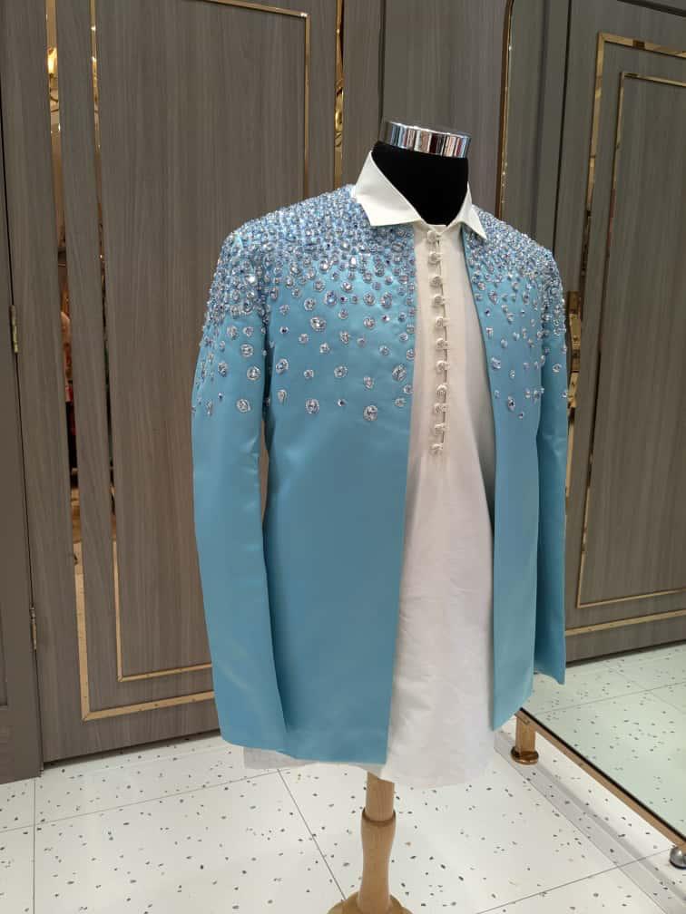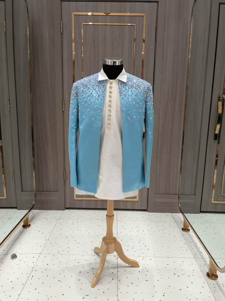 From the Dhruva Collection, Alpha is an open-jacket bandhgala in sky blue that redefines regal menswear. The structured jacket features heavy crystal and sequin embellishments across the shoulders, cascading like stardust into a clean, minimal body. Paired with an ivory kurta, this silhouette is both youthful and sophisticated — perfect for grooms seeking a balance of tradition and contemporary flair.