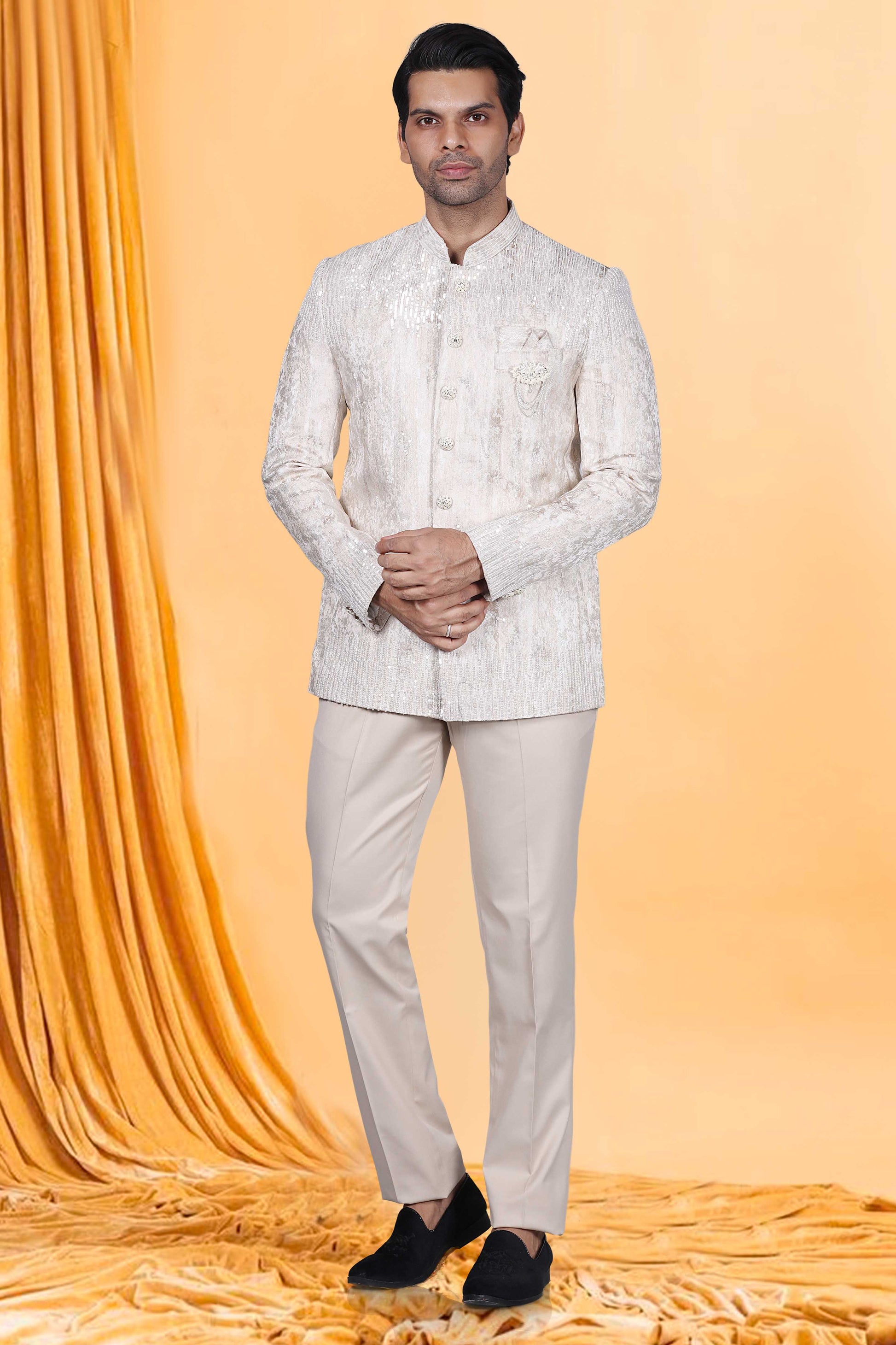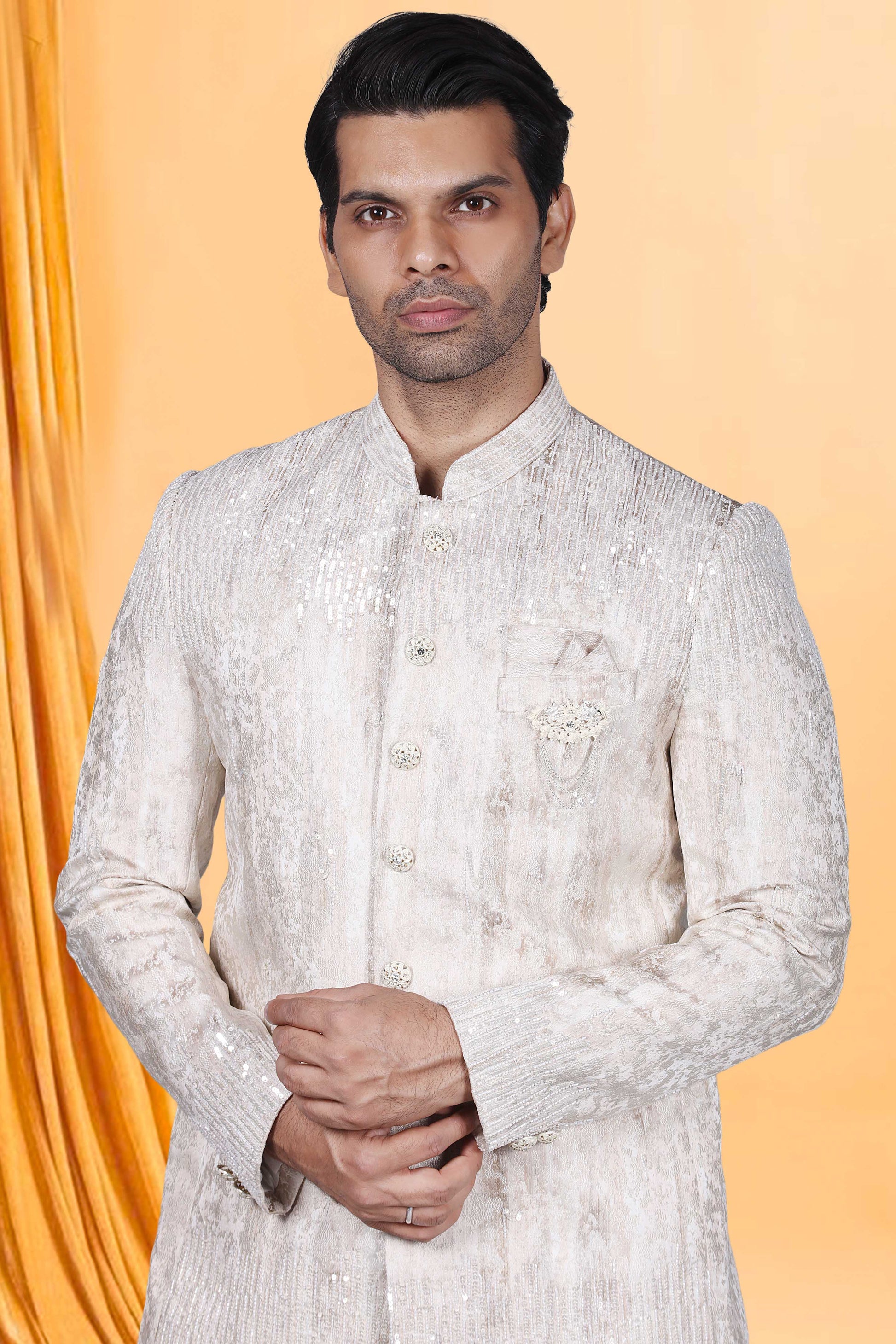 Indulge in the exquisite luxury of our Mens Bandhgala M42-S79, adorned with beautiful Cutdana and sequence detailing. Experience the sophistication and exclusivity of our premium product, designed to elevate your style and make a statement. Elevate your wardrobe with this tasteful piece.