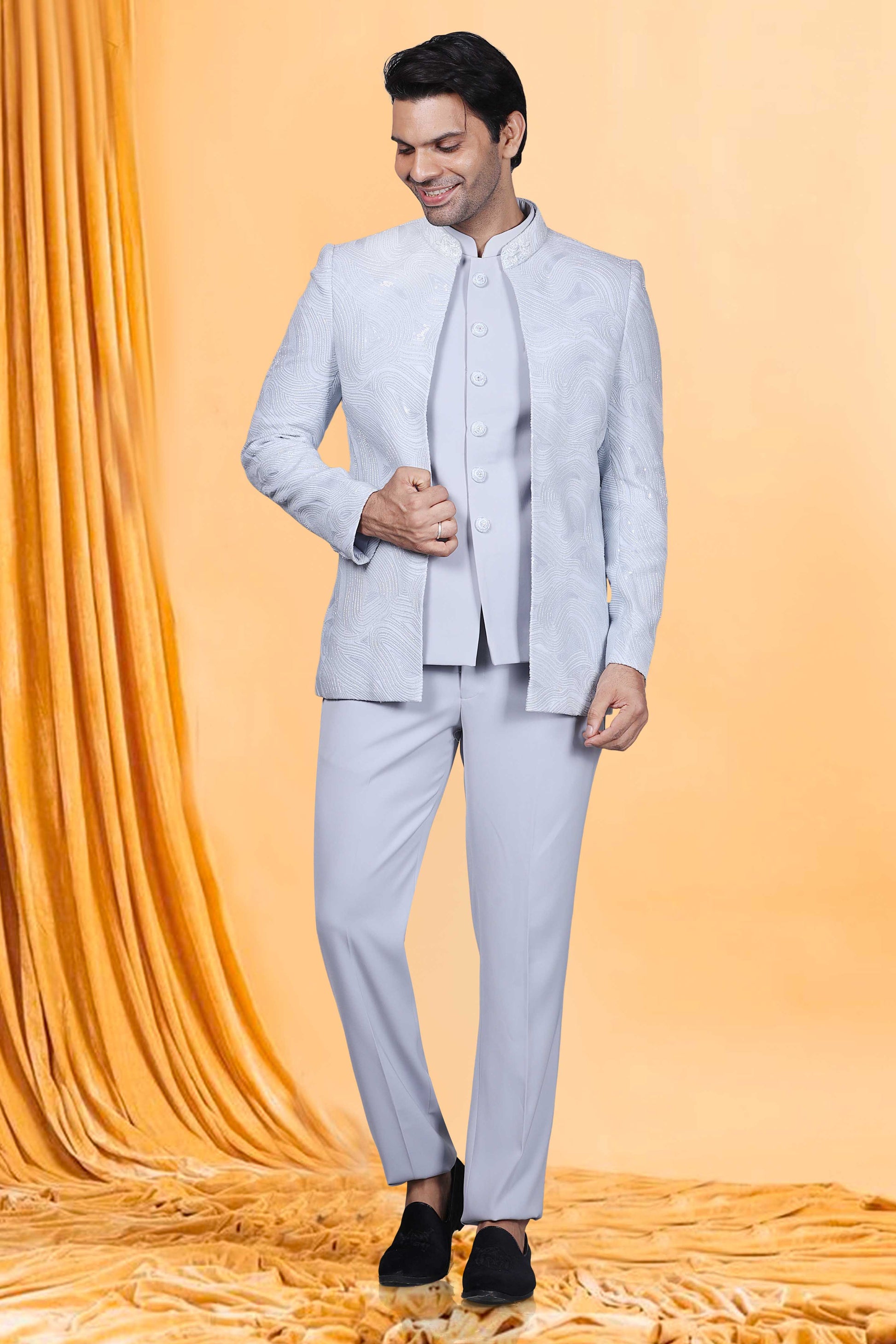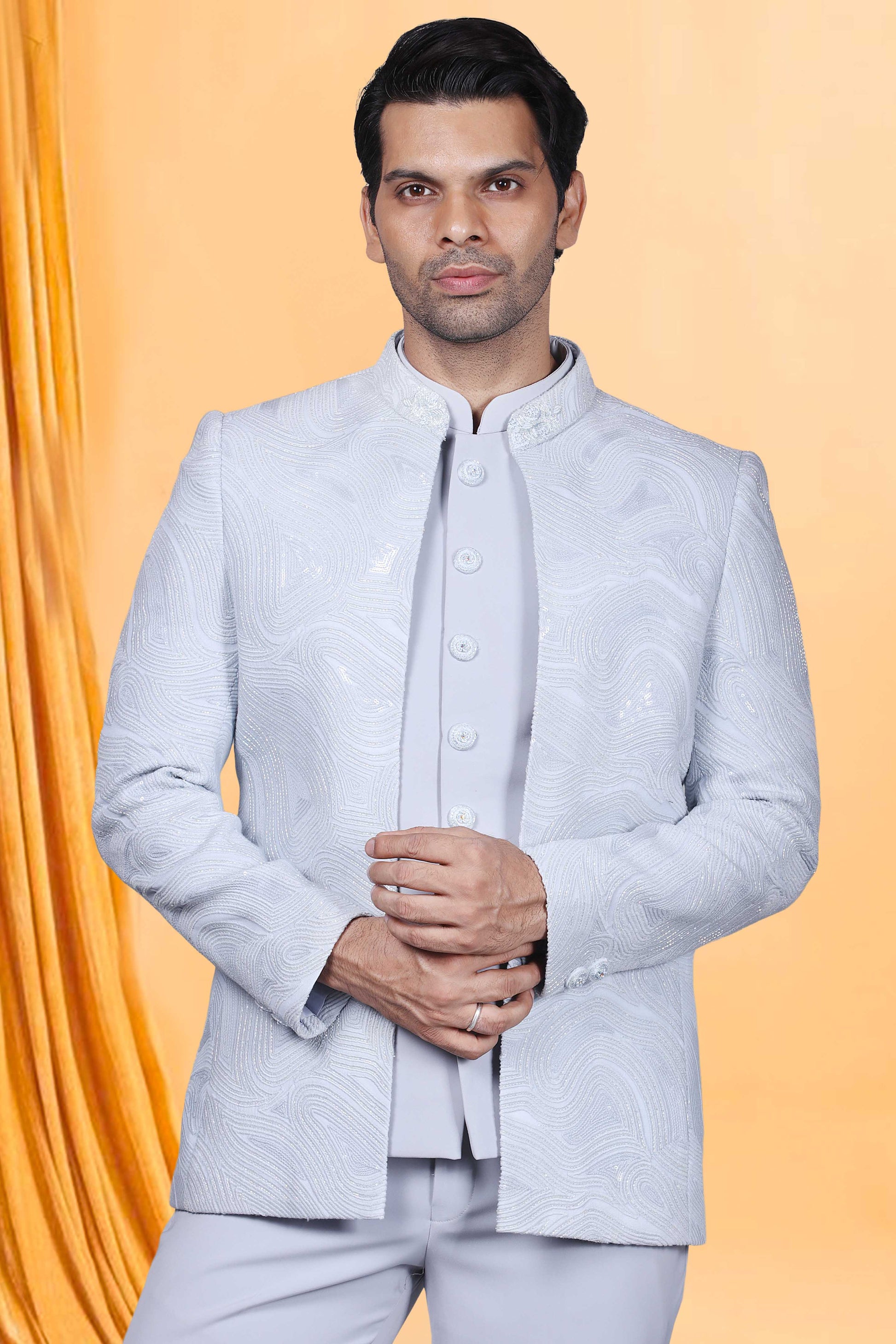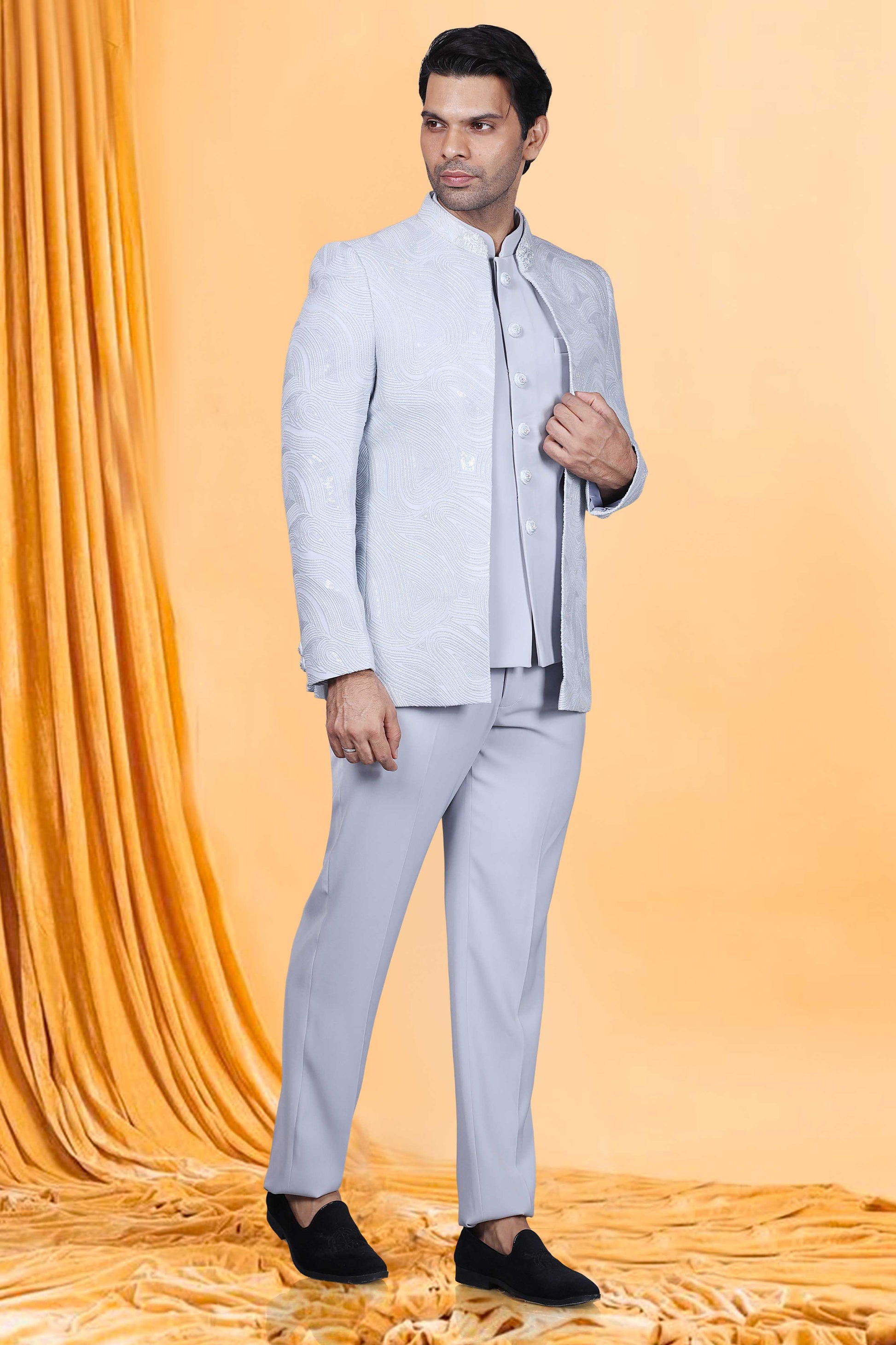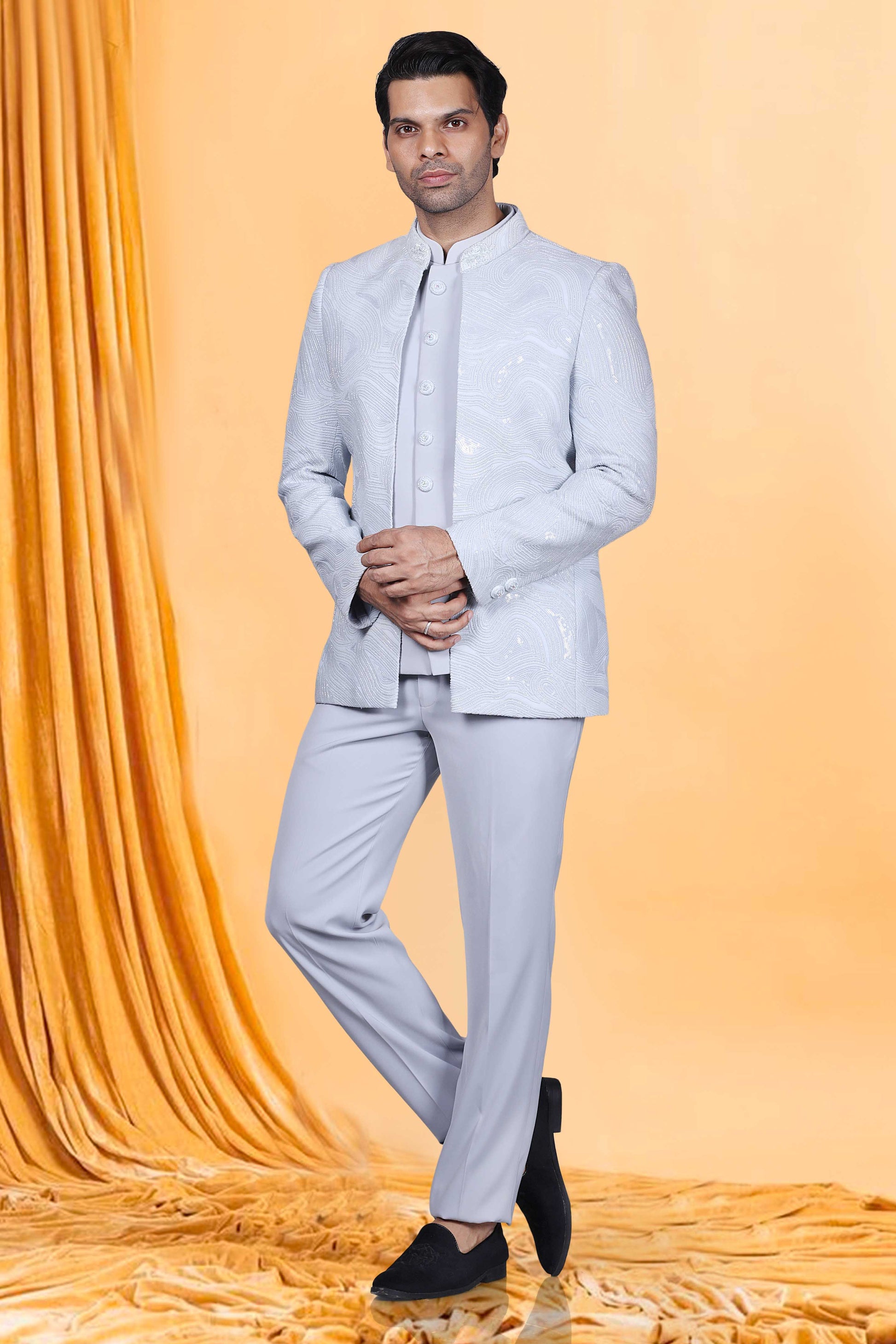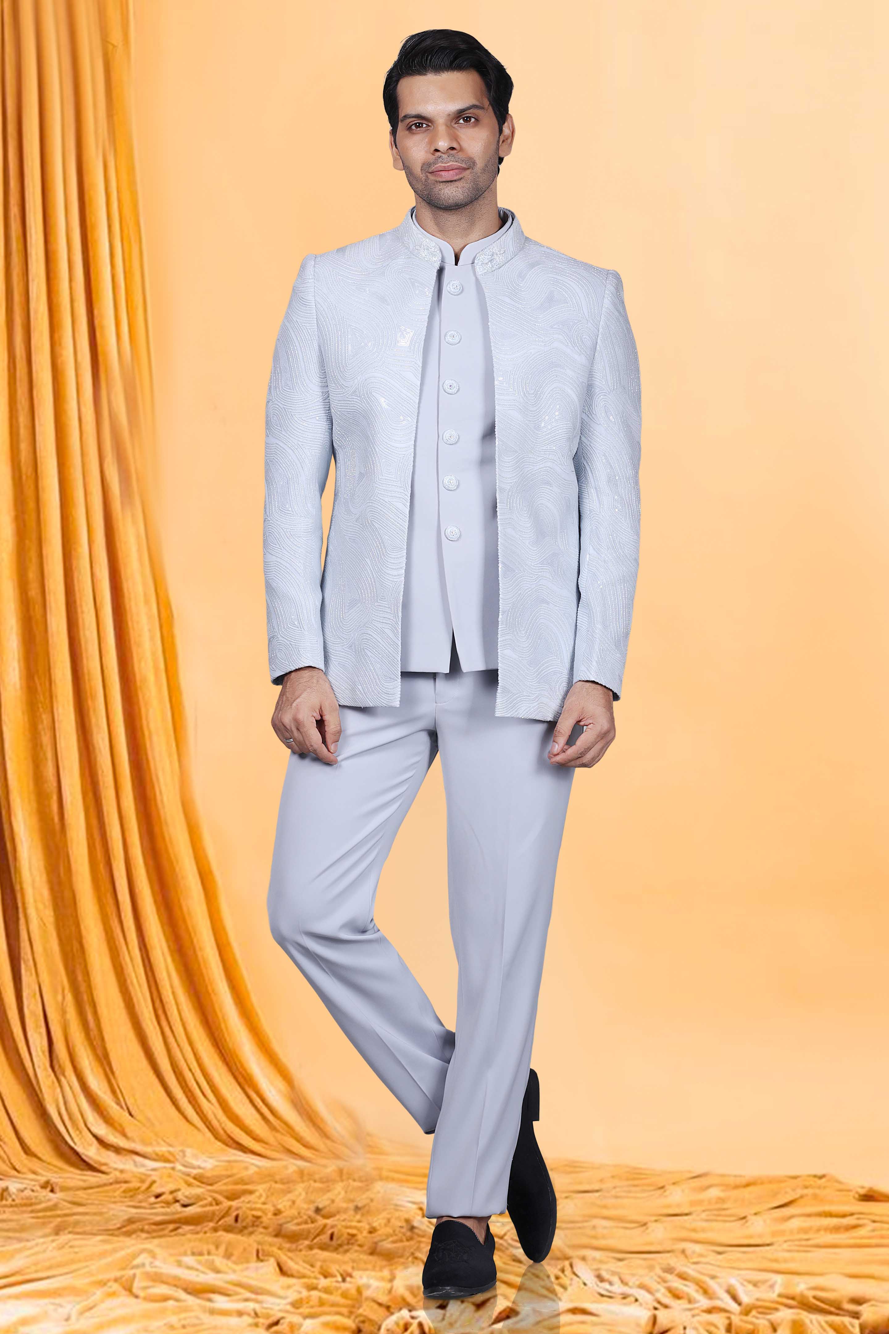 Elevate your style game with our Mens Bandhgala M42-S87. This premium piece features intricate sequence and cutdana embellishments, adding a touch of sophistication and luxury to your wardrobe. Make a statement and stand out from the crowd with this exclusive Bandhgala that exudes elegance and refinement.