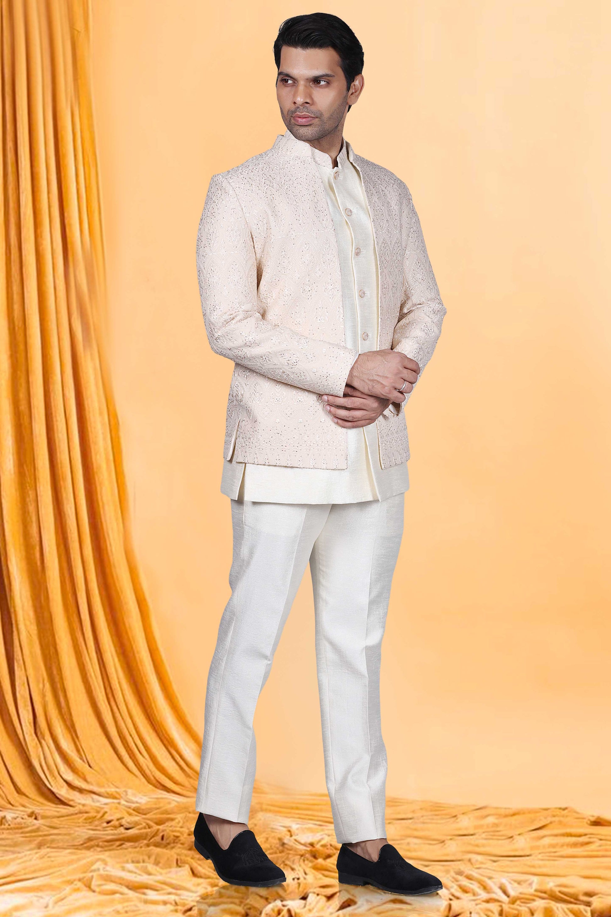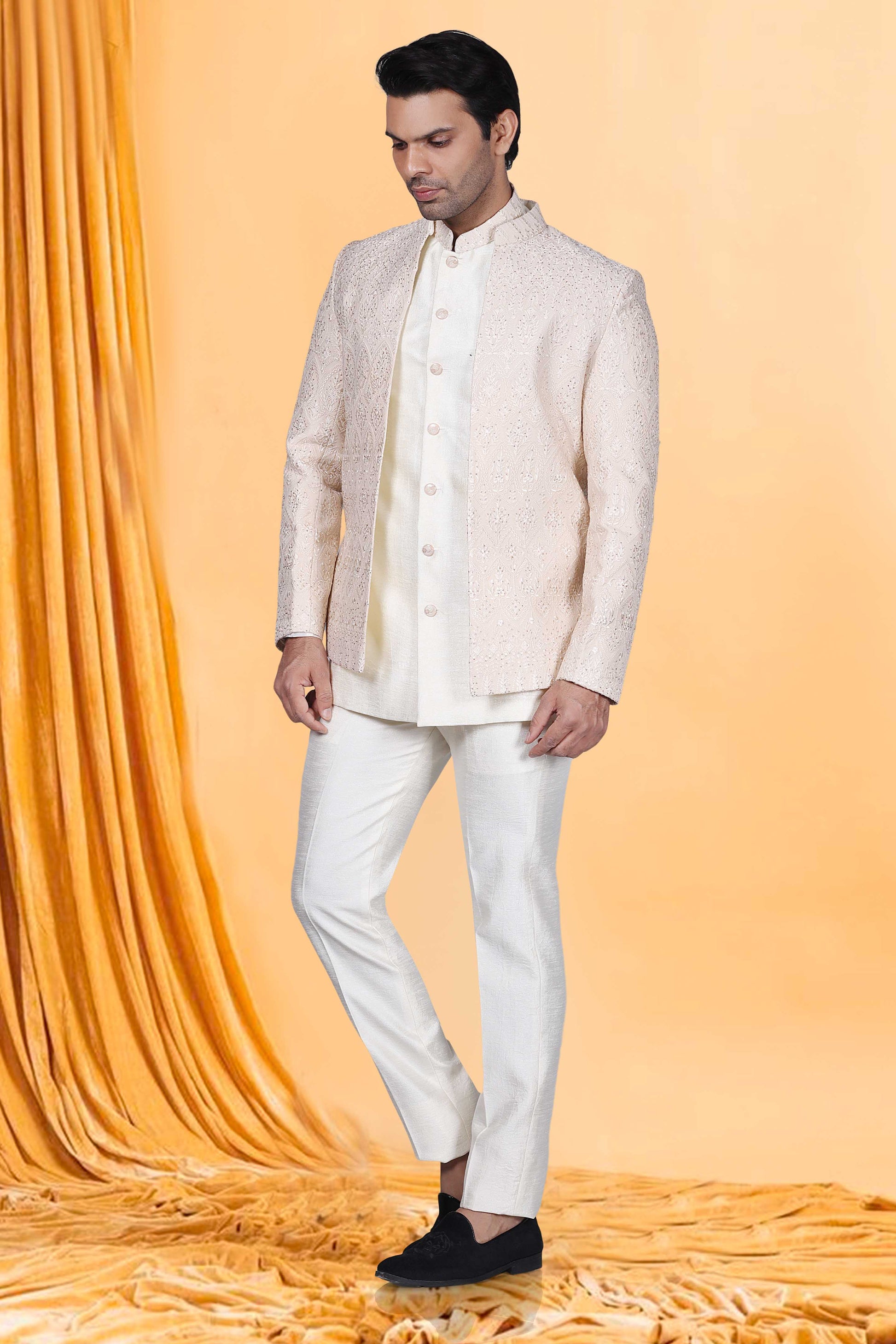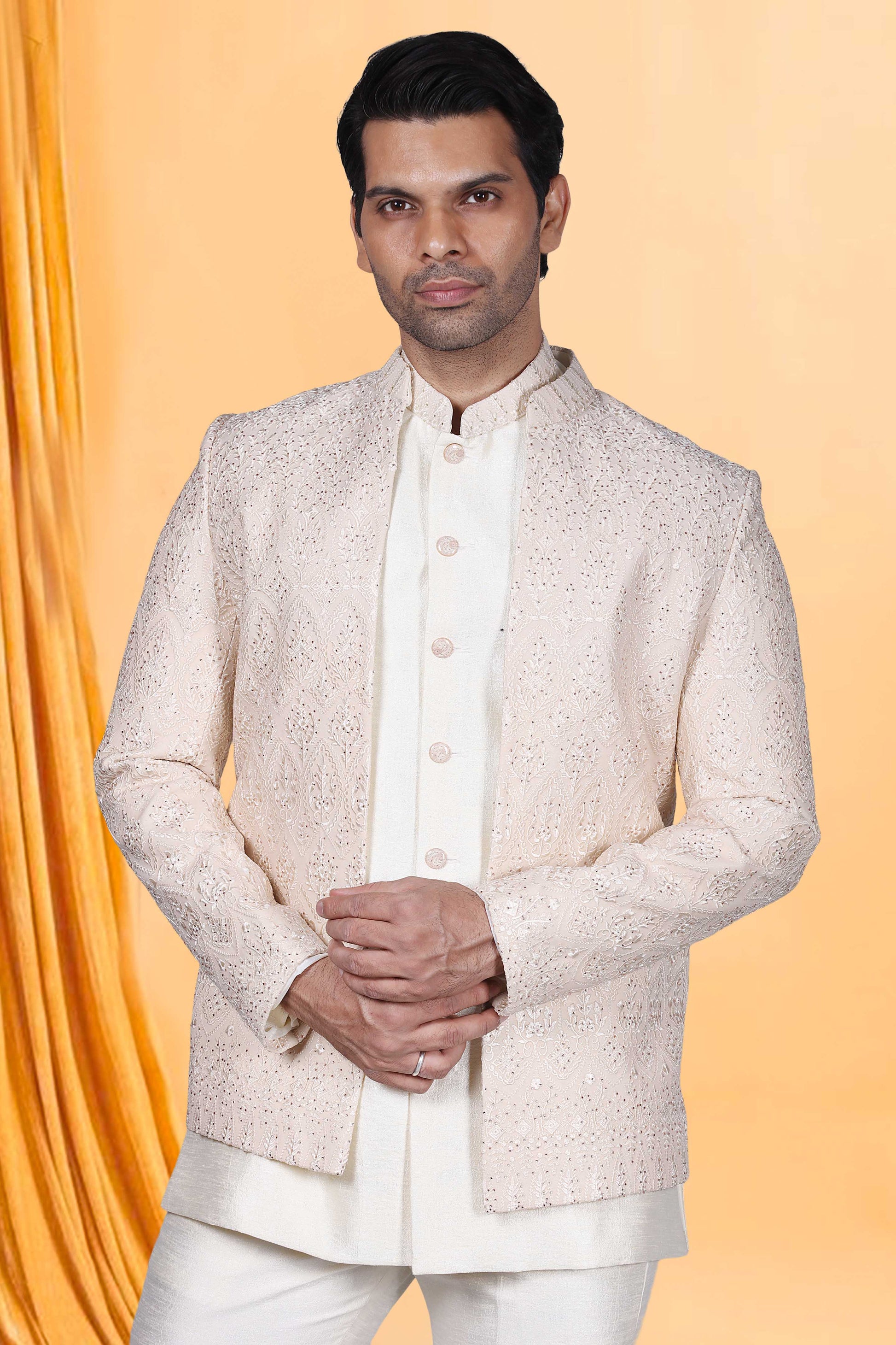 This luxurious Mens Bandhgala M42-S90 exudes elegance with its intricate thread and stone work. The open jacket design adds a touch of sophistication, making it a perfect choice for any formal occasion. Elevate your style and make a statement with this exclusive piece.