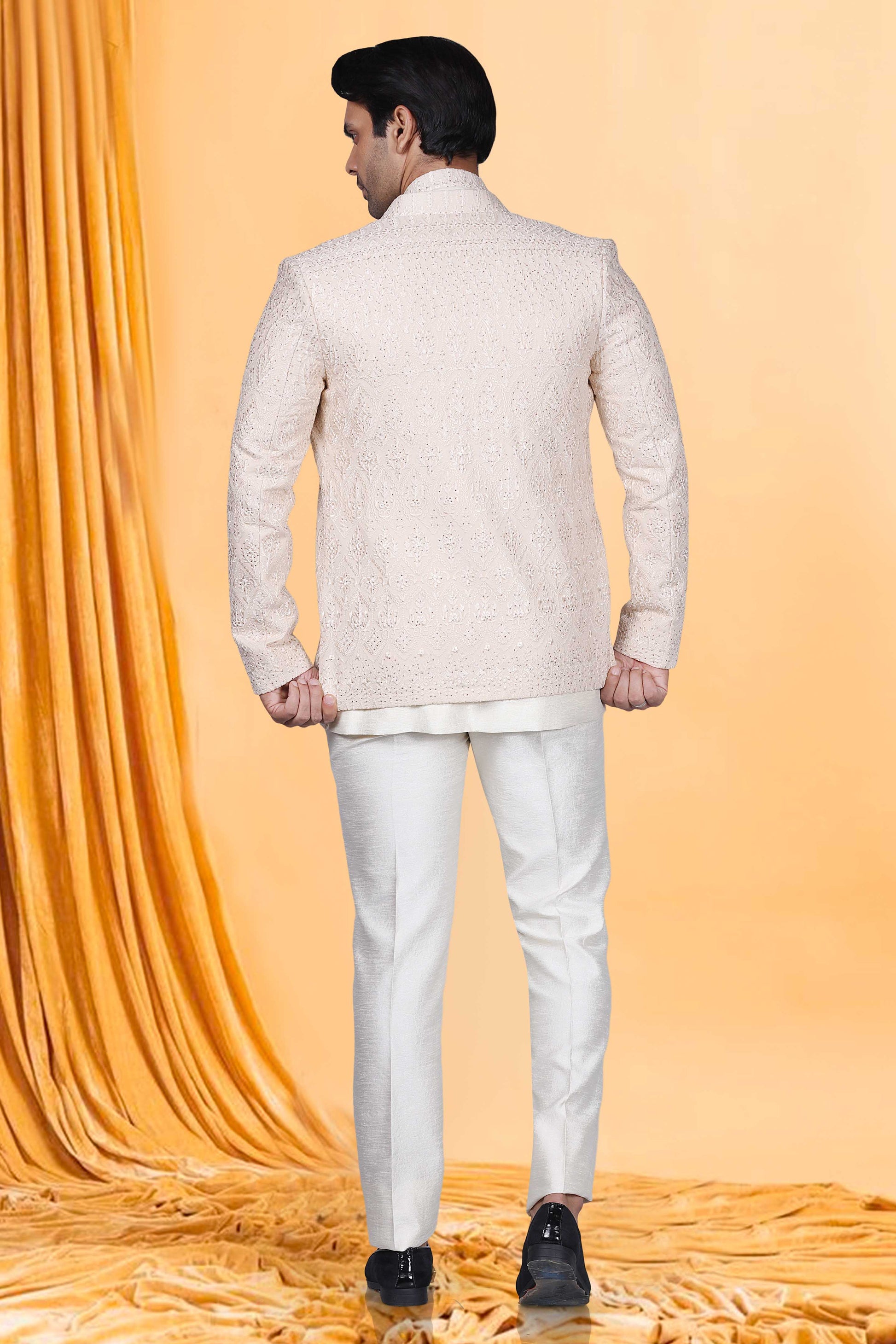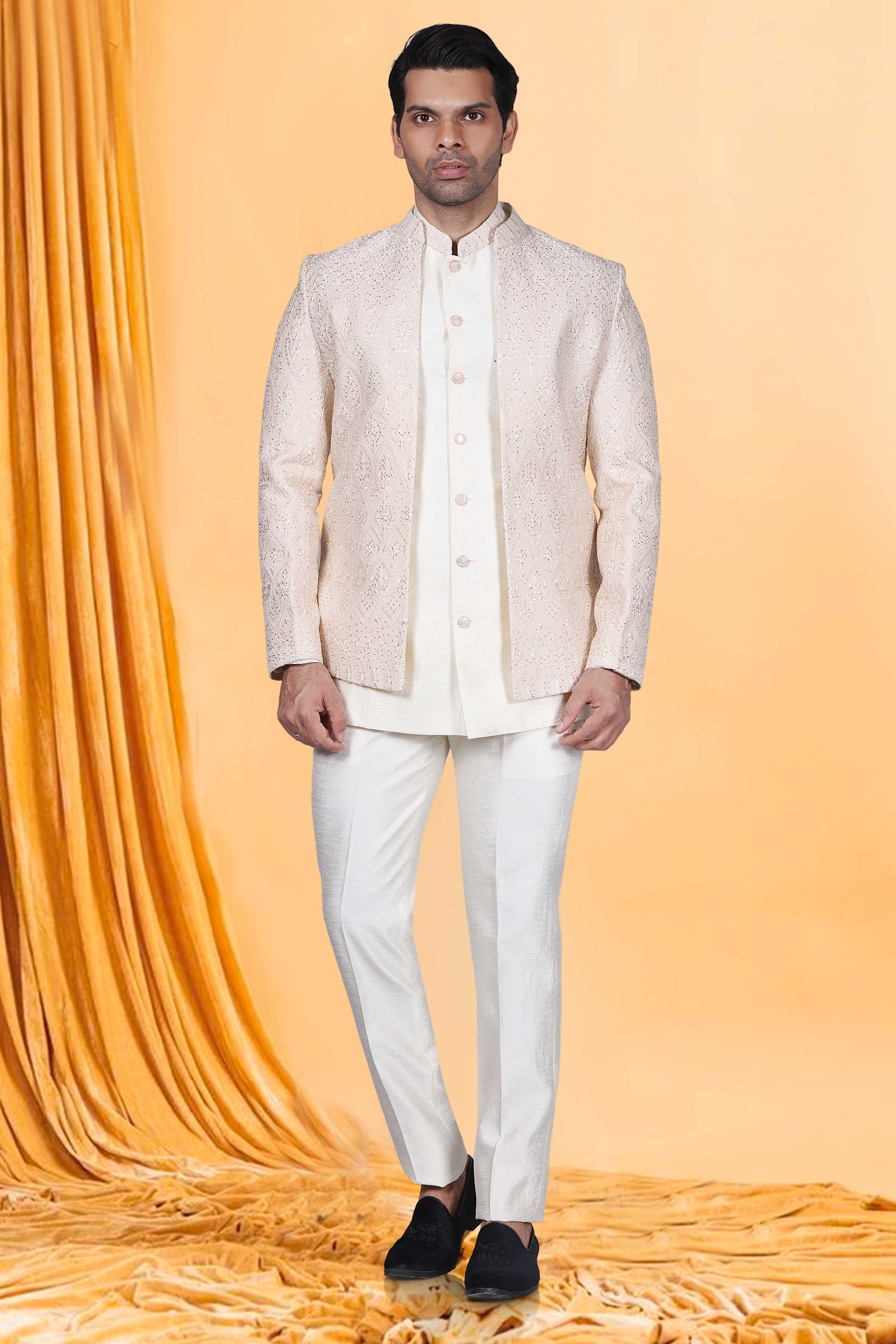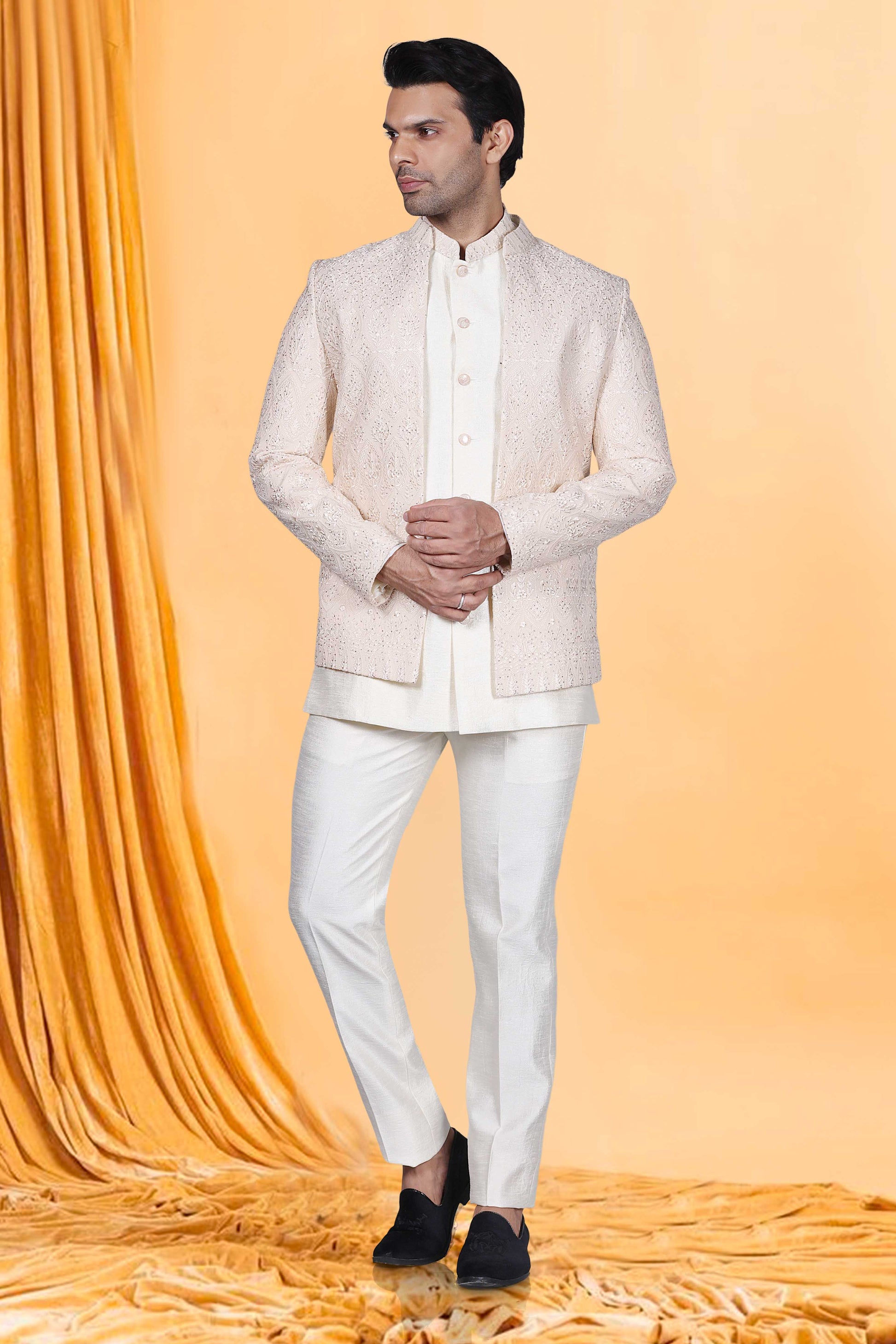 This luxurious Mens Bandhgala M42-S90 exudes elegance with its intricate thread and stone work. The open jacket design adds a touch of sophistication, making it a perfect choice for any formal occasion. Elevate your style and make a statement with this exclusive piece.