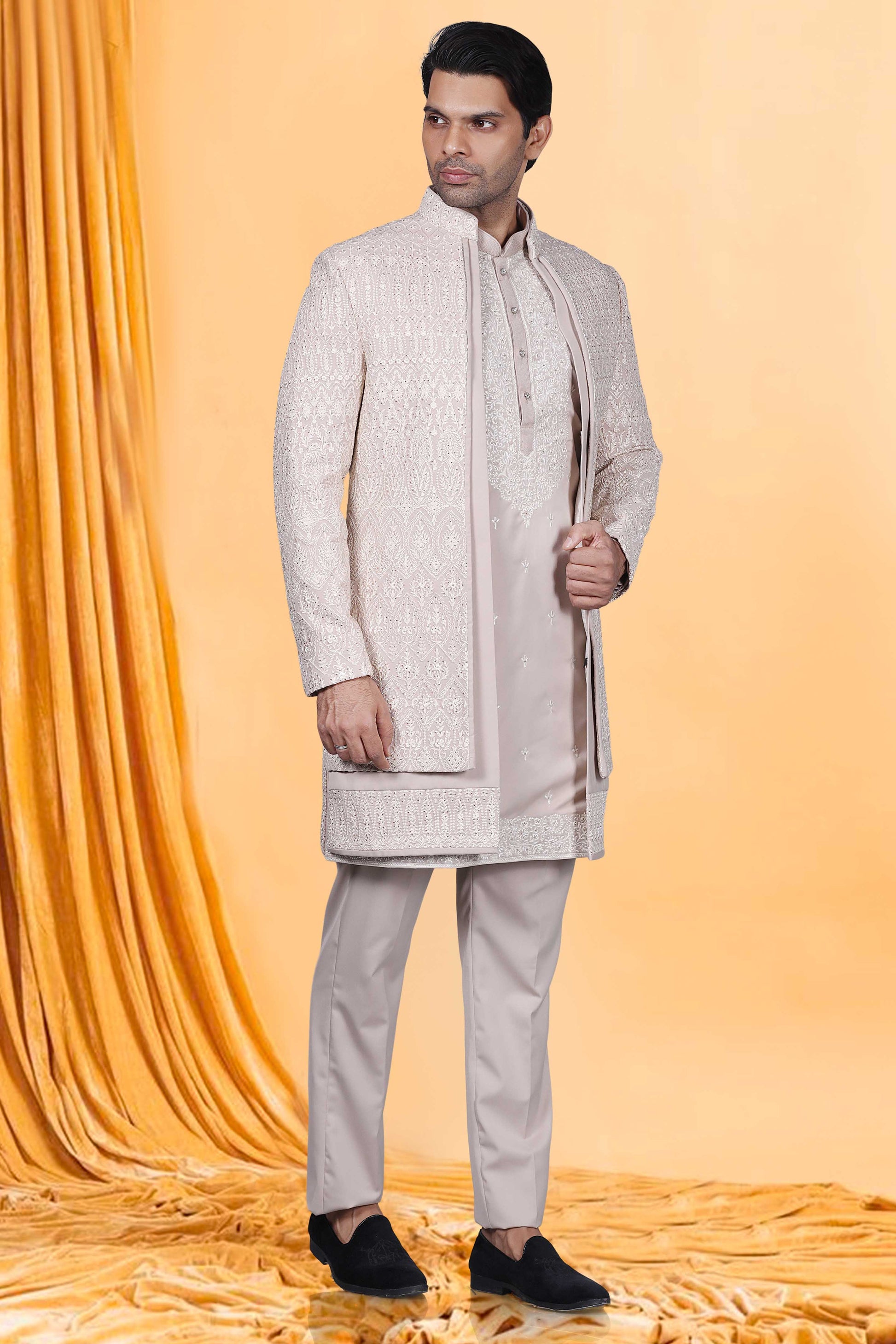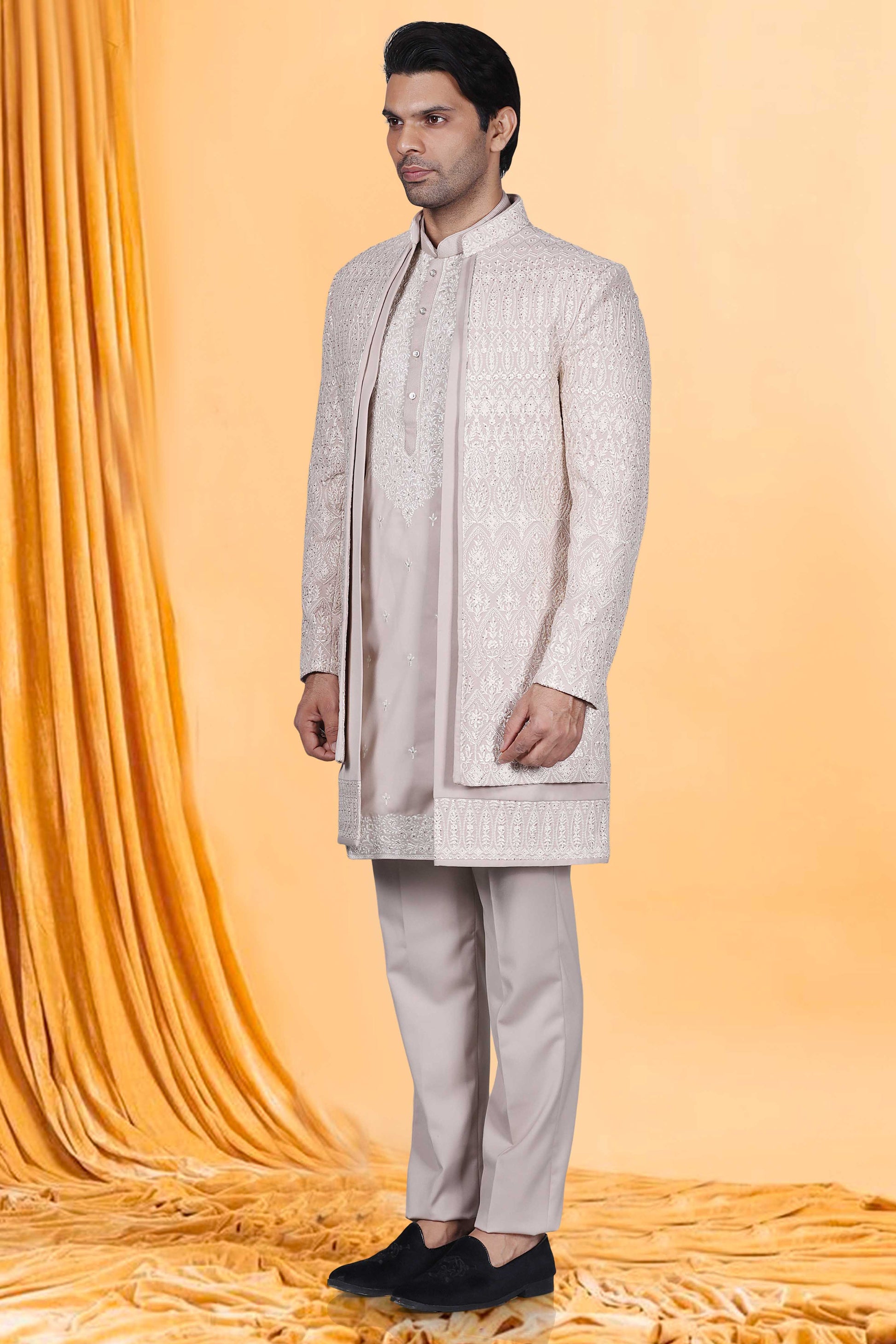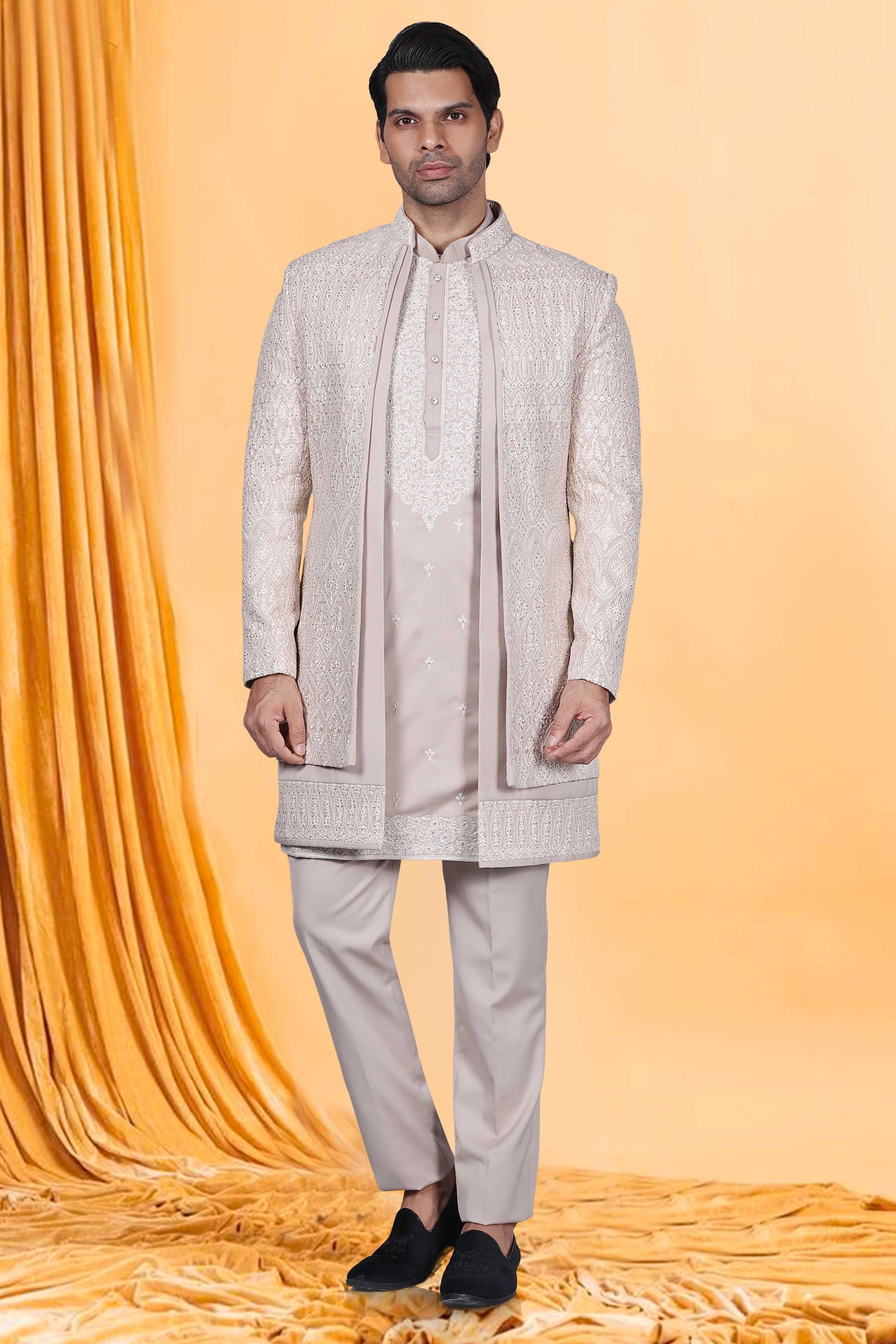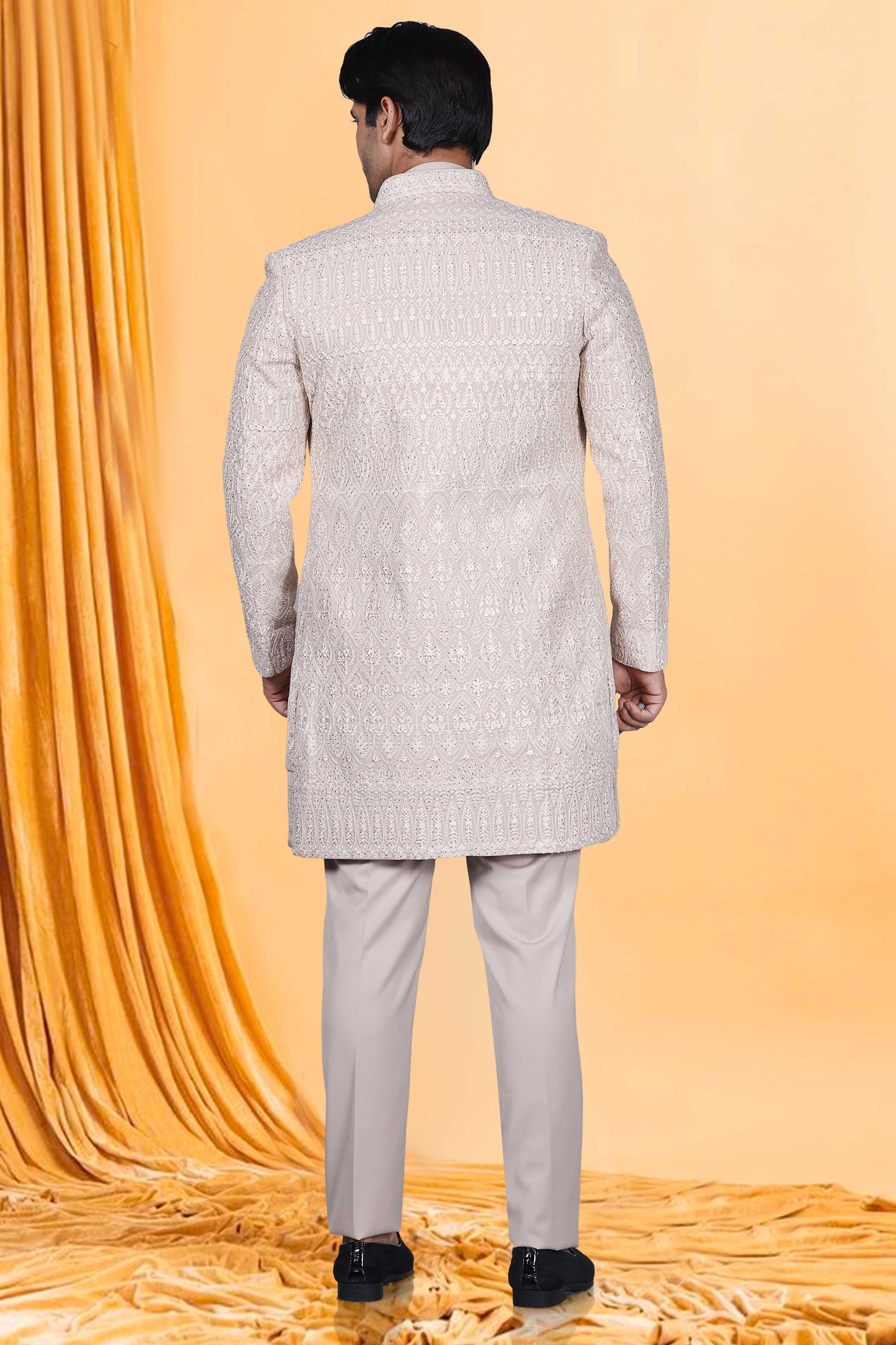 This mens sherwani exudes sophistication and luxury with its open jacket design and exquisite stone and thread work. Elevate any special occasion with this elegant and exclusive garment, designed to make you stand out and showcase your refined taste. A true work of art in men's fashion.