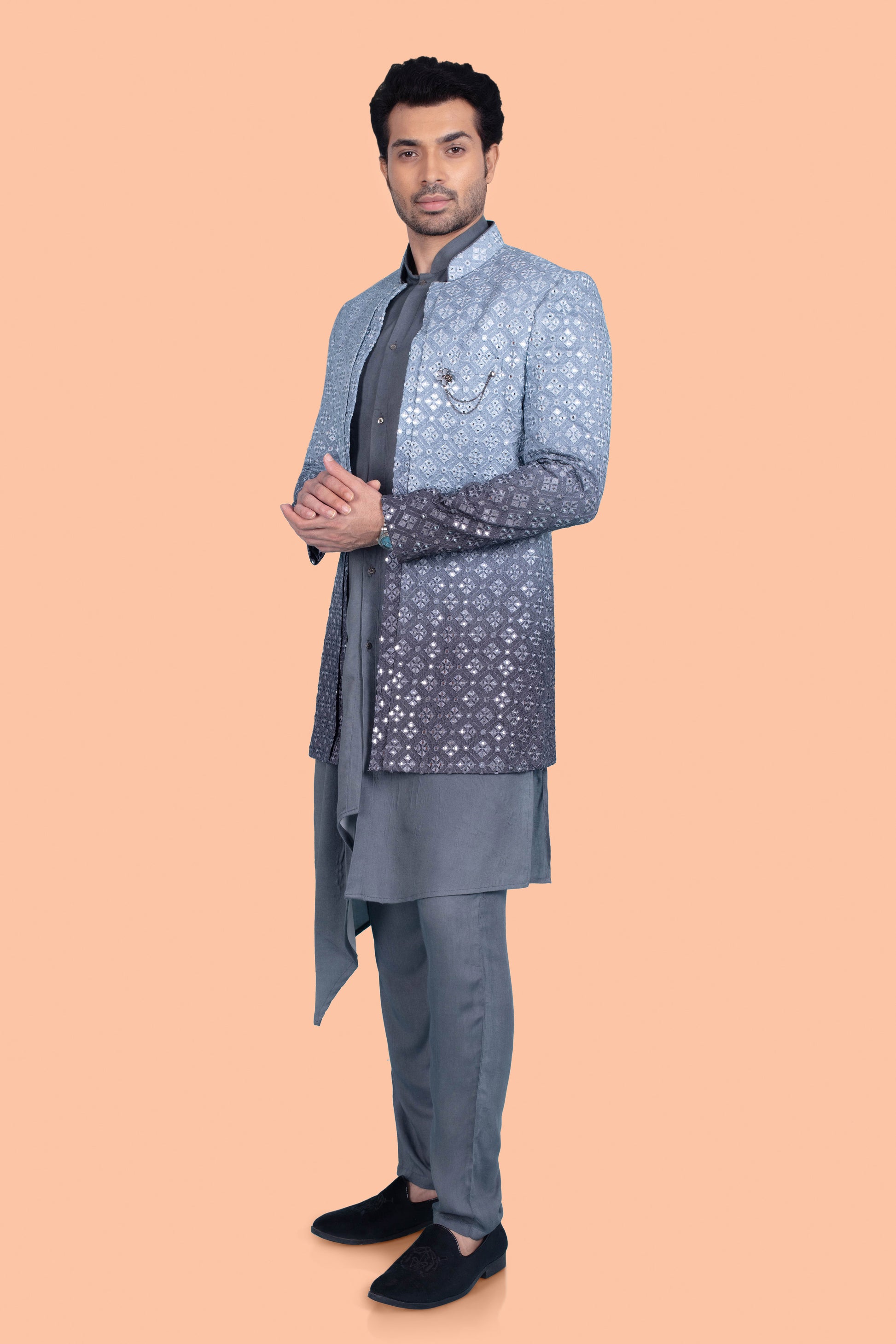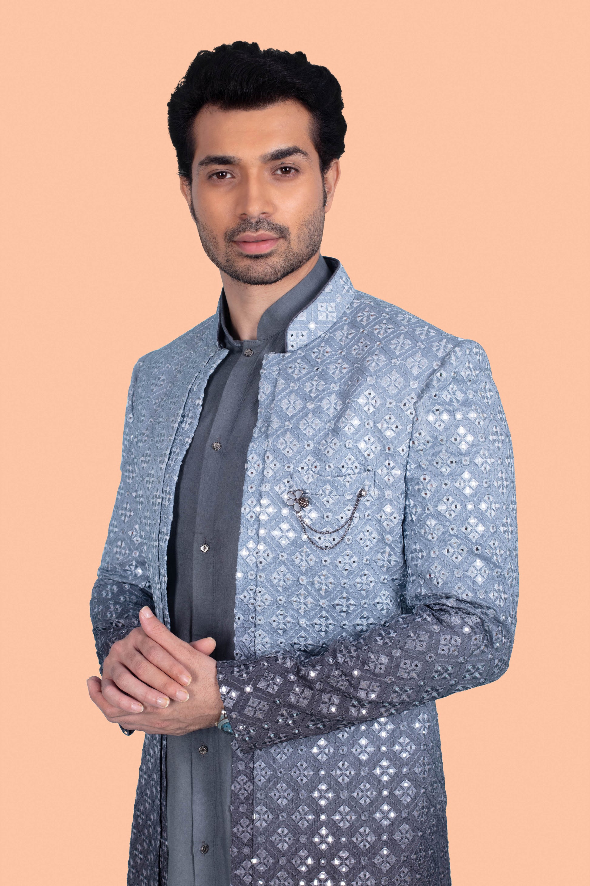 "Experience timeless tradition with our Mens Sherwani S86-S3. This stunning piece features intricate mirror work and an open jacket design, adding a touch of elegance to your attire. Embrace the richness of culture and elevate your style with this Sherwani."