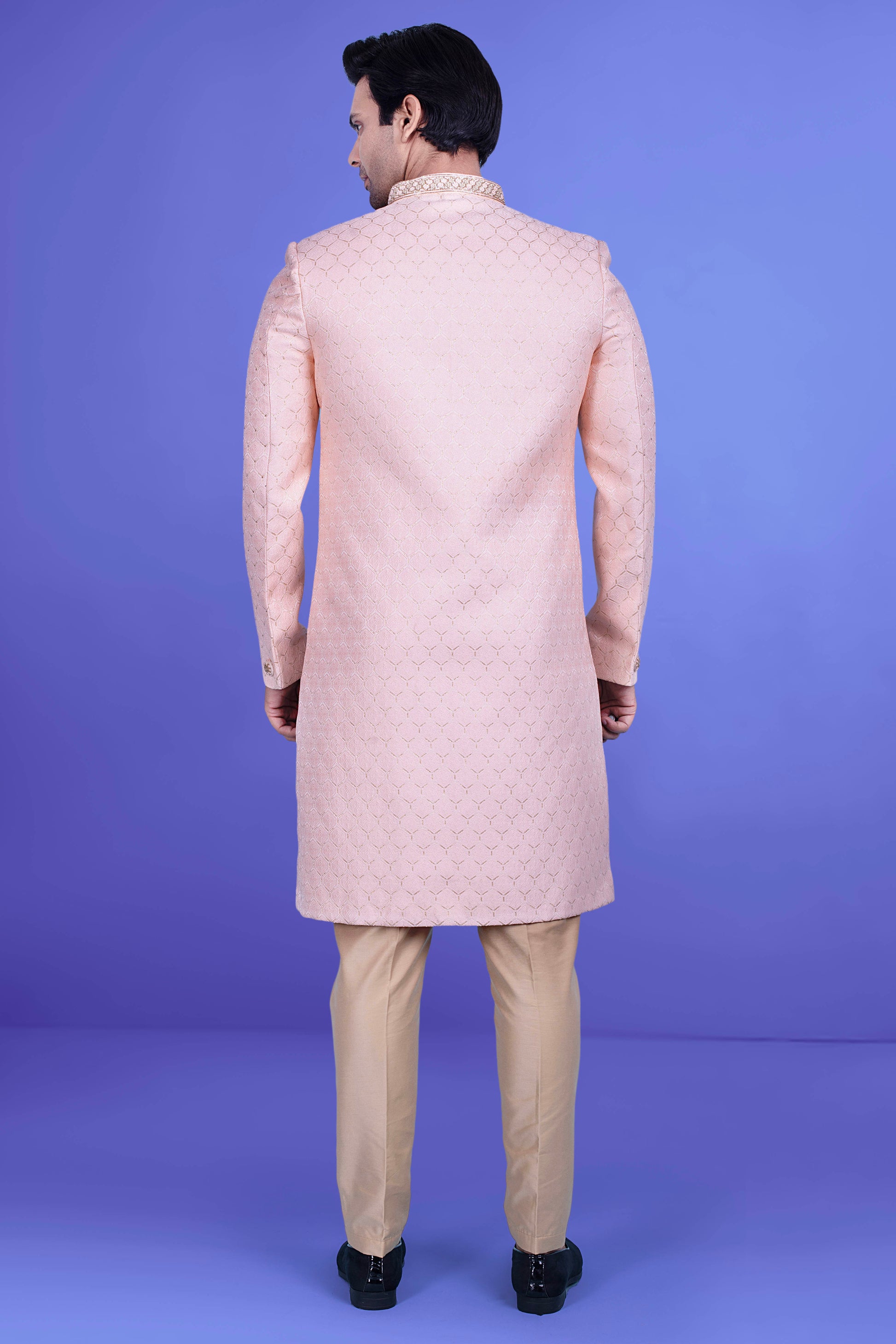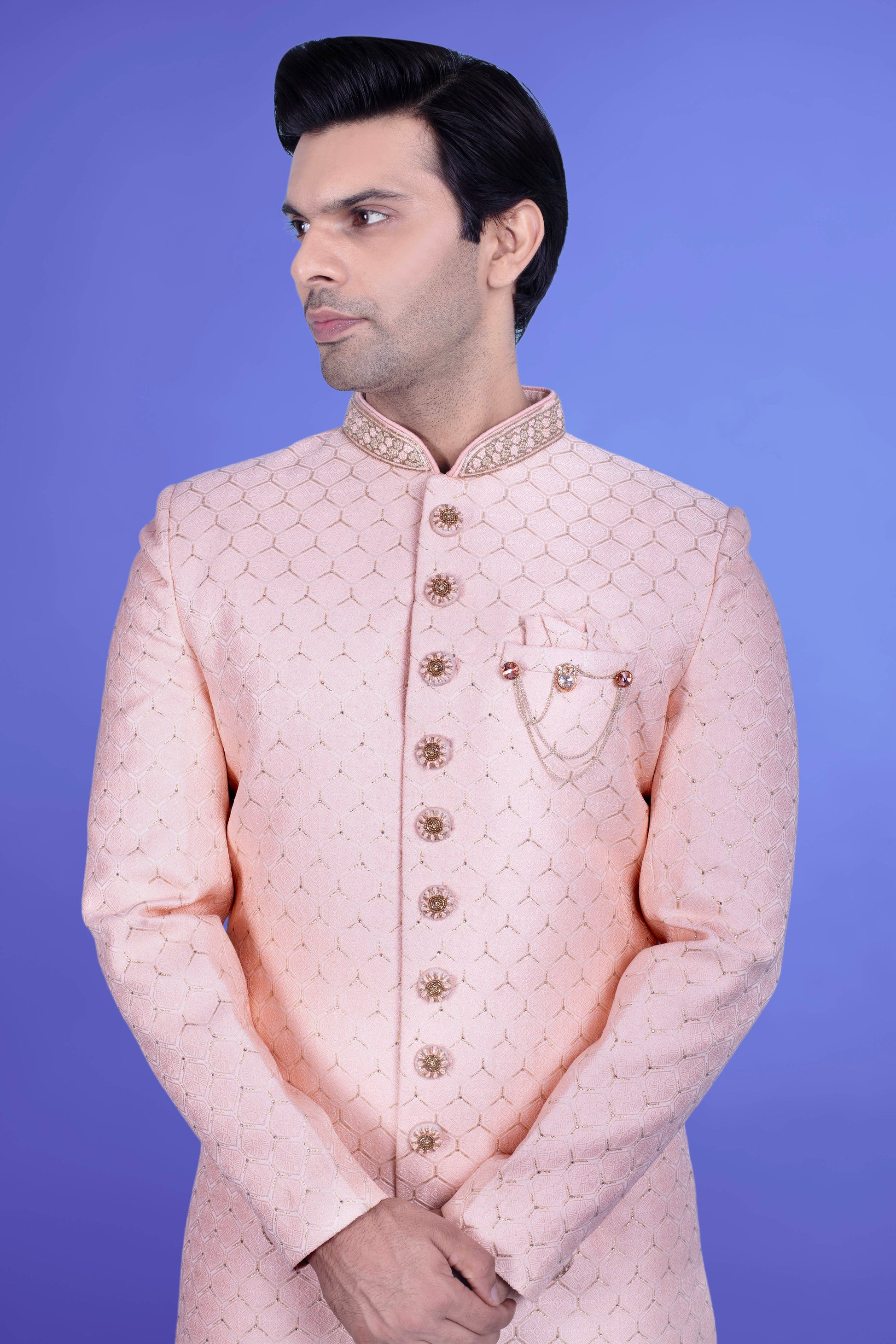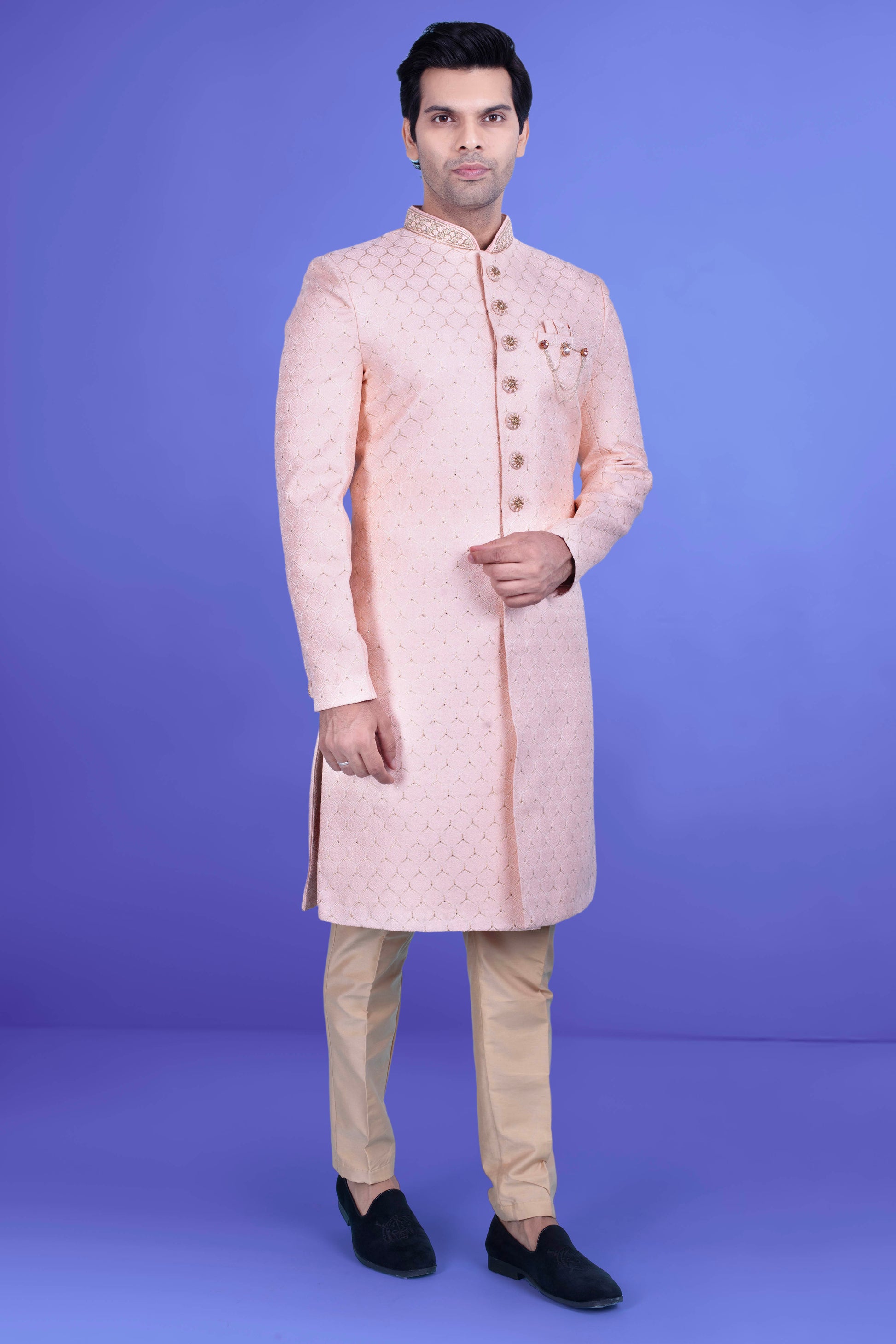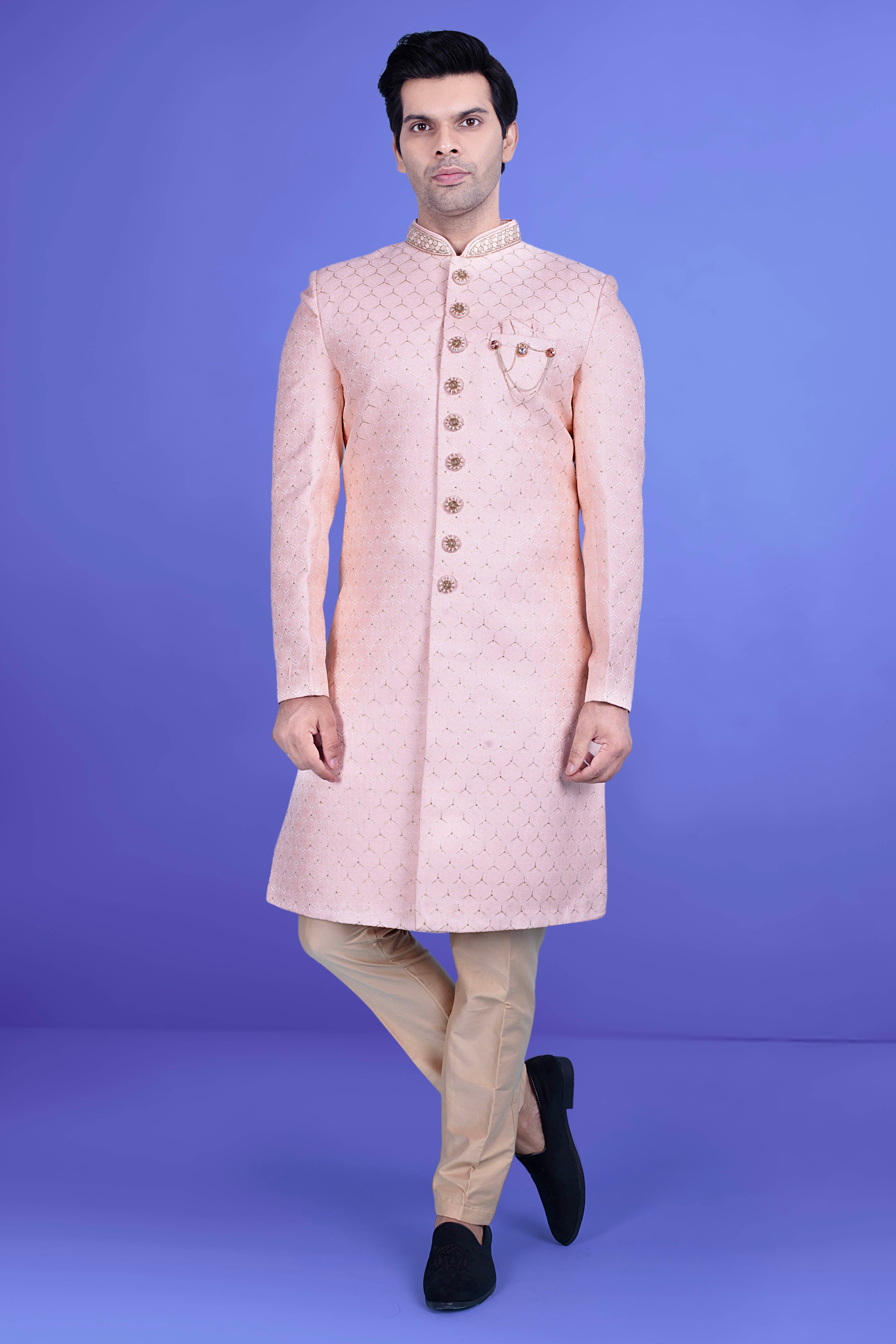 Indulge in luxury and elegance with our Mens Sherwani U2-S210. Made with exquisite brocade and adorned with stunning stone work, this traditional garment exudes royalty. Elevate your style and make a statement at any occasion. Experience the opulence that our Sherwani offers and leave a lasting impression.
