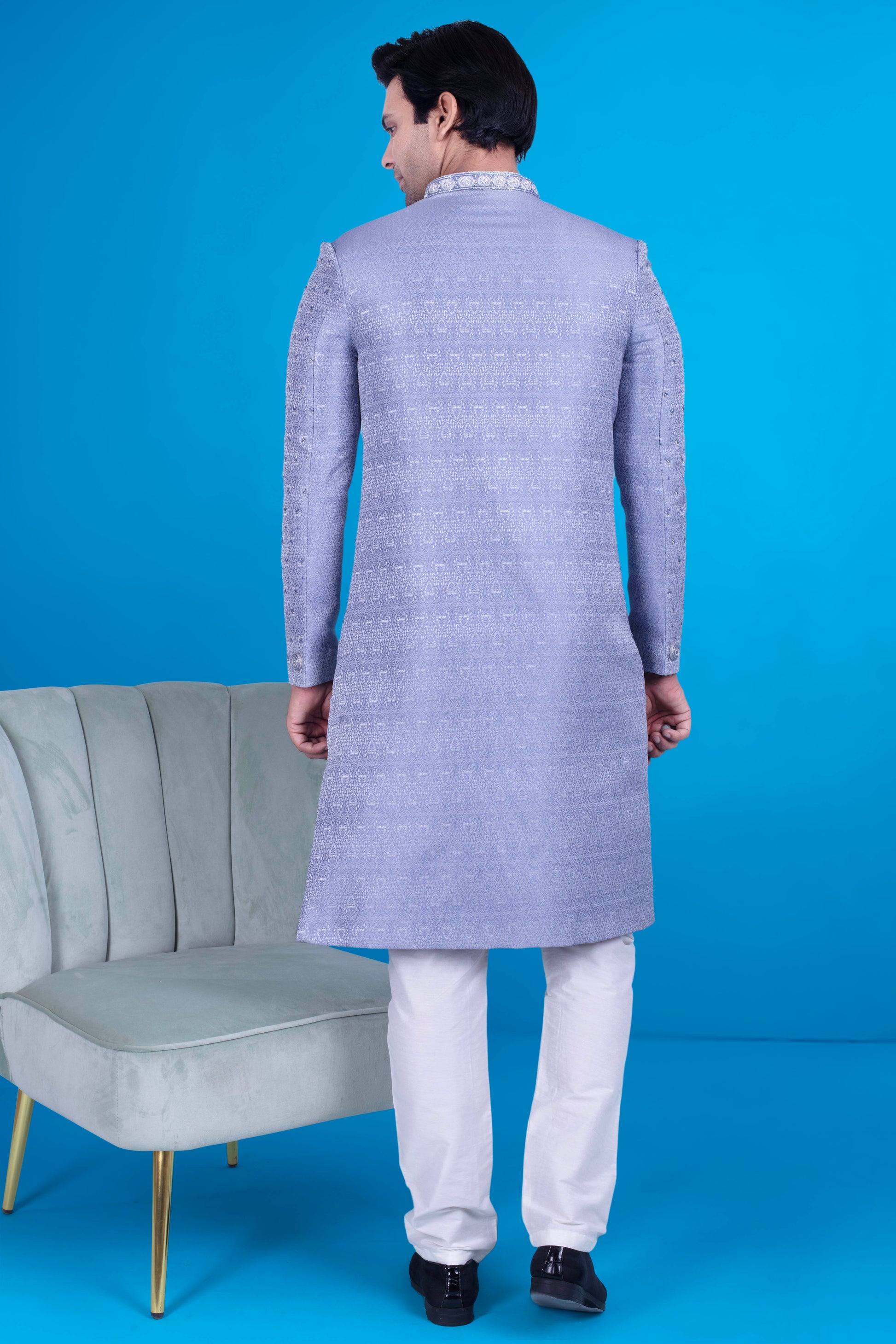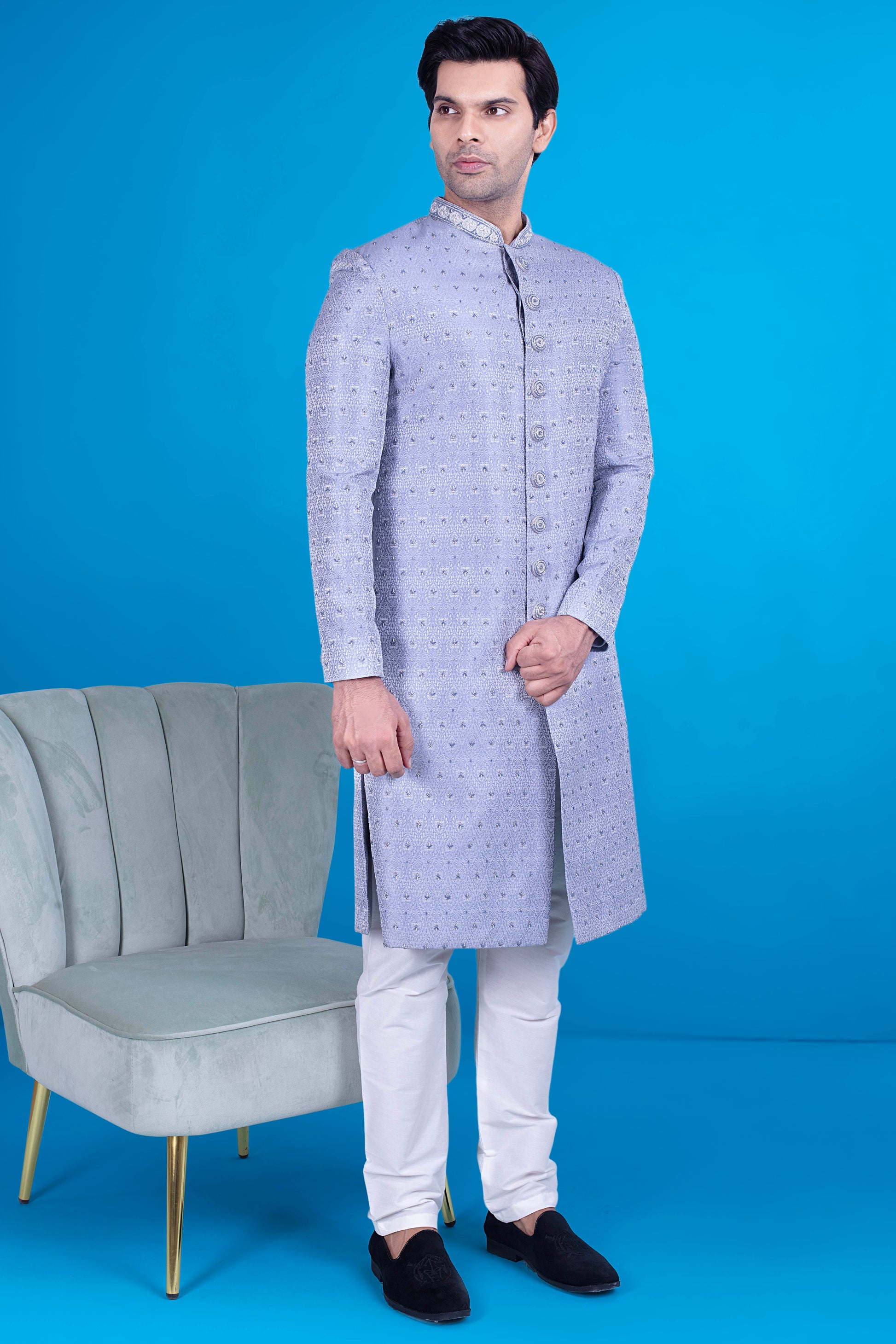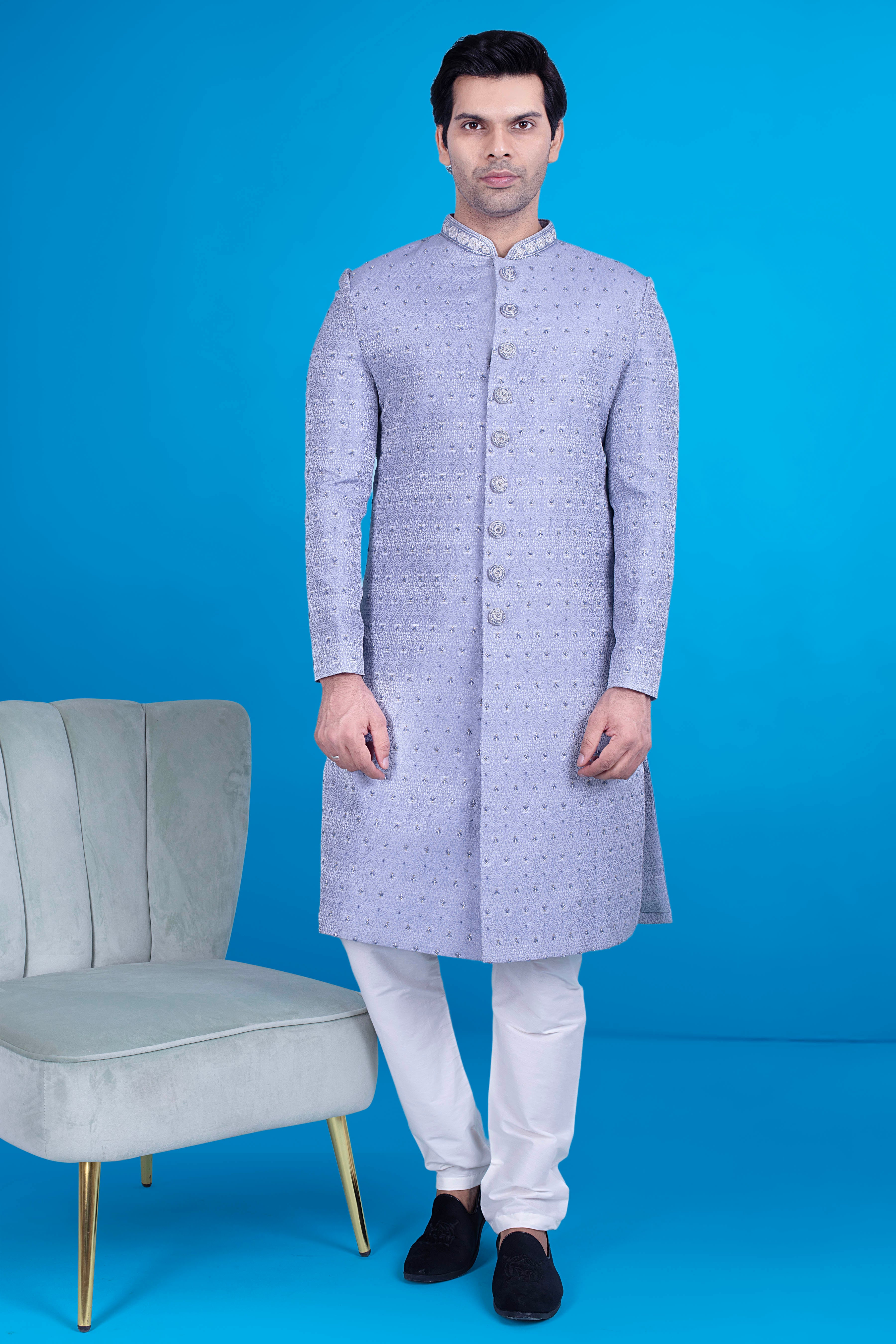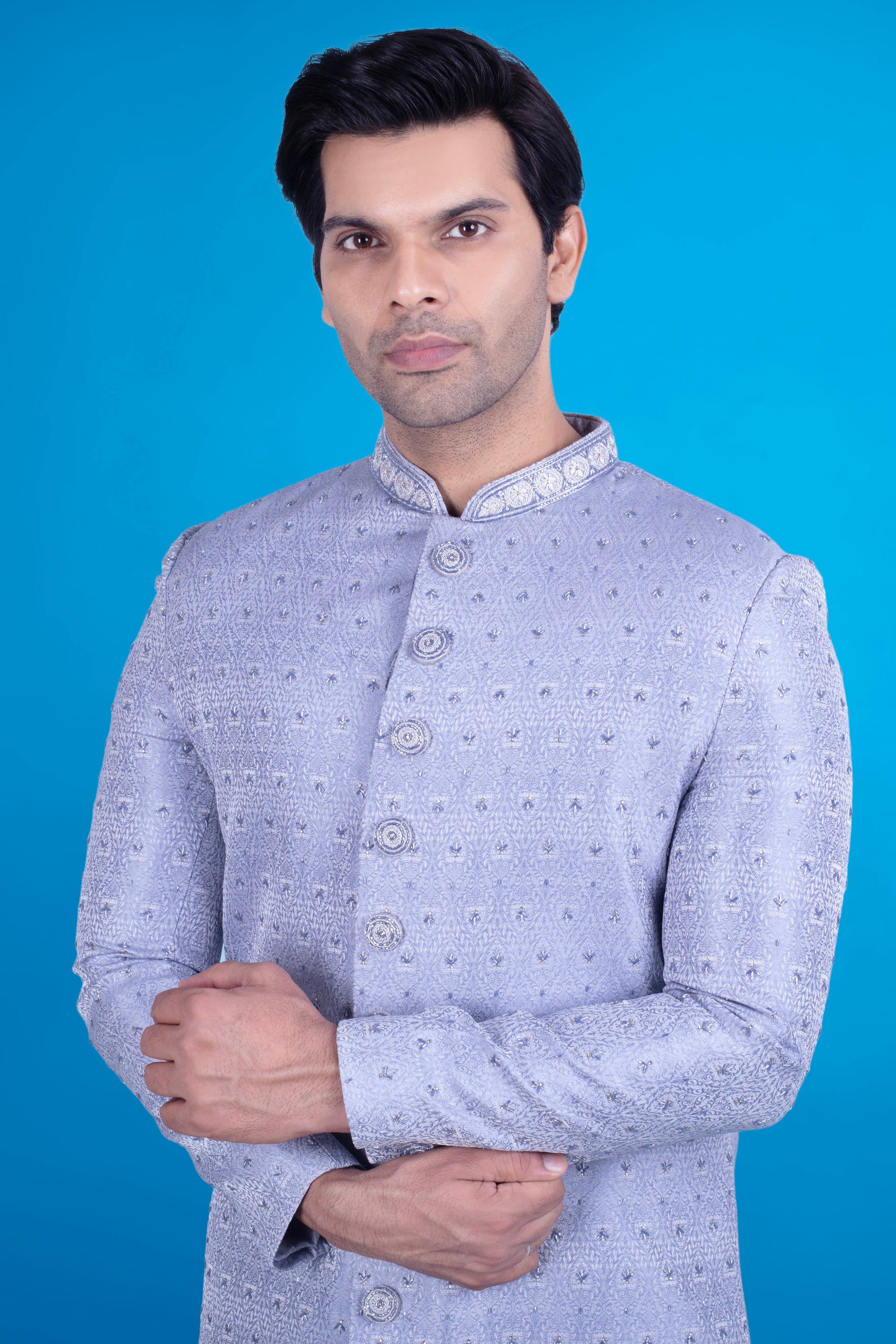 Inspired by the rich elegance of traditional Indian fashion, our Mens Sherwani U2-S213 is a showstopper. Adorned with intricate brocade, cutdana, and gold stone work, this piece exudes luxury and sophistication. Make a statement at any special occasion and feel like royalty in our Sherwani.