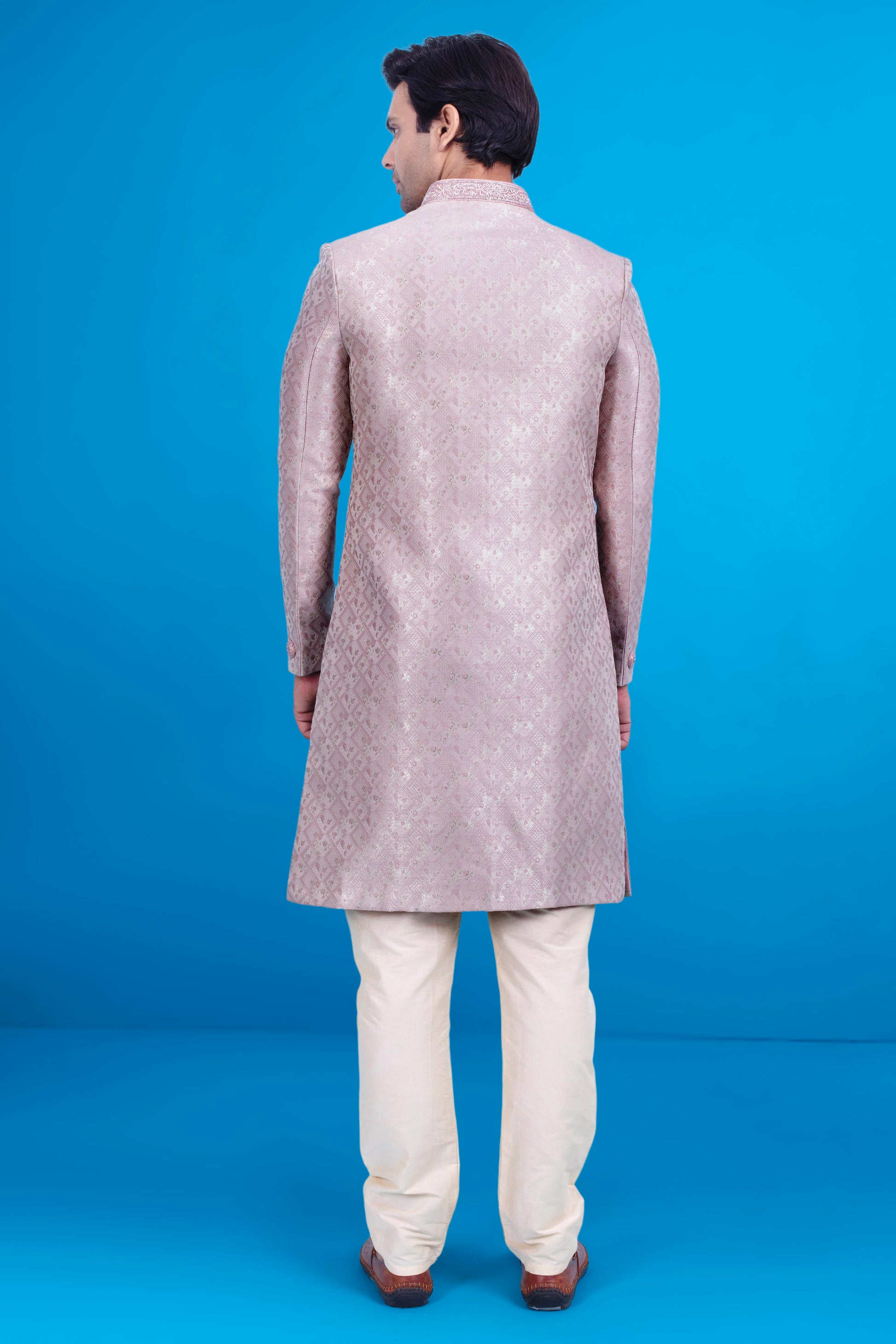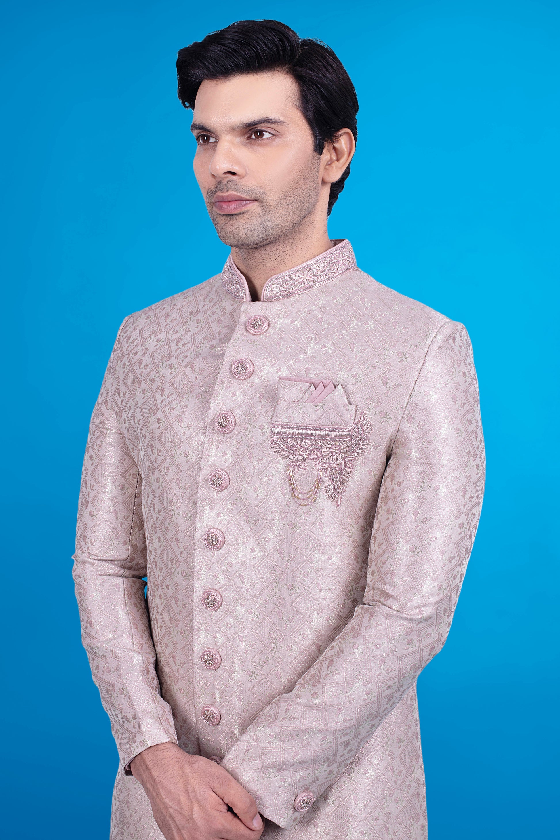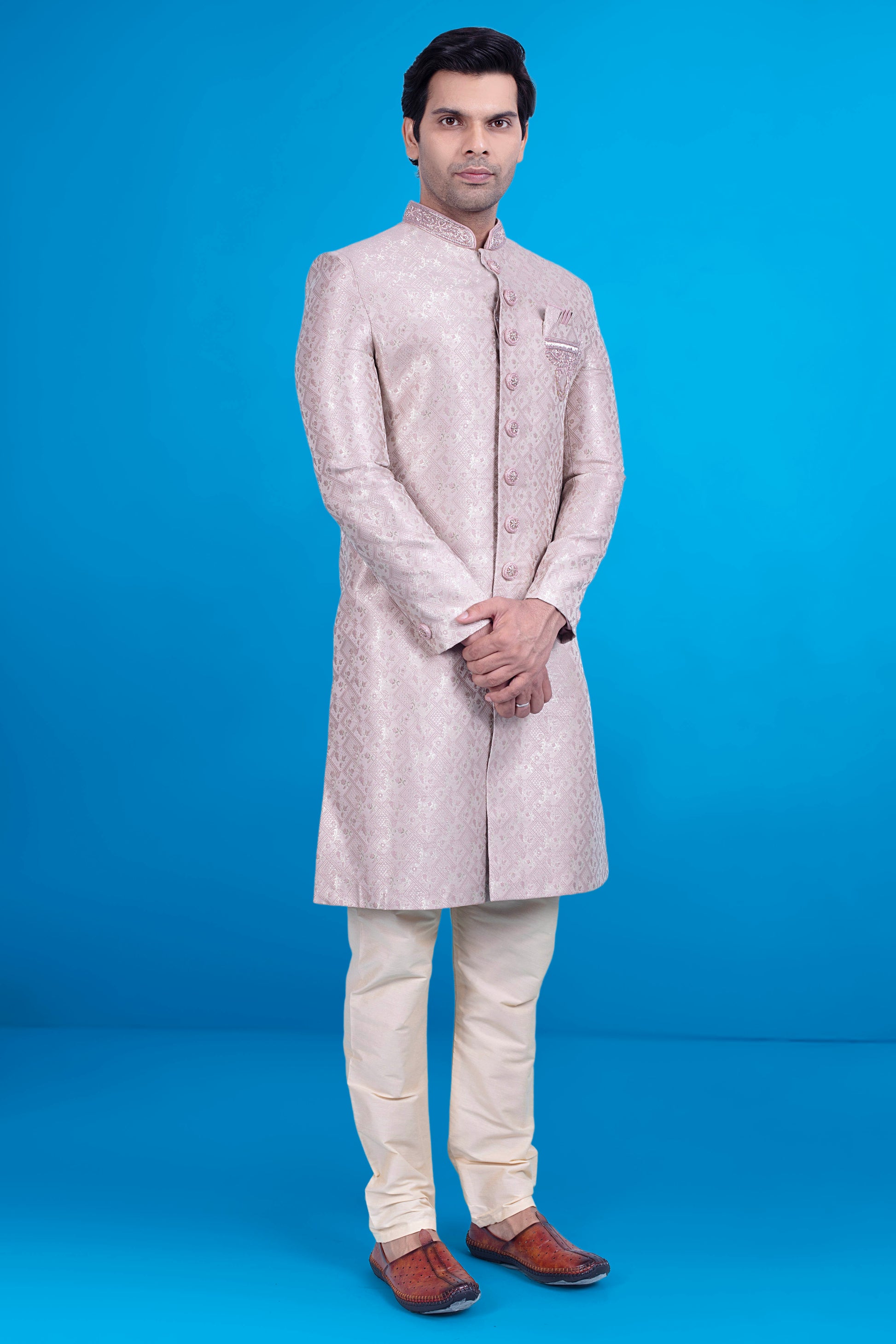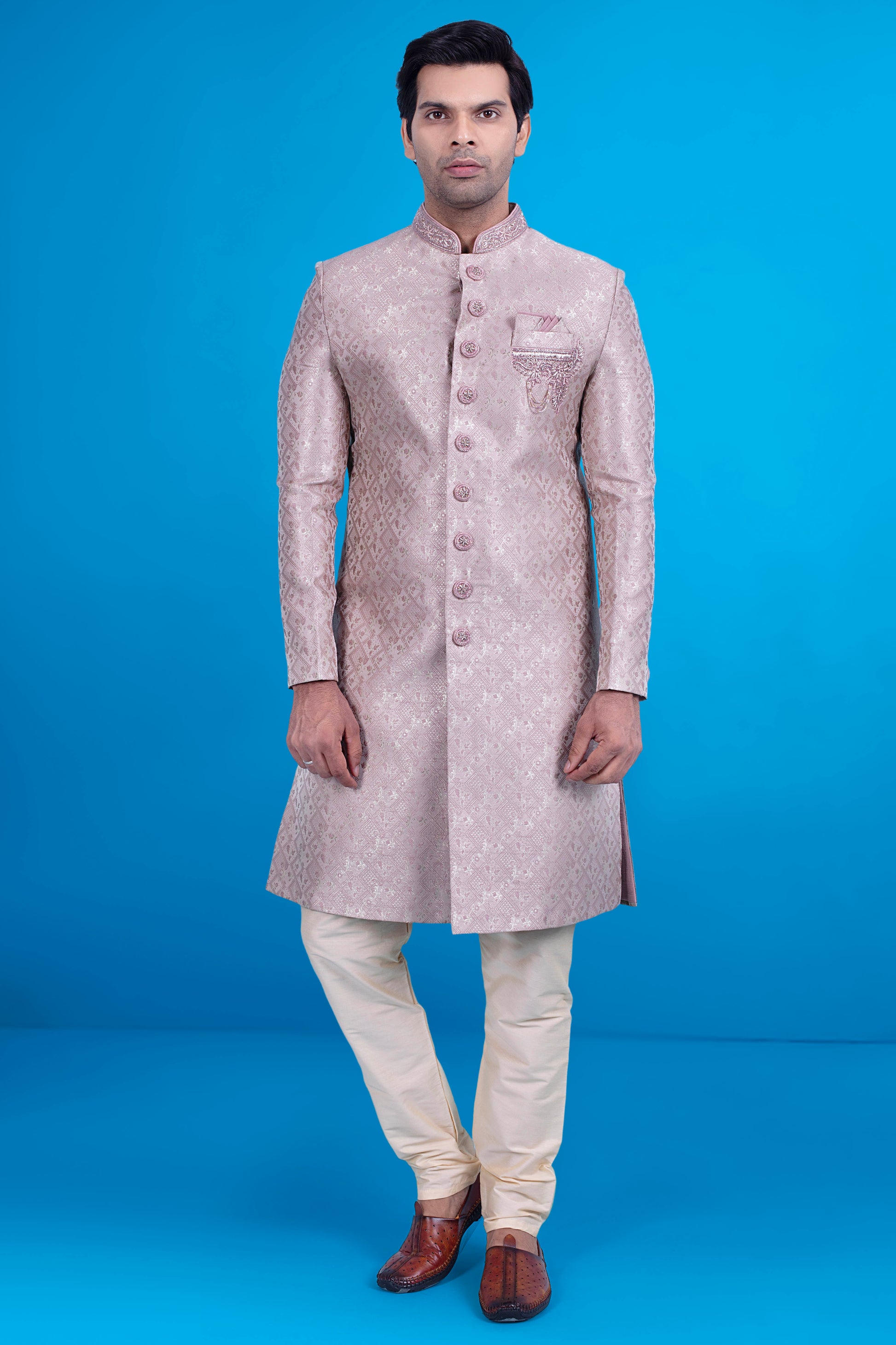 This mens sherwani U2-S222 is expertly crafted with luxurious brocade silk, providing a sleek and elegant look. Perfect for special occasions, the fabric offers a regal feel while ensuring ultimate comfort. Upgrade your wardrobe with this sophisticated piece.