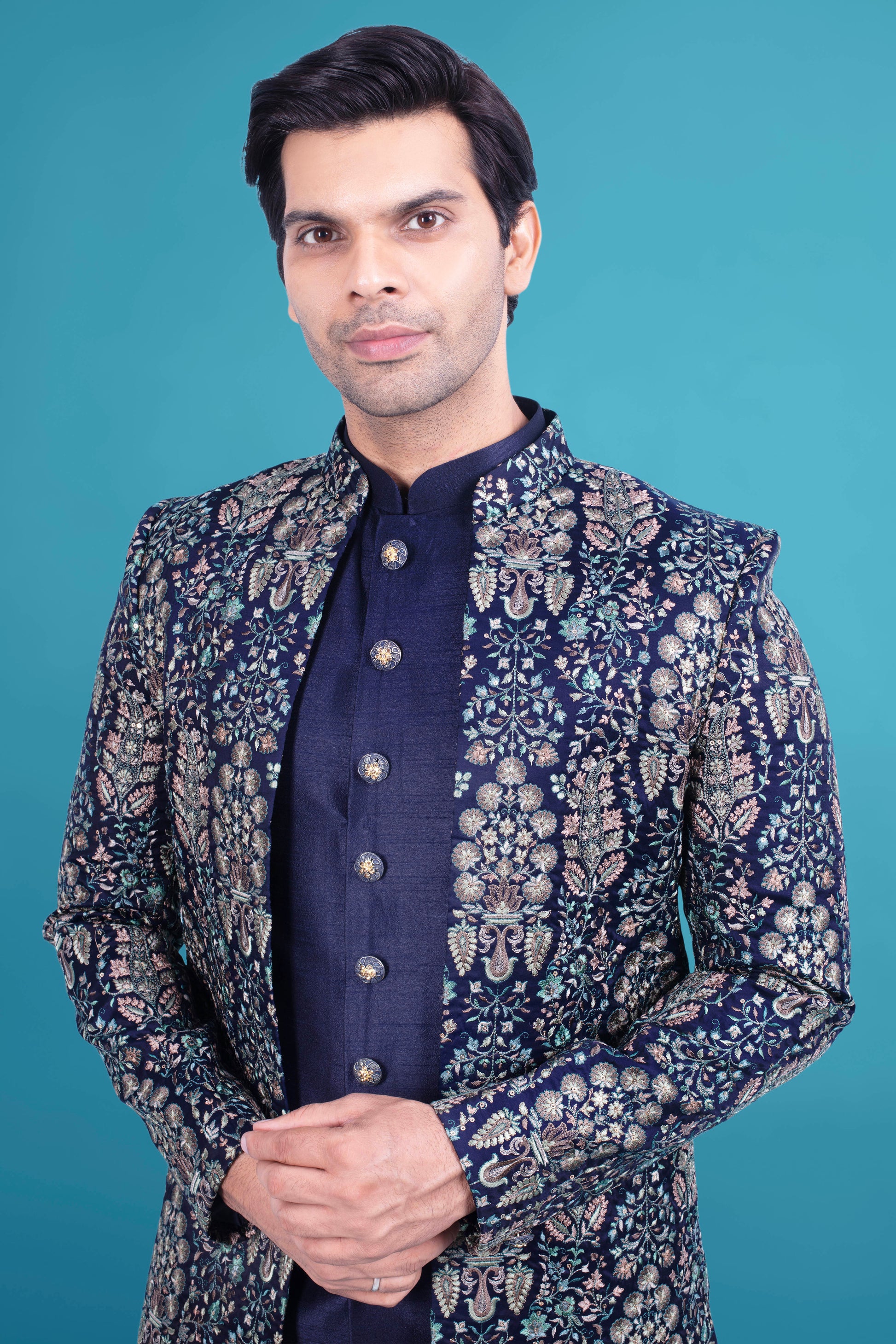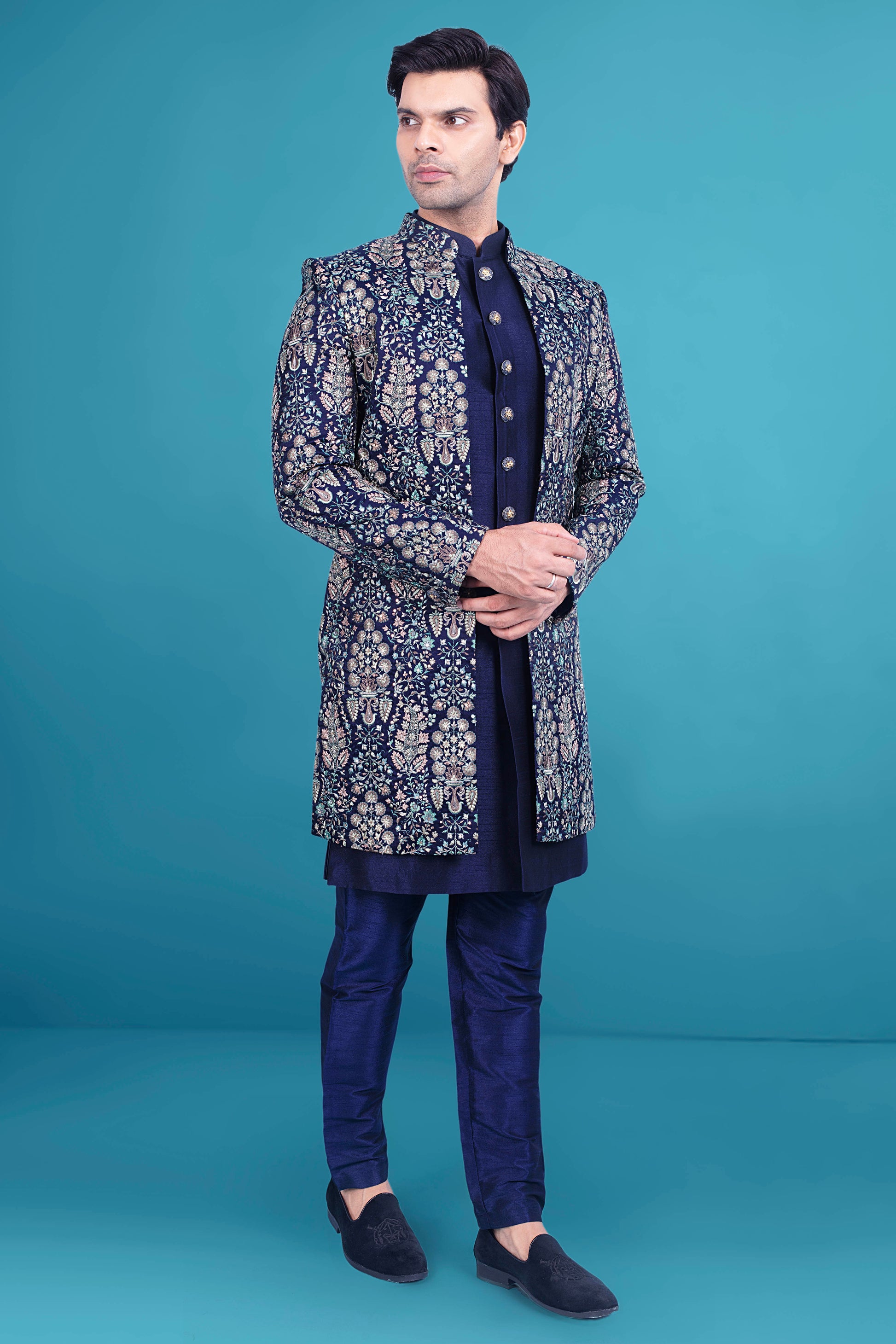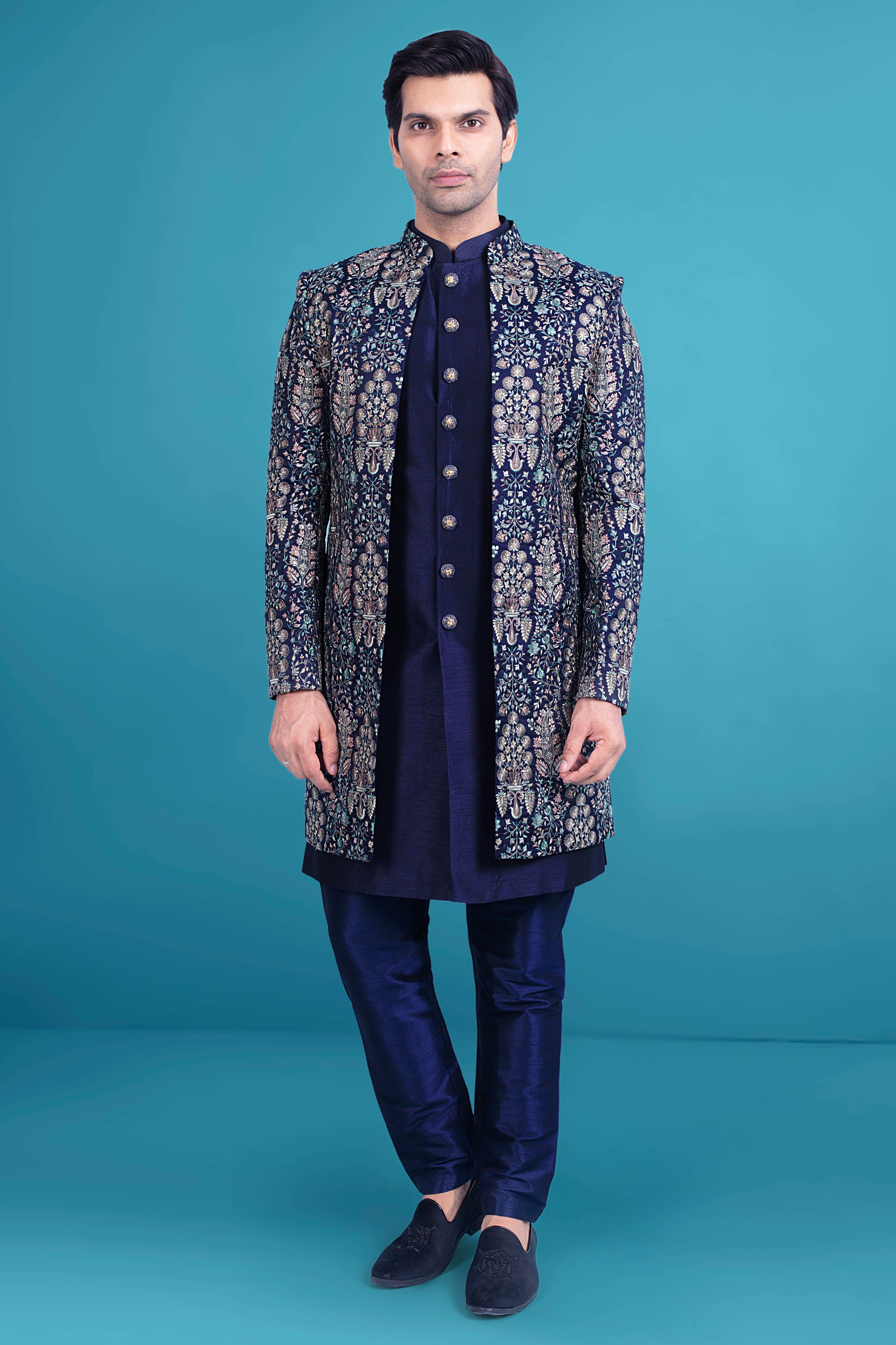 Expertly crafted with intricate thread and sequence work, this Mens Sherwani V26-S9 is a must-have for any formal occasion. The open jacket design adds a touch of sophistication, making it a versatile and stylish addition to your wardrobe. Make a statement with this traditional yet contemporary piece.