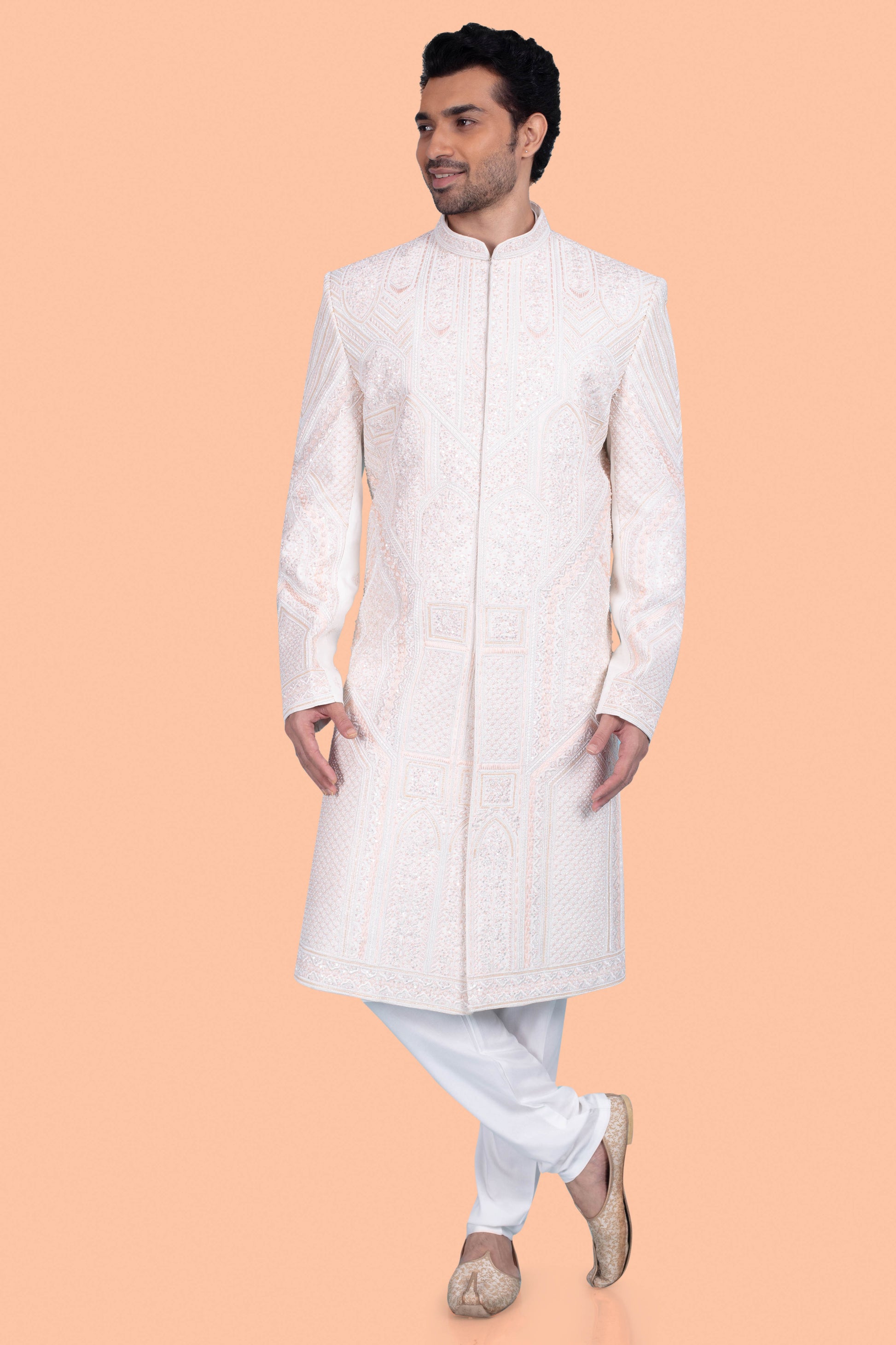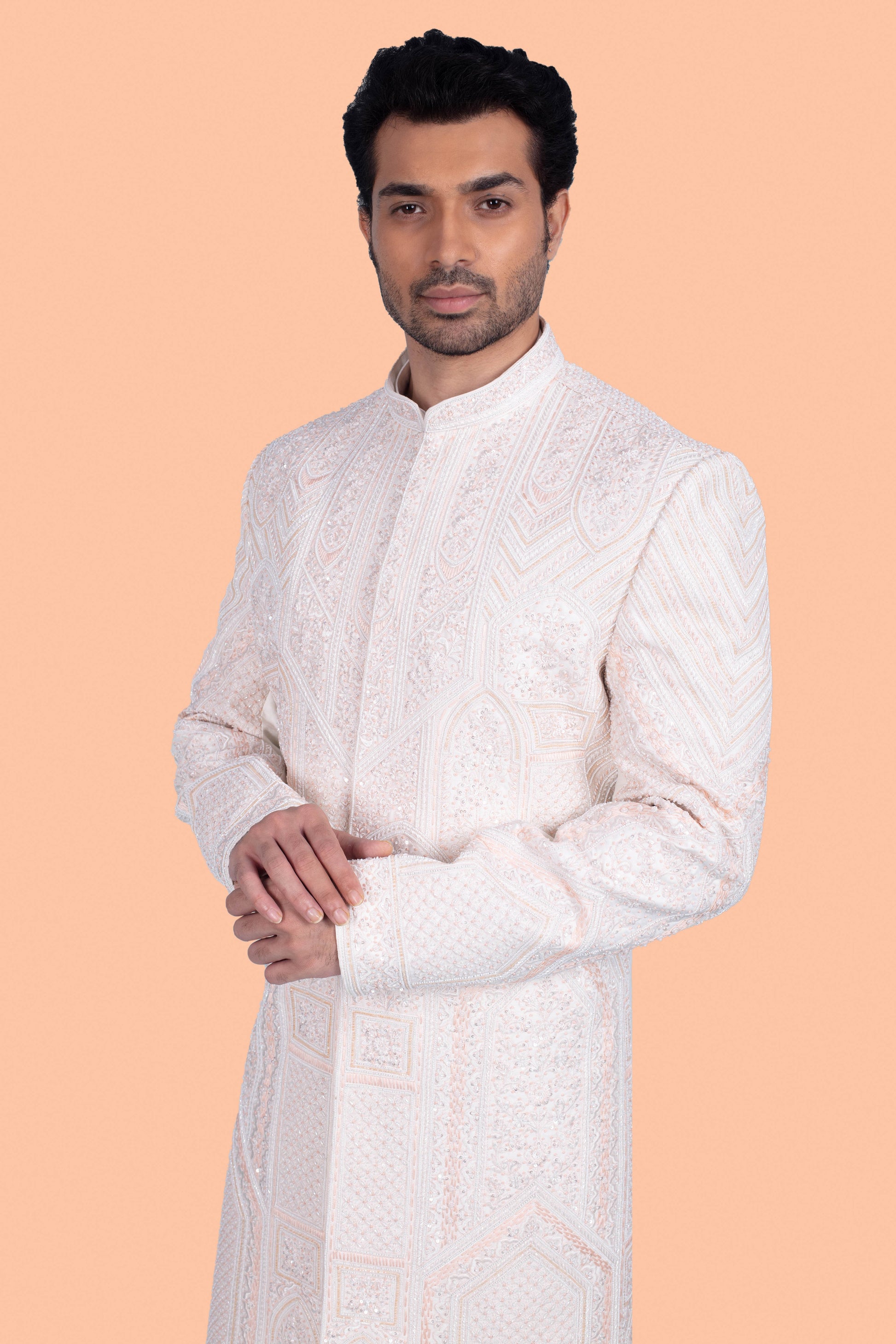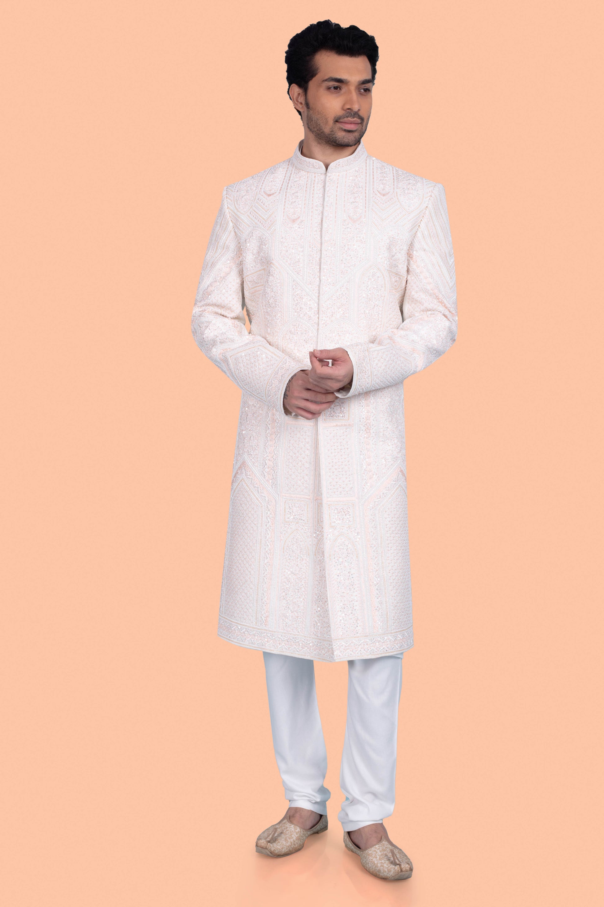Experience the unique craftsmanship of our Sherwani S86-S8, adorned with intricate thread work, cutdana, and beads. These delicate details elevate the design, exuding a sense of elegance and sophistication. Stand out at any event with this stunning piece, handcrafted with expert skill.