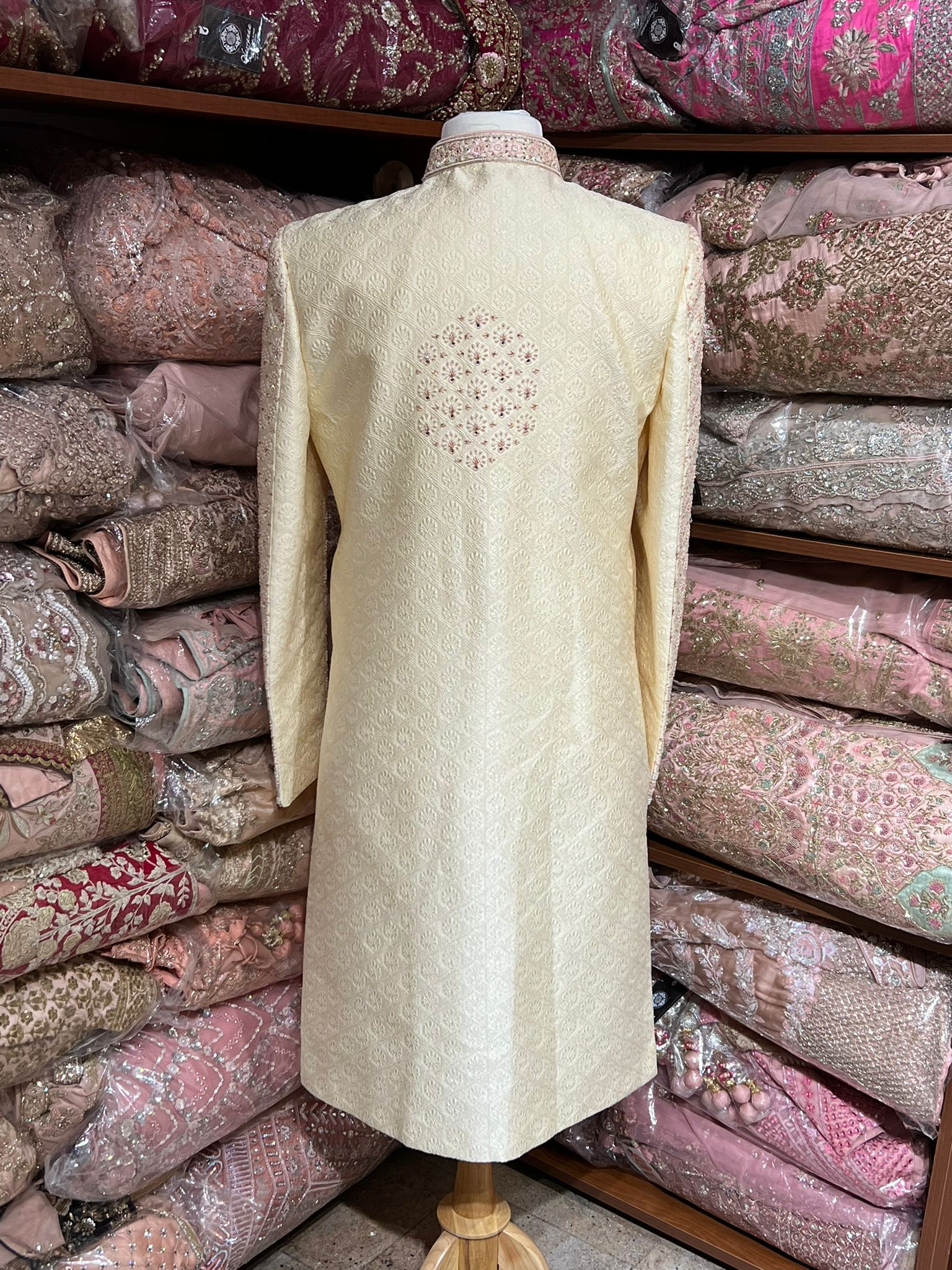 • Cream embraced and embellished in floral embroidery with sequins,gold zari, mirand thread on the silk fabric, while the collar is enriched in resham thread, stone and pearl precisely embroidered.Comes with matching bottoms.