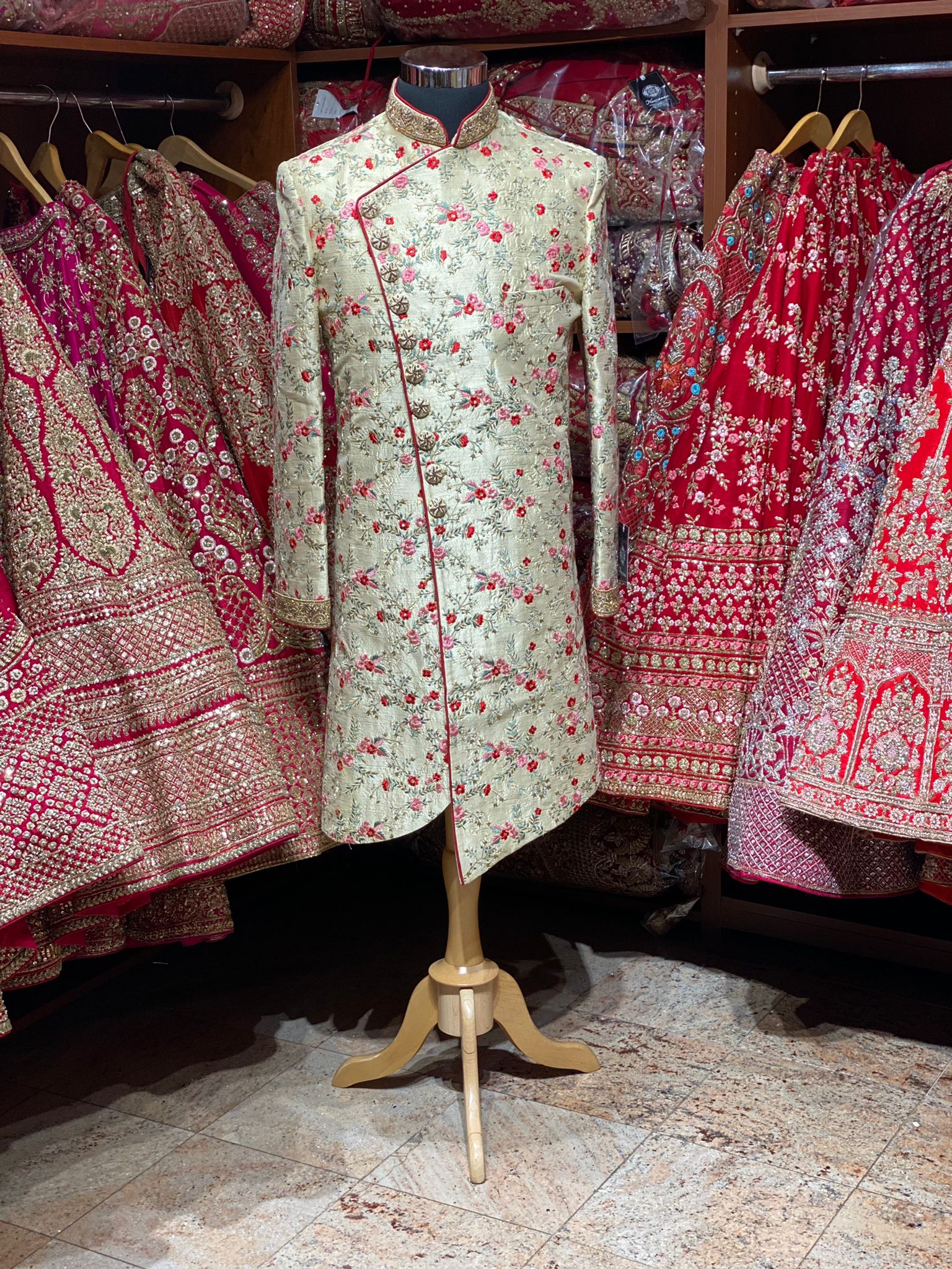 Cream gold suit includes a featuring stand-up collar with cross-over styled button closure, multicolor resham thread with pearl and cut dana Sherwani.Available with matching chudidar.